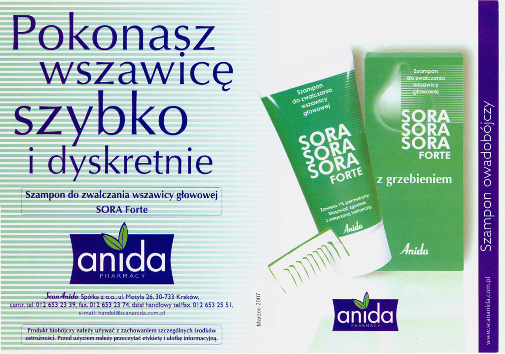 Szampon do zwalczania wszawicy głowowej SORA Forte ~'da ani ~ Sp.ółka z O.Q., ul. Motyla 26.30-733 Kraków, eentr.tel. O11 653 23 39, fax. O12 653 23 74. dział handlowy tellfax. 012 653 25 5 I. e-mafl: [email protected] Produkt biobójczy należy używać z zachowaniem szczególnych środków ostrożności. Przed użyciem należy przeczytać etykietę i ulotkę informacyjną. WSZAWICA - POWSZECHNE ZAGROŻENIE Wszawica głowowa to dość rozpowszechniona choroba wynikająca z obecności we włosach na głowie drobnych, bezskrzydłych owadów o długości ok. 2-3 mm. Wszy odżywiają się krwią nakłuwając i raniąc skórę, co może prowadzić do podrażnień i zakażeń. Pierwszym objawem może być swędzenie skóry na głowie. O obecności pasożytów mogą świadczyć liczne grudki, bąble, ślady zadrapań i strupy, zwłaszcza w okolicach skroni, potylicy, karku i za uszami. WSZAWICA U DZIECI Wszawica jest chorobą zakaźną atakującą przede wszystkim dzieci, ale może się również rozprzestrzeniać na dorosłych domowników. Owady przenoszą się z żywiciela na żywiciela podczas bezpośredniego kontaktu (np. w czasie zabawy) oraz w wyniku używania wspólnych grzebieni, szczotek i ręczników, a także za pośrednictwem szatni, w których przechowuje się wspólne czapki, szaliki i odzież. Najczęściej dzieci zarażają się w szkole, na obozach i koloniach, przy czym zarażeniu pasożytami ulegają również osoby bardzo dbające o czystość i higienę. SKUTECZNE ANTIDOTUM Skutecznym i nowoczesnym środkiem do zwalczania wszawicy głowowej u ludzi (w tym dzieci powyżej 3-go roku życia) jest szampon owadobójczy SORA fORTE. SORA fORTE wykazuje dużą skuteczność niszczenia wszy w każdej fazie rozwojowej. ROZPOZNAWANIE Najważniejszą metodą rozpoznawania choroby jest bezpośrednia obserwacja owłosionej skóry głowy, na której można zauważyć pełzające albo silnie przyczepione haczykowatymi nogami owady dorosłe lub przylepione do włosa jaja (pełne jaja są brązowe, a puste osłonki są białe). SPOSÓB UŻYCIA Przed użyciem kilkakrotnie wstrząsnąć opakowaniem. Nałożyć szampon na uprzednio zmoczone włosy i równomiernie rozprowadzić (również za uszami i z tyłu głowy). Wcierać delikatnie do czasu uzyskania obfitej piany. Pozostawić na około 10 minut. Spłukać włosy wodą i starannie wyczesać załączonym grzebieniem. SORA FORTE szampon do zwalczania wszawicy głowowej - poj. 50 mi WSPIERANIE DZIAŁANIA· SORA FORTE Aby uniknąć wtórnego zakażenia w wyniku kontaktu z przedmiotami, na których mogą znajdować się owady należy wyprać odzież, pościel oraz starannie oczycić meble i otoczenie. Grzebienie, szczotki i ozdoby do włosów dokładnie umyć, a jeśli jest taka możliwość wyparzyć. Dla podniesienia skuteczności akcji zwalczania wszawicy zaleca się powtórzenie zabiegu po 710 dniach. W uzasadnionych przypadkach szampon SORA fORTE należy zastosować u wszystkich domowników. Opakowanie o pojemności 50 mi wystarczy dla kuracji 3 osób.