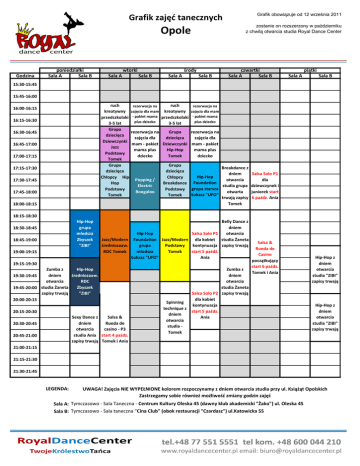 Grafik obowiązuje od 12 września 2011 Grafik zajęd tanecznych zostanie on rozszerzony w pażdzierniku z chwilą otwarcia studia Royal Dance Center Opole Godzina poniedziałki Sala A Sala B wtorki Sala A środy Sala B Sala A Sala B czwartki Sala A Sala B piątki Sala A Sala B 15:30-15:45 15:45-16:00 ruch ruch rezerwacja na rezerwacja na kreatywny zajęcia dla mam kreatywny zajęcia dla mam przedszkolaki - pakiet mama przedszkolaki - pakiet mama plus dziecko plus dziecko 3-5 lat 3-5 lat Grupa rezerwacja na Grupa rezerwacja na dziecięca zajęcia dla dziecięca zajęcia dla Dziewczynki mam - pakiet Dziewczynki mam - pakiet Jazz mama plus Hip-Hop mama plus Podstawy dziecko Tomek dziecko Tomek Grupa Grupa Breakdance z dziecięca dziecięca dniem Hip-Hop Chłopcy HipChłopcy Popping / otwarcia Hop Breakdance Foundation Electric studia grupa Podstawy Podstawy grupa starsza Boogaloo otwarta Łukasz "UFO" Tomek Tomek trwają zapisy Tomek 16:00-16:15 16:15-16:30 16:30-16:45 16:45-17:00 17:00-17:15 17:15-17:30 17:30-17:45 17:45-18:00 18:00-18:15 Salsa Solo P1 dla dziewczynek i juniorek start 6 paźdz. Ania 18:15-18:30 Hip-Hop grupa młodsza Zbyszek "ZIBI" 18:30-18:45 18:45-19:00 19:00-19:15 Belly Dance z dniem Hip-Hop Salsa Solo P1 otwarcia Jazz/Modern Foundation Jazz/Modern dla kobiet studia Żaneta średniozaaw. grupa Podstawy kontynuacja zapisy trwają RDC Tomek młodsza Tomek start 5 paźdź. Łukasz "UFO" Ania 19:15-19:30 Zumba z Hip-Hop dniem średniozaaw. otwarcia RDC Zbyszek 19:45-20:00 studia Żaneta zapisy trwają "ZIBI" 20:00-20:15 19:30-19:45 20:15-20:30 Sexy Dance z Salsa & dniem Rueda de otwarcia casino - P3 studia Ania start 4 paźdz. zapisy trwają Tomek i Ania 20:30-20:45 20:45-21:00 Spinning technique z dniem otwarcia studia Tomek Zumba z dniem otwarcia studia Żaneta Salsa Solo P2 zapisy trwają dla kobiet kontynuacja start 5 paźdz. Ania Salsa & Rueda de Casino początkujący start 6 paźdz. Tomek i Ania Hip-Hop z dniem otwarcia studia "ZIBI" zapisy trwają Hip-Hop z dniem otwarcia studia "ZIBI" zapisy trwają 21:00-21:15 21:15-21:30 21:30-21:45 LEGENDA: UWAGA! Zajęcia NIE WYPEŁNIONE kolorem rozpoczynamy z dniem otwarcia studia przy ul. Książąt Opolskich Zastrzegamy sobie również możliwośd zmiany godzin zajęd Sala A: Tymczasowo - Sala Taneczna - Centrum Kultury Oleska 45 (dawny klub akademicki "Żako") ul. Oleska 45 Sala B: Tymczasowo - Sala taneczna "Cina Club" (obok restauracji "Czardasz") ul.Katowicka 55
