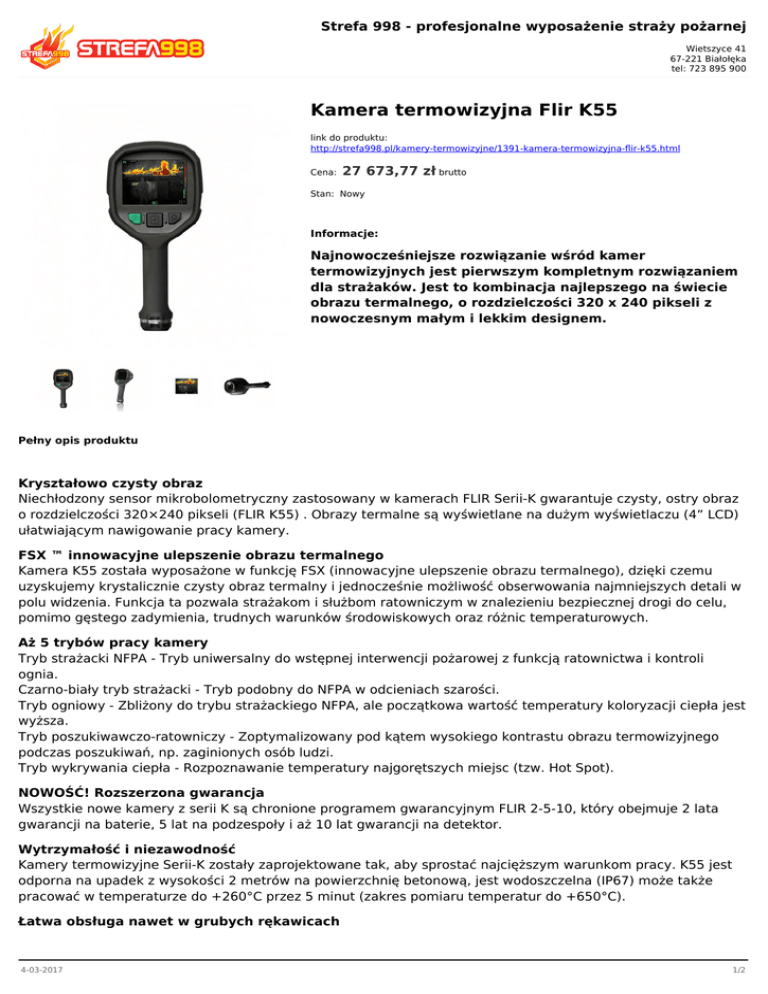 Strefa 998 - profesjonalne wyposażenie straży pożarnej Wietszyce 41 67-221 Białołęka tel: 723 895 900 Kamera termowizyjna Flir K55 link do produktu: http://strefa998.pl/kamery-termowizyjne/1391-kamera-termowizyjna-flir-k55.html Cena: 27 673,77 zł brutto Stan: Nowy Informacje: Najnowocześniejsze rozwiązanie wśród kamer termowizyjnych jest pierwszym kompletnym rozwiązaniem dla strażaków. Jest to kombinacja najlepszego na świecie obrazu termalnego, o rozdzielczości 320 x 240 pikseli z nowoczesnym małym i lekkim designem. Pełny opis produktu Kryształowo czysty obraz Niechłodzony sensor mikrobolometryczny zastosowany w kamerach FLIR Serii-K gwarantuje czysty, ostry obraz o rozdzielczości 320×240 pikseli (FLIR K55) . Obrazy termalne są wyświetlane na dużym wyświetlaczu (4” LCD) ułatwiającym nawigowanie pracy kamery. FSX ™ innowacyjne ulepszenie obrazu termalnego Kamera K55 została wyposażone w funkcję FSX (innowacyjne ulepszenie obrazu termalnego), dzięki czemu uzyskujemy krystalicznie czysty obraz termalny i jednocześnie możliwość obserwowania najmniejszych detali w polu widzenia. Funkcja ta pozwala strażakom i służbom ratowniczym w znalezieniu bezpiecznej drogi do celu, pomimo gęstego zadymienia, trudnych warunków środowiskowych oraz różnic temperaturowych. Aż 5 trybów pracy kamery Tryb strażacki NFPA - Tryb uniwersalny do wstępnej interwencji pożarowej z funkcją ratownictwa i kontroli ognia. Czarno-biały tryb strażacki - Tryb podobny do NFPA w odcieniach szarości. Tryb ogniowy - Zbliżony do trybu strażackiego NFPA, ale początkowa wartość temperatury koloryzacji ciepła jest wyższa. Tryb poszukiwawczo-ratowniczy - Zoptymalizowany pod kątem wysokiego kontrastu obrazu termowizyjnego podczas poszukiwań, np. zaginionych osób ludzi. Tryb wykrywania ciepła - Rozpoznawanie temperatury najgorętszych miejsc (tzw. Hot Spot). NOWOŚĆ! Rozszerzona gwarancja Wszystkie nowe kamery z serii K są chronione programem gwarancyjnym FLIR 2-5-10, który obejmuje 2 lata gwarancji na baterie, 5 lat na podzespoły i aż 10 lat gwarancji na detektor. Wytrzymałość i niezawodność Kamery termowizyjne Serii-K zostały zaprojektowane tak, aby sprostać najcięższym warunkom pracy. K55 jest odporna na upadek z wysokości 2 metrów na powierzchnię betonową, jest wodoszczelna (IP67) może także pracować w temperaturze do +260°C przez 5 minut (zakres pomiaru temperatur do +650°C). Łatwa obsługa nawet w grubych rękawicach 4-03-2017 1/2 Kamera wyposażona jest w 3 przyciski, które można łatwo wybierać przy pomocy kciuka lub palca wskazującego, nawet w założonych rękawicach. Zapis obrazów termalnych w formacie JPEG Obrazy termalne mogą być zapisywane w kamerach, a później mogą być wykorzystywane do tworzenia prostych raportów z akcji. Kamera K55 ma możliwość zapisu do 200 zdjęć w formacie JPEG, wyposażona jest także w dwyukrotny (2x) zoom cyfrowy. Nagrywanie wideo Dzięki FLIR K55 możesz nagrać do 600 minut filmu w 5 minutowych sekwencjach. Nagrywanie w sekwencjach jest ważne, gdyż podczas akcji można nagrać interesujące nas sceny, a nie jak w większości kamer kilkugodzinny film, na którym w większości widać obraz z kamery swobodnie zawieszonej na ubraniu strażaka lub też jego butów. Tworzenie prostych raportów Obrazy termiczne mogą być przechowywane w kamerach, a później mogą być wykorzystywane do tworzenia prostych raportów z akcji. Otrzymujesz kompletny i wygodny zestaw Kupując kamerę termowizyjną K55, otrzymasz wszystko co niezbędne, aby móc natychmiast skorzystać z kamery: walizka transportowa, kamera termowizyjna, oprogramowanie FLIR, kable zasilające z gniazdkami, dwie baterie, ładowarka, kabel USB, pasek, adapter do trójnogu, dokumenty w języku polskim. Jedynym dodatkiem, który nie wchodzi w skład zestawu jest ładowarka samochodowa, którą można dodatkowo dokupić. 4-03-2017 2/2