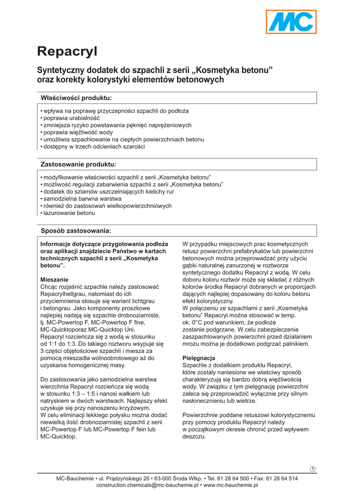 Repacryl Syntetyczny dodatek do szpachli z serii „Kosmetyka betonu” oraz korekty kolorystyki elementów betonowych Właściwości produktu: •wpływa na poprawę przyczepności szpachli do podłoża •poprawia urabialność •zmniejsza ryzyko powstawania pęknięć naprężeniowych •poprawia więźliwość wody •umożliwia szpachlowanie na ciepłych powierzchniach betonu •dostępny w trzech odcieniach szarości Zastosowanie produktu: •modyfikowanie właściwości szpachli z serii „Kosmetyka betonu” •możliwość regulacji zabarwienia szpachli z serii „Kosmetyka betonu” •dodatek do szlamów uszczelniających kielichy rur •samodzielna barwna warstwa •również do zastosowań wielkopowierzchniowych •lazurowanie betonu Sposób zastosowania: Informacje dotyczące przygotowania podłoża oraz aplikacji znajdziecie Państwo w kartach technicznych szpachli z serii „Kosmetyka betonu”. Mieszanie Chcąc rozjaśnić szpachle należy zastosować Repacrylhellgrau, natomiast do ich przyciemnienia stosuje się wariant lichtgrau i betongrau. Jako komponenty proszkowe najlepiej nadają się szpachle drobnoziarniste, tj. MC-Powertop F, MC-Powertop F fine, MC-Quicktoporaz MC-Quicktop Uni. Repacryl rozcieńcza się z wodą w stosunku od 1:1 do 1:3. Do takiego roztworu wsypuje się 3 części objętościowe szpachli i miesza za pomocą mieszadła wolnoobrotowego aż do uzyskania homogenicznej masy. Do zastosowania jako samodzielna warstwa wierzchnia Repacryl rozcieńcza się wodą w stosunku 1:3 – 1:5 i nanosi wałkiem lub natryskiem w dwóch warstwach. Najlepszy efekt uzyskuje się przy nanoszeniu krzyżowym. W celu eliminacji lekkiego połysku można dodać niewielką ilość drobnoziarnistej szpachli z serii MC-Powertop F lub MC-Powertop F fein lub MC-Quicktop. W przypadku miejscowych prac kosmetycznych retusz powierzchni prefabrykatów lub powierzchni betonowych można przeprowadzać przy użyciu gąbki naturalnej zanurzonej w roztworze syntetycznego dodatku Repacryl z wodą. W celu doboru koloru roztwór może się składać z różnych kolorów środka Repacryl dobranych w proporcjach dających najlepiej dopasowany do koloru betonu efekt kolorystyczny. W połączeniu ze szpachlami z serii „Kosmetyka betonu” Repacryl można stosować w temp. ok. 0°C pod warunkiem, że podłoże zostanie podgrzane. W celu zabezpieczenia zaszpachlowanych powierzchni przed działaniem mrozu można je dodatkowo podgrzać palnikiem. Pielęgnacja Szpachle z dodatkiem produktu Repacryl, które zostały naniesione we właściwy sposób charakteryzują się bardzo dobrą więźliwością wody. W związku z tym pielęgnację powierzchni zaleca się przeprowadzić wyłącznie przy silnym nasłonecznieniu lub wietrze. Powierzchnie poddane retuszowi kolorystycznemu przy pomocy produktu Repacryl należy w początkowym okresie chronić przed wpływem deszczu. 1 MC-Bauchemie • ul. Prądzyńskiego 20 • 63-000 Środa Wlkp. • Tel. 61 28 64 500 • Fax: 61 28 64 514 [email protected] • www.mc-bauchemie.pl Techniczne właściwości produktu Repacryl: Parametr Jednostka miary Wartość Barwa lichtgrau, hellgrau, betongrau Proporcje mieszania Części objętościowe od 1:1 do 1:5 Uwagi Repacryl: woda Właściwości produktu Repacryl: Zakładowa Kontrola Produkcji ISO 9001 Zalecane warunki podczas zastosowania ≥ + 5°C Warunki przechowywania Przechowywać w szczelnie zamkniętych opakowaniach przez okres 12 miesięcy. Chronić przed przemarzaniem i zawilgoceniem. Sposób dostawy wiadro 15 kg, 1 paleta (33 wiadra po 15 kg) wiadro 25 kg, 1 paleta (16 wiader po 25 kg) Usuwanie odpadów W trosce o środowisko naturalne opakowania należy dokładnie opróżniać. Uwaga! Wszelkie informacje zawarte w niniejszej karcie oparte są na naszym doświadczeniu i najlepszej wiedzy, jednakże nie mogą być traktowane jako prawnie wiążące. Należy bezwzględnie każdorazowo stosować się do prawodawstwa miejscowego, w zakresie przeznaczenia oraz zastosowania w obiektach budowlanych. Przy spełnieniu powyższych wymogów odpowiadamy za poprawność przekazanych informacji w ramach naszych Ogólnych Warunków Sprzedaży, Dostaw i Płatności. Wszelkie doradztwo ze strony naszych Współpracowników, odbiegające od treści naszych kart technicznych, jest wiążące jedynie w przypadku pisemnego ich potwierdzenia. W każdym przypadku należy stosować się do ogólnie obowiązujących zasad sztuki budowlanej. Wydanie 07/15-PL. Niniejszy druk został zaktualizowany pod względem technicznym. Tym samym unieważnia się dotychczasowe wydania i nie wolno ich stosować. W przypadku wydania nowej karty, zaktualizowanej pod względem technicznym, niniejsze wydanie traci ważność. MC-Bauchemie • ul. Prądzyńskiego 20 • 63-000 Środa Wlkp. • Tel. 61 28 64 500 • Fax: 61 28 64 514 [email protected] • www.mc-bauchemie.pl 2