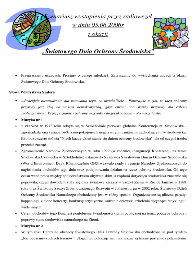 Scenariusz wystąpienia przez radiowęzeł w dniu 05.06.2006r z okazji „Światowego Dnia Ochrony Środowiska” • Przepraszamy uczących. Prosimy o uwagę młodzieŜ. Zapraszamy do wysłuchania audycji z okazji Światowego Dnia Ochrony Środowiska. Słowa Władysława Szafera • ...Pracujcie niestrudzenie dla ratowania tego, co ukochaliście... Pouczajcie o tym, Ŝe idea ochrony przyrody jest ideą na wskroś demokratyczną, gdyŜ chroni ona skarby przyrody dla całego społeczeństwa... Przez poznanie i ochronę przyrody - do jej ukochania - oto nasze hasło! • Muzyka nr 1 • 5 czerwca w 1972 roku odbyła się w Sztokholmie pierwsza globalna Konferencja nt. Środowiska - zgromadziła ona tysiące osób zaniepokojonych negatywnymi zmianami zachodzącymi w środowisku. Ekolodzy często mówią "Niech kaŜdy dzień stanie się dniem ochrony środowiska", ale od czegoś trzeba przecieŜ zacząć. • Zgromadzenie Narodów Zjednoczonych w roku 1972 (w rocznicę inauguracji Konferencji na temat Środowiska Człowieka w Sztokholmie) ustanowiło 5 czerwca Światowym Dniem Ochrony Środowiska (World Environment Day). Równocześnie ONZ wezwało rządy i agencje Narodów Zjednoczonych do nagłośnienia obchodów tego dnia oraz podejmowania działań na rzecz ochrony środowiska. Od tego czasu współpraca między społeczeństwem obywatelskim, a rządami dotycząca środowiska znacznie się poprawiła, czego dowodem stały się dwa światowe szczyty – Szczyt Ziemi w Rio de Janerio w 1991 roku oraz Światowy Szczyt ZrównowaŜonego Rozwoju w Johanesburgu w 2002 roku. Światowy Dzień Ochrony Środowiska Naturalnego obchodzony jest w róŜny sposób. Organizowane są uliczne parady, happeningi, zielone koncerty, konkursy artystyczne, sadzenie drzewek, szkolenia dotyczące recyklingu i wiele innych. • Celem obchodów tego Dnia jest pogłębienie świadomości opinii publicznej na temat potrzeby ochrony i poprawy stanu środowiska naturalnego na Ziemi. • Muzyka nr 2 • W tym roku Centralne obchody Światowego Dnia Ochrony Środowiska obchodzone są pod tytułem „Nie opuścimy suchych terenów”. Slogan ten pokazuje nam jak waŜne są tereny pustynne i półpustynne na Świecie. Tereny suche zajmują ponad 40 % naszej Ziemi. Ekosystem ten jest domem dla 1/3 ludzi Ŝyjących na naszym Globie. • W naszym kraju mamy pustynię Błędowską. Rozciąga się ona od Dąbrowy Górniczej - Błędowa na zachodzie do gminy Klucze na wschodzie. Granicą północną pustyni jest wieś Chechło, a na południu graniczy z duŜym obszarem leśnym. Długość pustyni wynosi niecałe 10 km, a szerokość do 4 km. • Dawniej zdarzało się tu zjawisko fatamorgany, obecnie pustynia zanika, porastana coraz bardziej przez sucholubne zarośla i lasy iglaste. Jest to atrakcyjny teren pieszych wędrówek. Z ciekawostek naleŜy wymienić, Ŝe w czasie II wojny światowej pustynia słuŜyła jako poligon niemieckiej Afrika Korps • A oto ludowa legenda mówiąca o powstaniu pustyni: (W tle muzyka nr 4) • Sięgając kilka wieków wstecz.…… nad Błędowem w kierunku Olkusza, leciał diabełek z workiem piasku chcąc zakopać olkuską fabrykę srebra. Pech diabła chciał, Ŝe wór był tak cięŜki, iŜ zawadził on o wieŜę kościoła w Błędowie, rozsypując piasek. Tak powstała Pustynia Błędowska. Legenda głosi równieŜ, Ŝe samego diabełka - diabli wysłali do czorta i ponoć do dzisiejszego dnia ukrywa się w tych okolicach. Najczęściej ludzie widzieli go we wsi Chechło stąd pewnie nazwali go Hehelkiem. • Zachęcamy do bliŜszego zapoznania się z tą jedyną pustynią występującą w Europie. Wiadomości moŜna znaleźć na naszej stronie gimnazjum. • Jak więc wszyscy zauwaŜyli my jako Polacy teŜ musimy dbać o ten teren. • W myśl słów Ojca Świętego Jana Pawła II „Niech Nasza Ziemia będzie wspólna. Niech nasza modlitwa będzie pokorna. Niech nasza miłość będzie potęŜna. Niech nasza nadzieja będzie większa od wszystkiego, co się tej nadziei moŜe przeciwstawić.” Ochrońmy naszą Planetę. • Dziękujemy za poświęconą uwagę Opracowane przez: mgr Wiesławę Wiatrak