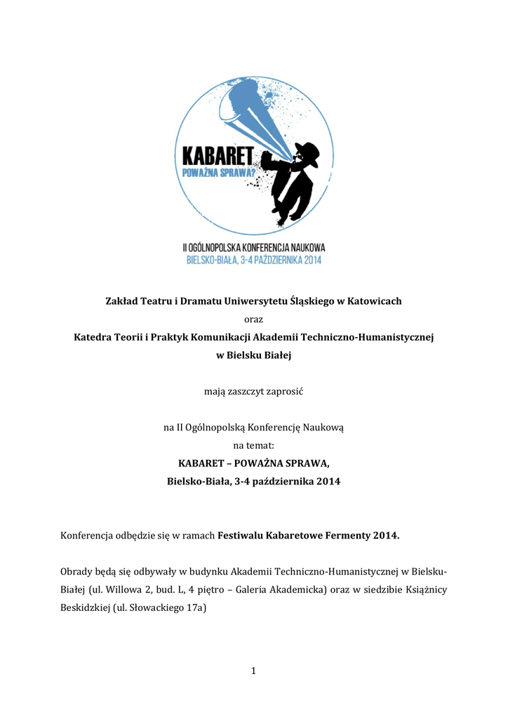Zakład Teatru i Dramatu Uniwersytetu Śląskiego w Katowicach oraz Katedra Teorii i Praktyk Komunikacji Akademii Techniczno-Humanistycznej w Bielsku Białej mają zaszczyt zaprosić na II Ogólnopolską Konferencję Naukową na temat: KABARET – POWAŻNA SPRAWA, Bielsko-Biała, 3-4 października 2014 Konferencja odbędzie się w ramach Festiwalu Kabaretowe Fermenty 2014. Obrady będą się odbywały w budynku Akademii Techniczno-Humanistycznej w BielskuBiałej (ul. Willowa 2, bud. L, 4 piętro – Galeria Akademicka) oraz w siedzibie Książnicy Beskidzkiej (ul. Słowackiego 17a) 1 PROGRAM 3 października (piątek) 15.00 Akademia Techniczno-Humanistyczna (Galeria Akademicka, bud. L, IV p.) – rozpoczęcie konferencji 15.15-17.30 Akademia Techniczno-Humanistyczna (Galeria Akademicka, bud. L, IV p.) I PANEL „Teraz skupcie się psubraty, bo ważniejsze padną daty” Historyczne reminiscencje: jak to drzewiej bywało 1. prof. zw. dr hab. Anna Kuligowska-Korzeniewska, Akademia Teatralna w Warszawie: „Kabarety w »złym mieście« podczas I wojny światowej” 2. prof. zw. dr hab. Jan Ciechowicz, Uniwersytet Gdański: „Kabaret a początki teatru studenckiego w PRL – sekwencja gdańska” 3. dr Alicja Badetko: „Od Radiowej Czelodki do Masztalskich – czyli kabaret w Polskim Radio Katowice” 4. dr Dorota Fox, Uniwersytet Śląski: „Persona non grata, konferansjerzy w polskim kabarecie” 5. Bogna M. Dominiak, Uniwersytet Kazimierza Wielkiego w Bydgoszczy: „Co jest ważniejsze – władza czy sztuka? Apolityczny Kabaret OT.TO o polityce” 18.00-20.30 Bielskie Centrum Kultury – Gala Otwarcia Fermentów 2014 wystąpią: Kabaret Svenson Band – laureat Fermentów 2013 Kabaret LIMO - z ostatnim pożegnaniem w Bielsku-Białej 4 października (sobota) 9.00-10.30 Książnica Beskidzka II PANEL „Fajny chłopak ten mój Otello” W teatrze jak w kabarecie. Kabaretowe transgresje 1. prof. zw. dr hab. Ewa Łubieniewska, Uniwersytet Pedagogiczny w Krakowie: „Cabaret Voltaire – zakopiańska Atlantyda” 2 2. dr Milan Lesiak, Uniwersytet Wrocławski: „Teatr Improkracja jako artystyczny wariant improwizacji" 3. Aneta Głowacka, Uniwersytet Śląski: „Transpozycje kabaretowe w teatrze Moniki Strzępki” 4. dr Marek Bielacki: Uniwersytet Łódzki: „Estetyka widowiska kabaretowego w Listach śpiewających Skaldów i Agnieszki Osieckiej” 10.30-10.45 – przerwa na kawę 10.45-11.45 Książnica Beskidzka III PANEL „Bo ja chciałem do logopedy…” Język i estetyka kabaretu 1. Karolina Bożek, Uniwersytet Marii Curie-Skłodowskiej w Lublinie: „Mechanizmy dowcipu językowego w tekstach kabaretu Paranienormalni” 2. Anna Iwanowska, Uniwersytet Gdański – „Co językoznawca może powiedzieć o kabarecie?” 11.45-12.00 – przerwa na kawę 12.00-13.30 Książnica Beskidzka IV PANEL „To ja, kultura, po transformacji sierota” Kabaret w przestrzeni kultury: między polityką, zabawą a marketingiem 1. dr Katarzyna Walotek-Ściańska, Uniwersytet Ekonomiczny w Katowicach: „Polskie kabarety w przestrzeni mediów społecznościowych” 2. dr Agnieszka Tarwacka, Centrum Kultury w Gdyni: „Kabareciarz – twórca w okowach, czyli kilka uwag na temat kulturotwórczej roli kabaretu w oparciu o indywidualną działalność członków Limo” 3. dr Jacek Mikołajczyk, Uniwersytet Śląski: „Podpalacze: Pożar w burdelu i powrót kabaretu politycznego” 4. dr Robert Pysz, Akademia Techniczno-Humanistyczna: „Spece od reklamy? Komunikacja autopromocyjna współczesnych polskich kabaretów” 3 15.00-16.30 Książnica Beskidzka Podsumowanie konferencji z udziałem gości: Tomasza Jachimka, Piotra Skuchy, Juliusza Wątroby oraz Franciszka Kopczaka Dyskusja uczestników konferencji oraz twórców kabaretowych 17.00-22.00 Dom Kultury im. W. Kubisz 17.00-20.30 – Konkurs Kabaretów (6 kabaretów zakwalifikowanych do konkursu); Jury: Tomasz Jachimek, Piotr Skucha; Juliusz Wątroba; Franciszek Kopczak; 20.30 – Gwiazda Wieczoru: Kabaret Czesuaf (w trakcie obrad Jury) 21.15 – uroczyste wręczenie nagród Adresy: Akademia Techniczno-Humanistyczna: Bielsko-Biała, ul. Willowa 2, bud. L, 4. piętro (Galeria Akademicka) Bielskie Centrum Kultury: Bielsko-Biała, ul. Słowackiego 27 Książnica Beskidzka: Bielsko-Biała, ul. Słowackiego 17a Dom Kultury im. W. Kubisz: Bielsko-Biała, ul. Słowackiego 17 ORGANIZATORZY KONFERENCJI: Akademia Techniczno-Humanistyczna w Bielsku-Białej, Uniwersytet Śląski w Katowicach KOMITET ORGANIZACYJNY: dr Dorota Fox, dr Jacek Mikołajczyk, dr Robert Pysz 4