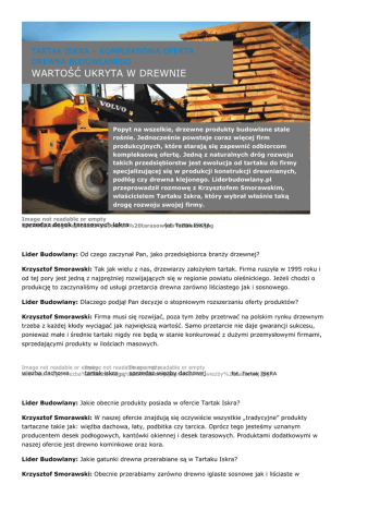 TARTAK ISKRA – KOMPLEKSOWA OFERTA DREWNA BUDOWLANEGO WARTOŚĆ UKRYTA W DREWNIE Popyt na wszelkie, drzewne produkty budowlane stale rośnie. Jednocześnie powstaje coraz więcej firm produkcyjnych, które starają się zapewnić odbiorcom kompleksową ofertę. Jedną z naturalnych dróg rozwoju takich przedsiębiorstw jest ewolucja od tartaku do firmy specjalizującej się w produkcji konstrukcji drewnianych, podłóg czy drewna klejonego. Liderbudowlany.pl przeprowadził rozmowę z Krzysztofem Smorawskim, właścicielem Tartaku Iskra, który wybrał właśnie taką drogę rozwoju swojej firmy. Image not readable or empty sprzedaz desek tarasowych iskra fot. Tartak ISKRA userfiles/image/sprzedaz%20desek%20tarasowych%20iskra.jpg Lider Budowlany: Od czego zaczynał Pan, jako przedsiębiorca branży drzewnej? Krzysztof Smorawski: Tak jak wielu z nas, drzewiarzy założyłem tartak. Firma ruszyła w 1995 roku i od tej pory jest jedną z najprężniej rozwijających się w regionie powiatu oleśnickiego. Jeżeli chodzi o produkcję to zaczynaliśmy od usługi przetarcia drewna zarówno liściastego jak i sosnowego. Lider Budowlany: Dlaczego podjął Pan decyzje o stopniowym rozszerzaniu oferty produktów? Krzysztof Smorawski: Firma musi się rozwijać, poza tym żeby przetrwać na polskim rynku drzewnym trzeba z każdej kłody wyciągać jak największą wartość. Samo przetarcie nie daje gwarancji sukcesu, ponieważ małe i średnie tartaki nigdy nie będą w stanie konkurować z dużymi przemysłowymi firmami, sprzedającymi produkty w ilościach masowych. Image not readable or empty Image not readable Image or empty not readable or empty wiezba dachowa tartak iskra sprzedaz wiezby dachowej fot. Tartak ISKRA userfiles/image/wiezba%20dachowa.jpg userfiles/image/tartak%20iskra.jpg userfiles/image/sprzedaz%20wiezby%20dachowej.jpg Lider Budowlany: Jakie obecnie produkty posiada w ofercie Tartak Iskra? Krzysztof Smorawski: W naszej ofercie znajdują się oczywiście wszystkie „tradycyjne” produkty tartaczne takie jak: więźba dachowa, łaty, podbitka czy tarcica. Oprócz tego jesteśmy uznanym producentem desek podłogowych, kantówki okiennej i desek tarasowych. Produktami dodatkowymi w naszej ofercie jest drewno kominkowe oraz kora. Lider Budowlany: Jakie gatunki drewna przerabiane są w Tartaku Iskra? Krzysztof Smorawski: Obecnie przerabiamy zarówno drewno iglaste sosnowe jak i liściaste w gatunkach: dąb, jesion, buk i olcha. Należy nadmienić, że w naszym tartaku proces przerobu drewna odbywa się od momentu zakupu surowca w polskich lasach. A dzięki zatrudnieniu wyspecjalizowanych pracowników i inwestowaniu w park maszynowy oparty na nowych technologiach możemy z tego surowca produkować wyroby o bardzo wysokiej jakości. podlogi na wymiar Image not readable or empty userfiles/image/podlogi%20na%20wymiar.jpg podlogi tartak iskra fot. Tartak ISKRA Image not readable or empty userfiles/image/podlogi%20tartak%20iskra.jpg Lider Budowlany: Czy przy zastosowaniu nowoczesnych technologii stawiacie również na zwiększenie wydajności? Krzysztof Smorawski: Oczywiście. Wraz z rosnącymi wymaganiami jakościowymi, nasi klienci wymagają od nas coraz większych dostaw. Dlatego zainwestowaliśmy w dużą ilość suszarni. Suszona jest w nich tarcica iglasta i liściasta. Duży potencjał suszarniczy stanowi bazę do produkowanych również desek podłogowych i boazerii podbitkowych oraz innych wyrobów stolarskich. Posiadamy również możliwość zabezpieczania drewna poprzez impregnację zanurzeniową. producent deski tarasowej Image not readable or empty userfiles/image/producent%20deski%20tarasowej.jpg deski na taras fot. Tartak ISKRA Image not readable or empty userfiles/image/deski%20na%20taras.jpg Lider Budowlany: Kim jest typowy klient Tartaku Iskra? Krzysztof Smorawski: Myślę, że nie możemy w naszym wypadku mówić o typowym kliencie. Z usług Tartaku Iskra korzystają zarówno firmy z regionu jak i z zagranicy. Współpracujemy z developerami i firmami budowlanymi, ale jednocześnie obsługujemy również klientów indywidualnych. Staramy się być jak najbardziej elastyczni i dopasowywać się do potrzeb naszych klientów. Lider Budowlany: Gdzie można znaleźć szczegółowe informacje na temat Państw oferty? Krzysztof Smorawski: Zapraszam wszystkich zainteresowanych na naszą stronę internetową: www.tartak-iskra.pl Można tam znaleźć opisy i specyfikacje techniczne wszystkich naszych produktów. Lider Budowlany: Dziękuję za rozmowę.
