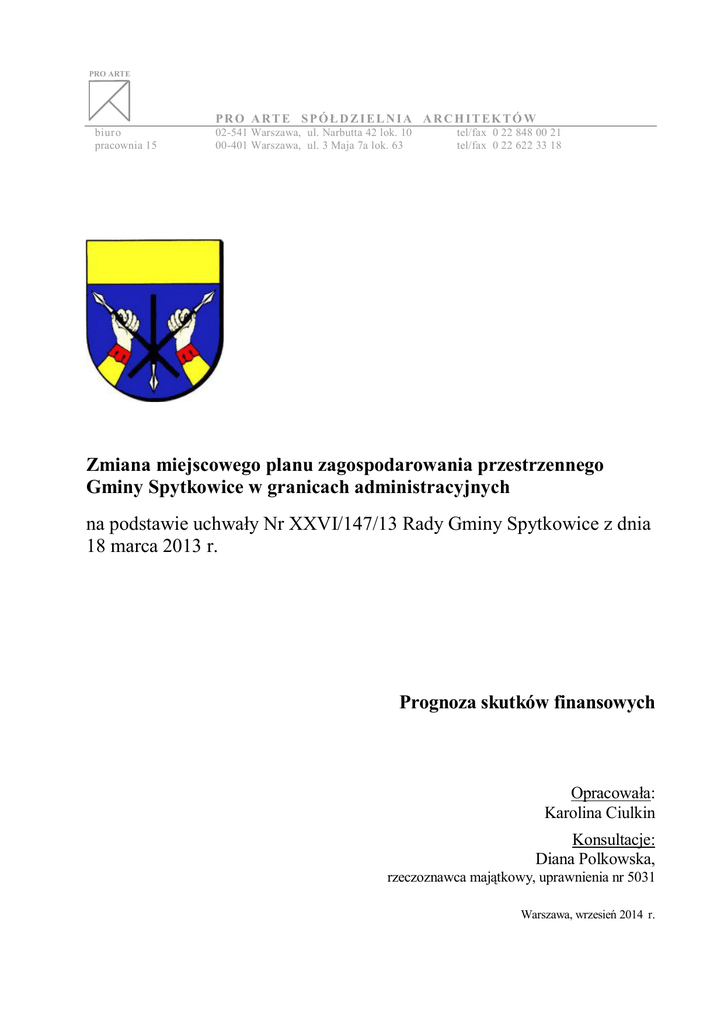 PRO ARTE PRO ARTE SPÓŁDZIELNIA ARCH ITEK TÓ W biuro pracownia 15 02-541 Warszawa, ul. Narbutta 42 lok. 10 00-401 Warszawa, ul. 3 Maja 7a lok. 63 tel/fax 0 22 848 00 21 tel/fax 0 22 622 33 18 Zmiana miejscowego planu zagospodarowania przestrzennego Gminy Spytkowice w granicach administracyjnych na podstawie uchwały Nr XXVI/147/13 Rady Gminy Spytkowice z dnia 18 marca 2013 r. Prognoza skutków finansowych Opracowała: Karolina Ciulkin Konsultacje: Diana Polkowska, rzeczoznawca majątkowy, uprawnienia nr 5031 Warszawa, wrzesień 2014 r. Spis treści 1. 2. 3. 4. 5. 6. 7. 2 Cel, zakres i podstawy formalno-prawne ......................................................................................................... 3 Charakterystyka lokalnego rynku nieruchomości............................................................................................. 4 Źródła danych przyjętych do sporządzenia prognozy....................................................................................... 4 Prognoza wpływu ustaleń planu na wydatki gminy.......................................................................................... 4 Prognoza wpływu ustaleń planu miejscowego na dochody gminy .................................................................... 5 Zestawienie końcowe...................................................................................................................................... 5 Wnioski.......................................................................................................................................................... 5 1. Cel, zakres i podstawy formalno-prawne Rada Gminy Spytkowice podjęła uchwałę Nr XXVI/147/13 z dnia 18 marca 2013 r. w sprawie przystąpienia do sporządzenia zmiany miejscowego planu zagospodarowania przestrzennego Gminy Spytkowice w granicach administracyjnych gminy. Projekt miejscowego planu zagospodarowania przestrzennego został sporządzony przez PRO ARTE Spółdzielnię Architektów – pracownię 15 na podstawie umowy podpisanej z Gminą Spytkowice. Cel opracowania Podane w prognozie dane mają charakter szacunkowy i służą wyłączne do określenia prawdopodobnych wielkości finansowych związanych z realizacją planu i ewentualnymi zyskami z tego wynikającymi. Prognoza służy wykazaniu zasadności podejmowania działań planistycznych na terenie objętym opracowaniem nowego planu. Podstawę prawną niniejszego opracowania stanowi art. 17 pkt 5 Ustawy z dnia 27 marca 2003r. o planowaniu i zagospodarowaniu przestrzennym (Dz. U. z 2012 r. poz. 647 z późn. zm.). Zakres opracowania wynika z § 11 Rozporządzenia z dnia 26 sierpnia 2003 r. Z punktu widzenia skutków finansowych dla gminy poddano analizie prognozowane zmiany wartości nieruchomości wywołane ewentualnymi zmianami w użytkowaniu nieruchomości leżących w obszarze objętym planem. Potencjalne obciążenia finansowe (wydatki), które może ponieść gmina w związku z uchwaleniem planu będą miały różny charakter i zakres oraz będą się ujawniać w różnym czasie i rozmiarze. W szczególności będą to obciążenia finansowe z tytułu: a) wykupu terenu pod realizację celów publicznych; b) kosztów budowy infrastruktury; c) kosztów obsługi procesów inwestycyjnych. d) roszczeń wynikających z ograniczenia w korzystaniu z nieruchomości (zmniejszeniu wartości nieruchomości). Potencjalne źródła dochodów (wpływy), które może uzyskać gmina w związku z uchwaleniem planu miejscowego mogą być z tytułu: a) opłat planistycznych w wysokości procentowej wielkości od wzrostu nieruchomości w wyniku uchwalenia miejscowego planu; b) opłat adiacenckich z tytułu podziału nieruchomości, podziału i scalenia nieruchomości, z tytułu uzbrojenia w infrastrukturę techniczną, budowy lub modernizacji drogi; c) dochodów z podatku od nieruchomości; zmiana podatku rolnego na podatek od nieruchomości oraz podatki od budynków wybudowanych na terenach objętych granicami planu; d) innych dochodów – min, z podatków od działalności gospodarczej, z podatków od czynności cywilno-prawnych dochody związane z obrotem nieruchomościami. Materiałem wyjściowy jest projekt zmiany miejscowego planu zagospodarowania przestrzennego Gminy Spytkowice w granicach administracyjnych gminy - tekst i rysunek projektu planu, oraz analizy użytkowania terenu i granic własności. Założenia zawarte w prognozie przyjęto opierając się na aktualnych stawkach podatkowych, typowych kosztach jednostkowych budowy infrastruktury itp. Mogą one ulegać zmianom w czasie ze względu na koniunkturę gospodarczą, inflację i inne zewnętrzne uwarunkowania, na które samorząd lokalny nie ma wpływu. Mogą też być przedmiotem rozważań w ramach wariantowych scenariuszy, najczęściej w horyzoncie 5-10 lat od uchwalenia planu. Wymaga to jednak ich zaczepienia w planowaniu budżetu i strategii gminy. Przedstawione w prognozie wyniki uzyskano za pomocą przestrzennego arkusza kalkulacyjnego, umożliwiającego w zintegrowany sposób precyzyjne i sprawne łączenie 3 obliczeń dotyczących powierzchni terenów, ich interakcji przestrzennych jak i zmiennych nieprzestrzennych. Szacunkowe wielkości podane w niniejszym opracowaniu nie mogą stanowić podstawy do wydawania decyzji podatkowych, decyzji związanych z pobieraniem opłat lub wypłacaniem odszkodowań związanych ze wzrostem lub obniżeniem wartości nieruchomości w skutek uchwalenia planu i innych roszczeń finansowych. 2. Charakterystyka lokalnego rynku nieruchomości Na podstawie analizy rynku lokalnego, dokonanego we wrześniu 2014 r., można stwierdzić, że ceny transakcyjne nieruchomości na terenie gminy Spytkowice kształtują się następująco: grunty rolne i leśne o pow. powyżej 1 ha ok. 5 000 zł/ha działki rolne i leśne o pow. do 1 ha ok. 10 000 zł/ha działki budowlane 50 zł/m2 3. Źródła danych przyjętych do sporządzenia prognozy Roczne stawki podatku od nie