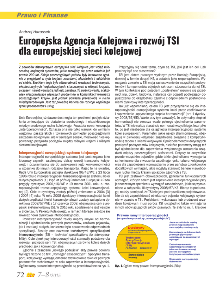 Prawo i Finanse Andrzej Harassek Europejska Agencja Kolejowa i rozwój TSI dla europejskiej sieci kolejowej Z powodów historycznych europejska sieć kolejowa jest wciąż mieszaniną krajowych systemów, jakie rozwijały się przez ostatnie już prawie 200 lat. Koleje poszczególnych państw były budowane zgodnie z przyjętymi w tych krajach zasadami, niezależnie i oddzielnie od siebie. Skutkiem tego była różnorodność rozwiązań technicznych, eksploatacyjnych i organizacyjnych, stosowanych w różnych krajach, a czasem nawet wewnątrz jednego państwa. To zróżnicowanie, aczkolwiek niesprawiające większych problemów w komunikacji wewnątrz poszczególnych krajów, jest jednak poważną przeszkodą w ruchu międzynarodowym. Jest też poważną barierą dla rozwoju wspólnego rynku producentów i usług. Unia Europejska już dawno dostrzegła ten problem i podjęła działania zmierzające do ułatwienia swobodnego i niezakłóconego międzynarodowego ruchu kolejowego. Powstała nowa koncepcja „interoperacyjności”. Oznacza ona nie tylko warunki do wymiany wagonów pasażerskich i towarowych pomiędzy poszczególnymi zarządami kolejowymi, ale w szerszym sensie, możliwość nieskrępowanego przejazdu pociągów między różnymi krajami i różnymi sieciami kolejowymi. Interperacyjność europejskiego systemu kolejowego Interoperacyjność europejskiego systemu jest postrzegana jako kluczowy czynnik, wspierający dalszy rozwój transportu kolejowego i przyczyniający się do zwiększenia jego konkurencyjności w stosunku do innych rodzajów transportu. Mając to na uwadze, Rada Unii Europejskiej przyjęła dyrektywę 96/48/WE z 23 lipca 1996 roku o interoperacyjności transeuropejskiego systemu kolei dużych prędkości [1]. Pięć lat później Parlament Europejski i Rada przyjęły dyrektywę 2001/16/WE z 19 marca 2001 roku o interoperacyjności transeuropejskiego systemu kolei konwencjonalnej [2]. Obie te dyrektywy zostały później zmienione w 2004 [3] i 2007 [4] roku. W roku 2008 dyrektywy interoperacyjności kolei dużych prędkości i kolei konwencjonalnych zostały zastąpione dyrektywą 2008/57/WE z 17 czerwca 2008, obejmującą cały europejski system kolejowy [5]. W 2016 roku spodziewane jest wejście w życie tzw. IV Pakietu Kolejowego, w ramach którego znajdzie się również nowa dyrektywa interoperacyjności. Ponieważ interoperacyjność zależy między innymi od harmonizacji i ujednolicenia pewnych parametrów, zarówno pojazdów, jak i instalacji stałych, konieczne było opracowanie odpowiednich specyfikacji. Zostały one nazwane technicznymi specyfikacjami interoperacyjności (TSI – technical specifications for interoperability). Obie dyrektywy interoperacyjności stanowiły podstawę dla rozwoju i przyjęcia serii TSI, obejmujących zarówno koleje dużych prędkości, jak i konwencjonalne. Zgodnie z zasadami „nowego podejścia” akty prawne powinny być ograniczone do tzw. „wymagań zasadniczych”. Specyfika transportu kolejowego wymaga jednakże zdefiniowania również pewnych parametrów technicznych w celu zapewnienia interoperacyjności. Ogólne ramy prawne interoperacyjności są przedstawione na rys. 1. 72 7–8 /2015 Przyjrzyjmy się teraz temu, czym są TSI, jaki jest ich cel i jak powinny być one stosowane? TSI jest aktem prawnym wydanym przez Komisję Europejską, dawniej w formie decyzji KE, a ostatnio jako rozporządzenie. Wymagania zawarte w TSI mają zastosowanie do wszystkich podsystemów i komponentów objętych zakresem stosowania danej TSI. W tym kontekście pod pojęciem „podsystem” rozumie się przedmiot (np. obiekt, budowla, instalacja czy pojazd) podlegający dopuszczeniu do eksploatacji zgodnie z odpowiednimi postanowieniami dyrektywy interoperacyjności. Jak już wspomniano, celem TSI jest przyczynienie się do interoperacyjności europejskiego systemu kolei przez zdefiniowanie i zapewnienie „optymalnego stopnia harmonizacji” (art. 1 dyrektywy 2008/57/KE). Warto przy tym zauważyć, że optymalny stopień harmonizacji nie oznacza wcale pełnego ujednolicenia parametrów. W TSI nie należy starać się normować wszystkiego, lecz tylko to, co jest niezbędne dla osiągnięcia interoperacyjności systemu kolei europejskich. Parametry, jakie należy zharmonizować, obejmują w pierwszej kolejności zagadnienia związane z kompatybilnością taboru z liniami kolejowymi. Oprócz elementów dotyczących powiązań podsystemów kolejowych, niektóre parametry mogą też być ujednolicone dla zapewnienia wzajemnego uznawania urządzeń między poszczególnymi państwami. Dotyczy to oczywiście przede wszystkim pojazdów, gdzie takie ujednolicone wymagania są konieczne dla stworzenia wspólnego rynku taboru kolejowego oraz dla zapobieżenia wprowadzaniu przez państwa członkowskie dodatkowych wymagań, jakie mogłyby stanowić barierę w swobodnym ruchu między krajami pojazdów zgodnych z TSI. TSI jest zestawem obowiązkowych, generalnie funkcjonalnych wymagań, których celem jest zapewnienie interoperacyjności przy jednoczesnym spełnieniu wymagań zasadniczych, jakie są wymienione w załączniku III dyrektywy 2008/57/KE. Biorąc to pod uwagę, należy pamiętać, że TSI nie jest podręcznikiem projektowania. Nie da się zaprojektować obiektu czy pojazdu kolejowego wyłącznie w oparciu o TSI. Projektant i wykonawca lub producent urządzeń kolejowych musi oprócz TSI uwzględnić także wymagania innych obowiązujących aktów prawnych. Te akty to m.in. krajowe Rys. 1. Ogólne ramy prawne interoperacyjności (ERA) Prawo i Finanse przepisy techniczne dotyczące kolejnictwa, które wciąż pozostają w mocy z powodów historycznych (np. związane ze „szczególnymi przypadkami”, o czym będzie mowa dalej). Takie przepisy muszą być przez państwo członkowskie zgłoszone (notyfikowane) Komisji Europejskiej. Poza tym obowiązują inne ogólne przepisy, mające zastosowanie również do kolei, jak na przyk