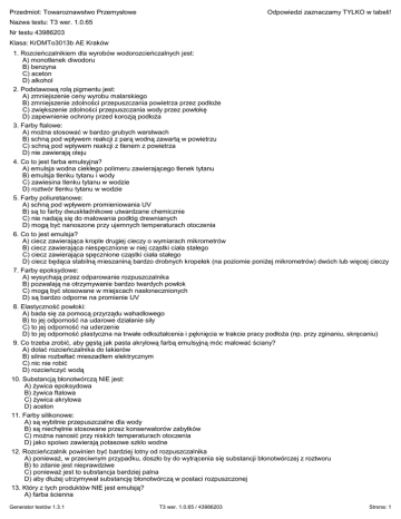 Przedmiot: Towaroznawstwo Przemysłowe Odpowiedzi zaznaczamy TYLKO w tabeli! Nazwa testu: T3 wer. 1.0.65 Nr testu 43986203 Klasa: KrDMTo3013b AE Kraków 1. Rozcieńczalnikiem dla wyrobów wodorozcieńczalnych jest: A) monotlenek diwodoru B) benzyna C) aceton D) alkohol 2. Podstawową rolą pigmentu jest: A) zmniejszenie ceny wyrobu malarskiego B) zmniejszenie zdolności przepuszczania powietrza przez podłoŜe C) zwiększenie zdolności przepuszczania wody przez powłokę D) zapewnienie ochrony przed korozją podłoŜa 3. Farby ftalowe: A) moŜna stosować w bardzo grubych warstwach B) schną pod wpływem reakcji z parą wodną zawartą w powietrzu C) schną pod wpływem reakcji z tlenem z powietrza D) nie zawierają oleju 4. Co to jest farba emulsyjna? A) emulsja wodna ciekłego polimeru zawierającego tlenek tytanu B) emulsja tlenku tytanu i wody C) zawiesina tlenku tytanu w wodzie D) roztwór tlenku tytanu w wodzie 5. Farby poliuretanowe: A) schną pod wpływem promieniowania UV B) są to farby dwuskładnikowe utwardzane chemicznie C) nie nadają się do malowania podłóg drewnianych D) mogą być nanoszone przy ujemnych temperaturach otoczenia 6. Co to jest emulsja? A) ciecz zawierająca krople drugiej cieczy o wymiarach mikrometrów B) ciecz zawierająca niespęcznione w niej cząstki ciała stałego C) ciecz zawierająca spęcznione cząstki ciała stałego D) ciecz będąca stabilną mieszaniną bardzo drobnych kropelek (na poziomie poniŜej mikrometrów) dwóch lub więcej cieczy 7. Farby epoksydowe: A) wysychają przez odparowanie rozpuszczalnika B) pozwalają na otrzymywanie bardzo twardych powłok C) mogą być stosowane w miejscach nasłonecznionych D) są bardzo odporne na promienie UV 8. Elastyczność powłoki: A) bada się za pomocą przyrządu wahadłowego B) to jej odporność na udarowe działanie siły C) to jej odporność na uderzenie D) to jej odporność plastyczna na trwałe odkształcenia i pęknięcia w trakcie pracy podłoŜa (np. przy zginaniu, skręcaniu) 9. Co trzeba zrobić, aby gęstą jak pasta akrylową farbą emulsyjną móc malować ściany? A) dolać rozcieńczalnika do lakierów B) silnie rozbełtać mieszadłem elektrycznym C) nic nie robić D) rozcieńczyć wodą 10. Substancją błonotwórczą NIE jest: A) Ŝywica epoksydowa B) Ŝywica ftalowa C) Ŝywica akrylowa D) aceton 11. Farby silikonowe: A) są wybitnie przepuszczalne dla wody B) są niechętnie stosowane przez konserwatorów zabytków C) moŜna nanosić przy niskich temperaturach otoczenia D) jako spoiwo zawierają potasowe szkło wodne 12. Rozcieńczalnik powinien być bardziej lotny od rozpuszczalnika A) poniewaŜ, w przeciwnym przypadku, doszło by do wytrącenia się substancji błonotwórczej z roztworu B) to zdanie jest nieprawdziwe C) poniewaŜ jest to substancja bardziej palna D) aby dłuŜej utrzymywał substancję błonotwórczą w postaci rozpuszczonej 13. Który z tych produktów NIE jest emulsją? A) farba ścienna Generator testów 1.3.1 T3 wer. 1.0.65 / 43986203 Strona: 1 B) paliwo samochodowe C) lakier D) mleko 14. Tiksotropia to: A) wykazywanie jednakowych właściwości bez względu na kierunek, w którym dana właściwość jest rozpatrywana B) zjawisko fizyczne polegające na tymczasowym przejściu Ŝelu w zol pod wpływem oddziaływania mechanicznego, zwykle pod wpływem wymuszania płynięcia lub mieszania C) właściwość płynów i plastycznych ciał stałych charakteryzująca ich opór wewnętrzny przeciw płynięciu; inaczej: tarcie wewnętrzne D) wykazywanie odmiennych właściwości w zaleŜności od kierunku, w którym dana właściwość jest rozpatrywana 15. Schnięcie fizyczne powłok: A) polega na odparowaniu rozpuszczalnika z lakieru lub wody z emulsji B) zachodzi jedynie w atmosferze gazu obojętnego np. azotu C) polega na odparowaniu rozcieńczalnika D) polega na odsączeniu wody z wyrobu malarskiego 16. Rozpuszczalnik to: A) niejednorodna mieszanina dwu substancji, z których przynajmniej jedna jest cieczą B) ciecz, w której substancja błonotwórcza jest rozpuszczana bez zmiany właściwosci chemicznych C) nierozdzielająca się w długich okresach czasu mieszanina dwóch lub więcej związków chemicznych D) substancja odpowiedzialna za barwę wyrobu malarskiego 17. Farby silikatowe (krzemianowe): A) produkuje się na bazie olejów schnących i terpentyny B) stanowią wodną dyspersję piasku krzemowego C) zawierają polimery krzemoorganiczne D) są to farby, w których spoiwem jest szkło wodne 18. Oznaczanie zawartości substancji błonotwórczych A) polega na wytworzeniu powłoki i następnym jej zwaŜeniu B) polega na obliczeniu - odjęciu od 100% sumy (uprzednio oznaczonych) zawartości pozostałych składników wyrobu C) przeprowadza się na spoiwomierzu D) jest niemoŜliwe do przeprowadzenia, ze względu na budowę wyrobu malarskiego 19. Farby dyspersyjne: A) są nieprzepuszczalne dla pary wodnej B) są nieprzepuszczalne dla gazów C) ze względu na rodzaj uŜytego do ich produkcji rozpuszczalnika nie nadają się do wymalowań wewnątrz pomieszczeń mieszkalnych D) są to farby, w których spoiwa są trwałymi zawiesinami cząsteczek polimeru w wodzie 20. Emalia jest to: A) wyrób pigmentowany, którego głównym składnikiem jest spoiwo lakiernicze tworzące powłokę kryjacą o wysokich walorach dekoracyjno-ochronnych B) wyrób pigmentowany z dodatkiem wypełniaczy tworzący powłokę kryjącą spełniającą głównie funkcje ochronną C) utrwalacz stosowany do zabezpieczania prac malarskich i rysunkowych naraŜonych na obsypywanie i rozmazywanie warstwy malarskiej D) surowiec przemysłowy wykorzystywany sporadycznie w postaci pokostu naturalnego z dodatkiem sykatyw 21. Jako rozpuszczalnik do farb chlorokauczukowych stosuje się: A) amoniak B) etanol C) bitumy D) węglowodory aromatyczne 22. Grindometr to: A) przyrząd do badania zachowania się ciekłego wyrobu malarskiego w polu grawitacyjnym B) inaczej mieszalnik kolorów C) przyrz