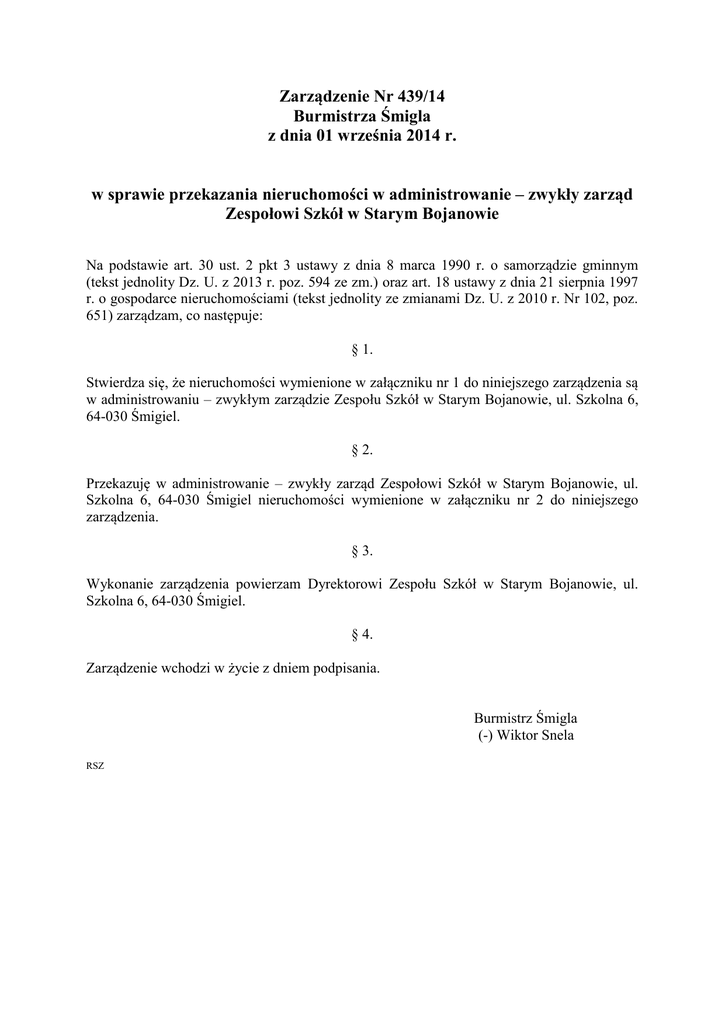 Zarządzenie Nr 439/14 Burmistrza Śmigla z dnia 01 września 2014 r. w sprawie przekazania nieruchomości w administrowanie – zwykły zarząd Zespołowi Szkół w Starym Bojanowie Na podstawie art. 30 ust. 2 pkt 3 ustawy z dnia 8 marca 1990 r. o samorządzie gminnym (tekst jednolity Dz. U. z 2013 r. poz. 594 ze zm.) oraz art. 18 ustawy z dnia 21 sierpnia 1997 r. o gospodarce nieruchomościami (tekst jednolity ze zmianami Dz. U. z 2010 r. Nr 102, poz. 651) zarządzam, co następuje: § 1. Stwierdza się, że nieruchomości wymienione w załączniku nr 1 do niniejszego zarządzenia są w administrowaniu – zwykłym zarządzie Zespołu Szkół w Starym Bojanowie, ul. Szkolna 6, 64-030 Śmigiel. § 2. Przekazuję w administrowanie – zwykły zarząd Zespołowi Szkół w Starym Bojanowie, ul. Szkolna 6, 64-030 Śmigiel nieruchomości wymienione w załączniku nr 2 do niniejszego zarządzenia. § 3. Wykonanie zarządzenia powierzam Dyrektorowi Zespołu Szkół w Starym Bojanowie, ul. Szkolna 6, 64-030 Śmigiel. § 4. Zarządzenie wchodzi w życie z dniem podpisania. Burmistrz Śmigla (-) Wiktor Snela RSZ Załącznik Nr 1 do Zarządzenia Nr 439/14 Burmistrza Śmigla z dnia 01 września 2014 r. Wykaz nieruchomości w administrowaniu – zwykłym zarządzie, zarządzanych przez Zespół Szkół w Starym Bojanowie, ul. Szkolna 6, 64-030 Śmigiel 1. Budynek szkoły wraz gruntem w Starym Bojanowie, ul. Szkolna 6 – działka o nr geod. 55 o pow. 0.1800 ha, o nr geod. 557/2 o pow. 0.0200 ha, o nr geod. 559/2 o pow. 0.0500 ha, o nr geod. 560/2 o pow. 0.0100 ha, o nr geod. 568 o pow. 0.7200 ha, zapisane KW nr PO1K/00033105/5 2. Budynek przedszkola wraz gruntem w Starym Bojanowie, ul. Główna 62 – działka o nr geod. 140/1 o pow. 0.2100 ha, zapisana KW nr PO1K/00032764/8, 3. Budynek kotłowni przy przedszkolu w Starym Bojanowie, ul. Główna 62. Burmistrz Śmigla (-) Wiktor Snela Załącznik Nr 2 do Zarządzenia Nr 439/14 Burmistrza Śmigla z dnia 01 września 2014 r. Wykaz nieruchomości przekazywanych w administrowanie – zwykły zarząd Zespołowi Szkół w Starym Bojanowie, ul. Szkolna 6, 64-030 Śmigiel 1. Część nieruchomości rolnej położonej w Bruszczewie o nr geod. 196/1, o pow. 0.2500 ha, zapisanej KW nr PO1K/00033114/1, 2. Część nieruchomości rolnej położonej w Sierpowie o nr geod. 85/2, o pow. 0.2245 ha. Burmistrz Śmigla (-) Wiktor Snela
