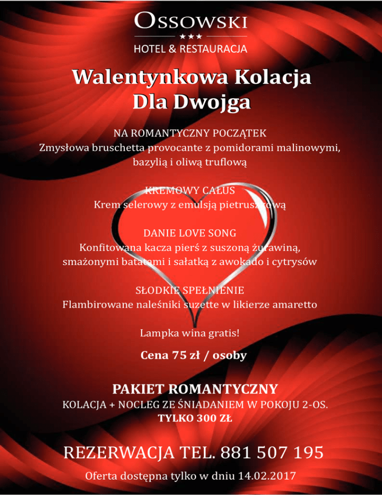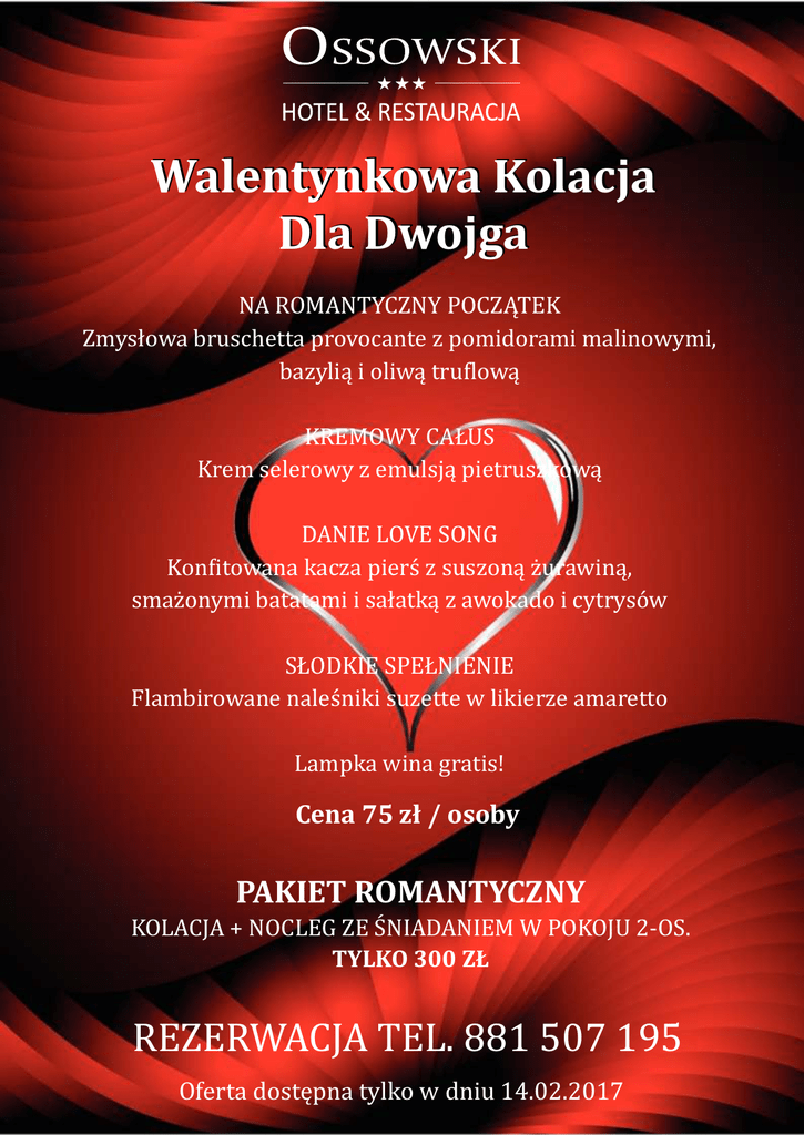 WalentynkowaKolacja DlaDwojga NAROMANTYCZNYPOCZĄTEK Zmysłowabruschettaprovocantezpomidoramimalinowymi, bazyliąioliwątru lową KREMOWYCAŁUS Kremselerowyzemulsjąpietruszkową DANIELOVESONG Kon itowanakaczapierś zsuszonąż urawiną, smaż onymibatatamiisałatkązawokadoicytrysó w SŁODKIESPEŁNIENIE Flambirowanenaleś nikisuzettewlikierzeamaretto Lampkawinagratis! Cena75zł/osoby PAKIETROMANTYCZNY KOLACJA+NOCLEGZESNIADANIEMWPOKOJU2-OS. TYLKO300ZŁ REZERWACJATEL.881507195 Ofertadostępnatylkowdniu14.02.2017