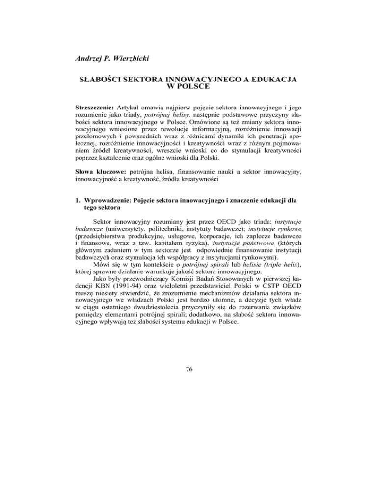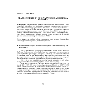 Andrzej P. Wierzbicki SŁABOŚCI SEKTORA INNOWACYJNEGO A EDUKACJA W POLSCE Streszczenie: Artykuł omawia najpierw pojęcie sektora innowacyjnego i jego rozumienie jako triady, potrójnej helisy, następnie podstawowe przyczyny słabości sektora innowacyjnego w Polsce. Omówione są też zmiany sektora innowacyjnego wniesione przez rewolucje informacyjną, rozróżnienie innowacji przełomowych i powszednich wraz z różnicami dynamiki ich penetracji społecznej, rozróżnienie innowacyjności i kreatywności wraz z różnym pojmowaniem źródeł kreatywności, wreszcie wnioski co do stymulacji kreatywności poprzez kształcenie oraz ogólne wnioski dla Polski. Słowa kluczowe: potrójna helisa, finansowanie nauki a sektor innowacyjny, innowacyjność a kreatywność, źródła kreatywności 1. Wprowadzenie: Pojęcie sektora innowacyjnego i znaczenie edukacji dla tego sektora Sektor innowacyjny rozumiany jest przez OECD jako triada: instytucje badawcze (uniwersytety, politechniki, instytuty badawcze); instytucje rynkowe (przedsiębiorstwa produkcyjne, usługowe, korporacje, ich zaplecze badawcze i finansowe, wraz z tzw. kapitałem ryzyka), instytucje państwowe (których głównym zadaniem w tym sektorze jest odpowiednie finansowanie instytucji badawczych oraz stymulacja ich współpracy z instytucjami rynkowymi). Mówi się w tym kontekście o potrójnej spirali lub helisie (triple helix), której sprawne działanie warunkuje jakość sektora innowacyjnego. Jako były przewodniczący Komisji Badań Stosowanych w pierwszej kadencji KBN (1991-94) oraz wieloletni przedstawiciel Polski w CSTP OECD muszę niestety stwierdzić, że zrozumienie mechanizmów działania sektora innowacyjnego we władzach Polski jest bardzo ułomne, a decyzje tych władz w ciągu ostatniego dwudziestolecia przyczyniły się do rozerwania związków pomiędzy elementami potrójnej spirali; dodatkowo, na słabość sektora innowacyjnego wpływają też słabości systemu edukacji w Polsce. 76 ANDRZEJ P. WIERZBICKI Słabości sektora innowacyjnego a edukacja w Polsce 2. Ogólna słabość sektora innowacyjnego w Polsce; jej przyczyny podstawowe Słabości sektora innowacyjnego w Polsce nie trzeba dokumentować; ilustruje ją szereg wskaźników, jak liczba patentów w stosunku do liczby mieszkańców, liczba doktorantów jako procent populacji w wieku 20-29 lat, nakłady na badania i rozwój jako procent PKB, itp. – zob. Kleiber et al. 2011 – powstaje więc pytanie, co jest przyczyną sprawczą tej słabości? Nie jest przy tym prawdą, że to nauka polska jest niewydajna czy nieskuteczna (jak to często sugerują międzynarodowe firmy doradcze, którym zresztą wcale nie zależy na dobrej opinii o nauce polskiej): jeśli mierzyć jej skuteczność nawet tak prymitywnymi wskaźnikami, jak stosunek przeciętnej liczby cytowań prac badaczy polskich do finansowania nauki jak procentu PKB, to nauka polska okazuje się bardzo skuteczna. Natomiast prawdą jest, że niemal nie obserwujemy wpływu polskich badań naukowych na zastosowania przemysłowo- rynkowe; jednakże, zgodnie z teorią triple helix, odpowiedzialnością za to należy obciążyć nie naukę, ale władze państwa, które nie dbają o sprawne działanie tej spirali i nie rozumieją jej uwarunkowań. Wskazuje na to zresztą bardziej wnikliwa analiza związku statystycznego pomiędzy wydatkami państwa na badania i rozwój (B&R-P), a wydatkami instytucji rynkowych i komercyjnych na te cele (B&R-K). Jeśli w tym celu wykorzystać dane np. ze wszystkich państw OECD, lub wszystkich regionów Unii Europejskiej, to zależność ta okazuje się progowa, zob. Rys. 1; można ją wprawdzie przybliżyć linią prostą i to ze współczynnikiem kilkakrotnie większym od jedności, ale dopiero po przekroczeniu pewnego progu B&R-P (ok. 0,4-0,7% PKB, zależnie od zestawu danych), poniżej którego nie obserwuje się żadnej zależności i czysto losowy charakter wydatków na B&R-K. Zależność taka jest zresztą w pełni uzasadniona racjonalnie: wydatki B&RP służą najpierw, i to w dużej mierze, finansowaniu badań podstawowych – także w dziedzinach, które bywają zaliczane do stosowanych, jak medycyna czy technika – bez których trudno mówić o jakimkolwiek rozwoju cywilizacyjnym (w tym szczególnie edukacji). Jeśli to finansowanie jest niedostateczne, poniżej pewnego progu, to uniwersytety, a nawet politechniki, ograniczają swoją działalność do finansowania badań podstawowych. Poniżej tego progu badania stosowane mają charakter marginalny i ściśle losowy. Powstaje przy tym sytuacja patologiczna: władze mogą się domagać intensyfikacji badań stosowanych, ale bezskutecznie, tymczasem pracownicy wyższych uczelni, którzy dominują zespoły opiniodawcze w nauce, znajdą sposoby (ocena wyników nauki według wskaźników cytowań itp.), aby wręcz tępić badania stosowane. 77 PROBLEMY I POGLĄDY W tej sytuacji, ostra konkurencja o dodatkowe finansowanie w formie grantów czy projektów tylko pogłębia tę patologię: badania stosowane tracą wszelkie szanse w tej konkurencji. Rysunek 1. Zależność (regresja liniowa ważona przez rozmiar PKB) pomiędzy państwowymi (B+R-P, w % PKB) a prywatnymi (komercyjnymi, B+R-K, w % PKB) wydatkami na badania i rozwój w krajach OECD, dane z 2003 roku; P – dane dla Polski 2% B+R-K %PKB 1,5% 1% 0,5% % P 0.5% % 1% 1.5% % Sytuacja taka utrzymuje się od 1991 roku, kiedy to ówczesny minister finansów, przekonany o neoliberalnej doktrynie, że to rynek powinien zapewniać finansowanie nauki, zmniejszył o niemal połowę finansowanie badań i rozwoju B&R-P (z około 1,2% PKB do 0,65% PKB), a w następnych latach finansowanie to jako procent PKB dalej malało lub wahało się (w ostatnich latach w granicach 0,40-0,55% PKB, B&R-P+ B&R-K łącznie w granicach 0,55-0,75% PKB); zob. (Wierzbicki 2008). W każdym bądź razie, finansowanie badań i rozwoju przez państwo w ciągu ostatniego dwudziestolecia z p