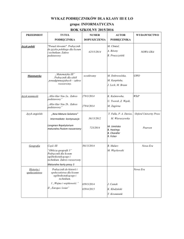 WYKAZ PODRĘCZNIKÓW DLA KLASY III E LO grupa: INFORMATYCZNA ROK SZKOLNY 2015/2016 PRZEDMIOT Język polski Matematyka Język niemiecki Język angielski Geografia TYTUŁ NUMER AUTOR PODRĘCZNIKA DOPUSZCZENIA PODRĘCZNIKA "Ponad słowami". Podręcznik do języka polskiego dla liceum i technikum. Zakres podstawowy M. Chmiel, 425/5/2014 A. Równy NOWA ERA R. Pruszczyński „Matematyka III” oczekiwany . Podręcznik dla szkół ponadgimnazjalnych – zakres rozszerzony. „Alles klar Neu 2a.. Zakres podstawowy” 279/3/2014 „Alles klar Neu 2b.. Zakres podstawowy” 279/4/2014 M. Dobrowolska, GWO M. Karpińska, J. Lech, M. Braun K. Kuźniewska, WSiP U. Tworek ,Z. Wąsik, „New Matura Solutions” M. Zagórna T. Falla, P. A. Davies, Oxford Univerity Press Intermediate- kontynuacja 361/3/2012 Longman Repetytorium maturalne.Poziom rozszerzony 723/2014 Część III WYDAWNICTWO 501/3/2014 ”Oblicza geografii 3” Podręcznik dla liceum ogólnokształcącego i technikum. Zakres rozszerzony M. Wieruszewska M. Umioska B. Hastings B. Chandler R. Ficker R. Malarz Pearson Nowa Era M. Więckowski Maturalne karty pracy 3 Historia i społeczeństwo Podręcznik do historii i społeczeństwa dla liceum ogólnokształcącego i technikum. I „Wojna i wojskowość.” II „Europa i świat” Nowa Era 659/3/2014 J. Centek 659/4/2015 K. Kłodziński T. Krzeminski Informatyka Religia .„ Informatyka Europejczyka” 410/2/2012 Podręcznik dla szkół ponadgimnazjalnych. Zakres rozszerzony. Część I I. Wydanie II „Moje miejsce w rodzinie’ AZ- 2-01/10/PO-1/12 G. Zawada Ks.Jan Szpet, D. Jackowiak HELION Św. Wojciech Poznań WYKAZ PODRĘCZNIKÓW DLA KLASY III E LO grupa: BEZPIECZEŃSTWO I OCHRONA ROK SZKOLNY 2015/2016 PRZEDMIOT Język polski Matematyka Język niemiecki TYTUŁ NUMER AUTOR PODRĘCZNIKA DOPUSZCZENIA PODRĘCZNIKA "Ponad słowami". Podręcznik do języka polskiego dla liceum i technikum. Zakres podstawowy. . „Matematyka III”. Podręcznik dla szkół ponadgimnazjalnych – zakres podstawowy. M. Chmiel, 425/5/2014 606/3/2014 Historia i społeczeństwo Podręcznik do historii i społeczeństwa dla liceum ogólnokształcącego i technikum. NOWA ERA M. Dobrowolska, GWO M. Karpińska, J. Lech, M. Braun „Alles klar Neu 2b. Zakres 279/4/2014 podstawowy Longamn Repetytorium maturalne.Poziom podstawowy A. Równy R. Pruszczynski „Alles klar Neu 2a. Zakres 279/3/2014 podstawowy” Język angielski WYDAWNICTWO 696/2014 I „Wojna i wojskowość.” 659/3/2014 II „Europa i świat” 659/4/2015 K. Kuźniewska, WSiP U. Tworek ,Z. Wąsik, M. Zagórna M. Umioska B. Hastings B. Chandler R. Ficker Pearson Nowa Era J. Centek K. Kłodziński T. Krzeminski Biologia „Biologia na czasie 3” 564/3/2014 Podręcznik dla szkół ponadgimnazjalnych. M. Marko-Worłowska, NOWA ERA W. Zamachowski, F. Dubert, M. Jurgowiak Zakres rozszerzony. J. Holeczek, A. Nowakowska, A. Tyc „Maturalne karty pracy ucznia” dla liceum ogólnokształcąceg i technikum. Zakres rozszerzony. NOWA ERA Część 3 Fizyka Chemia „Z fizyką w przyszłość”. 548/2/2013 Podręcznik dla szkół ponadgimnazjalnych. Zakres rozszerzony. część II B. Sagnowska, M. Fiałkowska, J. Salach „To jest chemia2”. Chemia 528/2/2013 B. Litwin organiczna. Podręcznik dla liceum ogólnokształcącego i technikum. Zakres rozszerzony J. Szymańska „To jest chemia 2 Maturalne karty pracy ” dla liceum ogólnokształcącego i technikum. chemia organiczna. zakres rozszerzony ZAMKOR NOWA ERA S. Styka- Wlazło Nowa Era E. Megiel, G. Świderska „ Religia „Moje miejsce w rodzine” AZ – 42 – 01/10 – PO . Ks.Jan Szpet, Danuta ŚW. WOJCIECH – 1/12 Jackowiak POZNAŃ