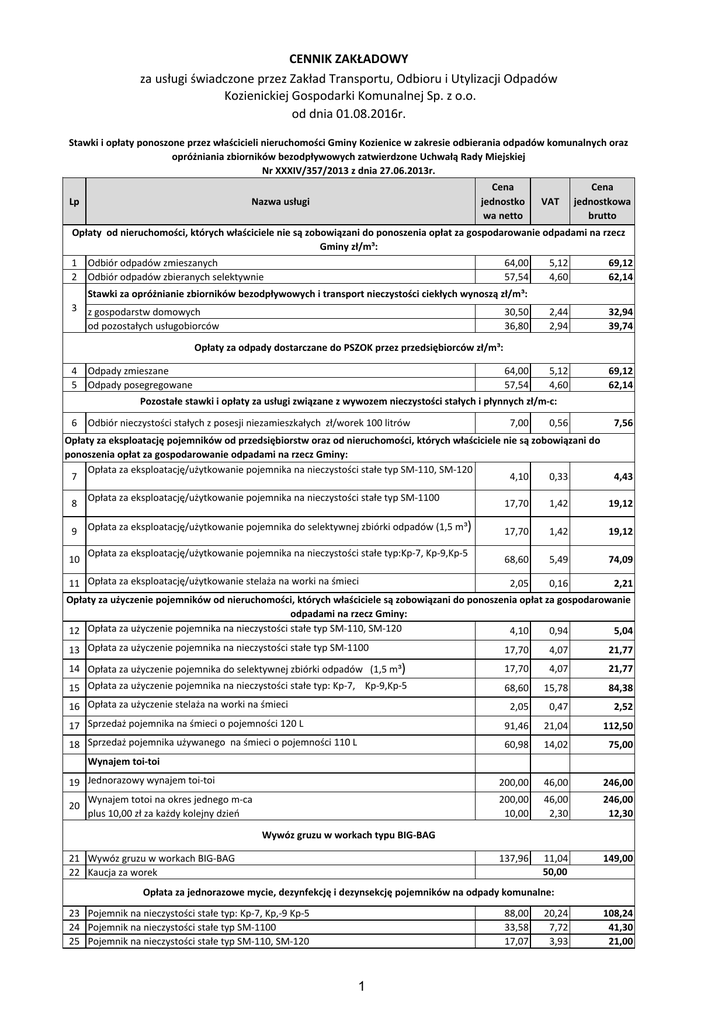 CENNIK ZAKŁADOWY za usługi świadczone przez Zakład Transportu, Odbioru i Utylizacji Odpadów Kozienickiej Gospodarki Komunalnej Sp. z o.o. od dnia 01.08.2016r. Stawki i opłaty ponoszone przez właścicieli nieruchomości Gminy Kozienice w zakresie odbierania odpadów komunalnych oraz opróżniania zbiorników bezodpływowych zatwierdzone Uchwałą Rady Miejskiej Nr XXXIV/357/2013 z dnia 27.06.2013r. Lp Cena jednostko wa netto Nazwa usługi VAT Cena jednostkowa brutto Opłaty od nieruchomości, których właściciele nie są zobowiązani do ponoszenia opłat za gospodarowanie odpadami na rzecz Gminy zł/m³: 1 2 Odbiór odpadów zmieszanych Odbiór odpadów zbieranych selektywnie 64,00 57,54 5,12 4,60 69,12 62,14 30,50 36,80 2,44 2,94 32,94 39,74 64,00 57,54 5,12 4,60 69,12 62,14 Stawki za opróżnianie zbiorników bezodpływowych i transport nieczystości ciekłych wynoszą zł/m³: 3 z gospodarstw domowych od pozostałych usługobiorców Opłaty za odpady dostarczane do PSZOK przez przedsiębiorców zł/m³: 4 5 Odpady zmieszane Odpady posegregowane Pozostałe stawki i opłaty za usługi związane z wywozem nieczystości stałych i płynnych zł/m-c: 6 Odbiór nieczystości stałych z posesji niezamieszkałych zł/worek 100 litrów 7,00 0,56 Opłaty za eksploatację pojemników od przedsiębiorstw oraz od nieruchomości, których właściciele nie są zobowiązani do ponoszenia opłat za gospodarowanie odpadami na rzecz Gminy: Opłata za eksploatację/użytkowanie pojemnika na nieczystości stałe typ SM-110, SM-120 7 4,10 0,33 8 9 10 Opłata za eksploatację/użytkowanie pojemnika na nieczystości stałe typ SM-1100 Opłata za eksploatację/użytkowanie pojemnika do selektywnej zbiórki odpadów (1,5 m³) Opłata za eksploatację/użytkowanie pojemnika na nieczystości stałe typ:Kp-7, Kp-9,Kp-5 11 Opłata za eksploatację/użytkowanie stelaża na worki na śmieci 7,56 4,43 17,70 1,42 19,12 17,70 1,42 19,12 68,60 5,49 74,09 2,05 0,16 2,21 Opłaty za użyczenie pojemników od nieruchomości, których właściciele są zobowiązani do ponoszenia opłat za gospodarowanie odpadami na rzecz Gminy: Opłata za użyczenie pojemnika na nieczystości stałe typ SM-110, SM-120 12 4,10 0,94 5,04 13 Opłata za użyczenie pojemnika na nieczystości stałe typ SM-1100 17,70 4,07 21,77 14 Opłata za użyczenie pojemnika do selektywnej zbiórki odpadów (1,5 m³) 17,70 4,07 21,77 15 Opłata za użyczenie pojemnika na nieczystości stałe typ: Kp-7, Kp-9,Kp-5 68,60 15,78 84,38 16 Opłata za użyczenie stelaża na worki na śmieci 2,05 0,47 2,52 17 Sprzedaż pojemnika na śmieci o pojemności 120 L 91,46 21,04 112,50 18 Sprzedaż pojemnika używanego na śmieci o pojemności 110 L 60,98 14,02 75,00 200,00 46,00 246,00 200,00 10,00 46,00 2,30 246,00 12,30 137,96 11,04 50,00 149,00 Wynajem toi-toi 19 Jednorazowy wynajem toi-toi 20 Wynajem totoi na okres jednego m-ca plus 10,00 zł za każdy kolejny dzień Wywóz gruzu w workach typu BIG-BAG 21 Wywóz gruzu w workach BIG-BAG 22 Kaucja za worek Opłata za jednorazowe mycie, dezynfekcję i dezynsekcję pojemników na odpady komunalne: 23 Pojemnik na nieczystości stałe typ: Kp-7, Kp,-9 Kp-5 24 Pojemnik na nieczystości stałe typ SM-1100 25 Pojemnik na nieczystości stałe typ SM-110, SM-120 88,00 33,58 17,07 1 20,24 7,72 3,93 108,24 41,30 21,00 Lp Cena jednostko wa netto Nazwa usługi VAT Cena jednostkowa brutto Stawki i opłaty w zakresie utrzymania dróg, ulic i placów wprowadzone Uchwałą Nr XXXIX/409/2013r. Rady Miejskiej w Kozienicach z dnia 19 grudnia 2013r. z mocą obowiązywania od 01.01.2014r. Usługi w zakresie zimowego utrzymania dróg: Odśnieżanie dróg przy użyciu samochodu marki Jelcz zł/km Odśnieżanie dróg i chodników przy użyciu ciągnika C360 lub U4514 zł/mth Odśnieżanie dróg i chodników pługiem, posypywanie posypywarką i rozsiewaczem przy użyciu ciągnika Zetor Proxima zł/mth Polewanie nawierzchni solanką lub posypywanie mieszanką piasku z solą przy użyciu samochodu marki Jelcz z piaskarko-solarką zł/km Posypywanie mieszanką piasku z solą przy użyciu ciągnika C360 lub U4514 z piaskarko26 solarką zł/mth Załadunek piasku do akcji zimowej koparko-ładowarką zł/mth Odśnieżanie, posypywanie dróg i chodników piaskiem lub mieszanką piasku z solą przy użyciu samochodu marki Farmer lub City Master zł/mth Odśnieżanie,polewanie nawierzchni solanką lub posypywanie mieszanką piasku z solą przy użyciu samochodu marki MAN z piaskarko-solarką zł/km Ręczne odśnieżanie przejść dla pieszych z załadunkiem śniegu na ciągnik C360 zł/m² Pełnienie dyżurów domowych przez kierowców zł/h Pełnienie dyżurów domowych przez dyspozytorów zł/h Utrzymanie gotowości sprzętowej do odśnieżania w miesiącach od XI-III 7,70 0,62 8,32 73,05 5,84 78,89 124,00 9,92 133,92 8,68 0,69 9,37 85,00 6,80 91,80 94,30 7,54 101,84 87,00 6,96 93,96 15,99 1,28 17,27 1,40 0,11 1,51 9,43 0,75 10,18 10,35 0,83 11,18 4 800,00 384,00 5 184,00 Usługi w zakresie oczyszczania miasta i wsi: Opróżnianie koszy ulicznych wg potrzeb minimum jeden raz w tygodniu w tym sprzątanie wokół koszy, bieżące remonty tj.malowanie,mycie - ryczałt miesięczny zł/kosz Utrzymanie konserwacja i bieżące naprawy słupów ogłoszeniowych w tym sprzątanie 27 wokół słupa - ryczałt miesięczny zł/słup Utrzymanie ,konserwacja i bieżące naprawy tablic ogłoszeniowych w tym sprzątanie terenu wokół tablicy - ryczłat miesięczny zł/tablicę Utrzymanie szaletu na Pl.15 Stycznia całodobowo ryczałt miesięczny Utrzymanie przystanków autobusowych - ryczałt miesięczny zł/ przystanek 27,00 2,16 29,16 129,00 10,32 139,32 66,00 5,28 71,28 4 950,00 396,00 5 346,00 135,00 10,80 145,80 11,10 2,55 13,65 2,72 0,63 3,35 9,43 2,17 11,60 10,35 2,38 12,73 Mechaniczne zamiatanie ulic zł/km 70,00 5,60 75,60 Mechaniczne zamiatanie przy użyciu urządzenia samojezdnego City Master zł/mth 81,50 6,52 88,02 0,20 0,02 0,22 Usługi w zakresie ak