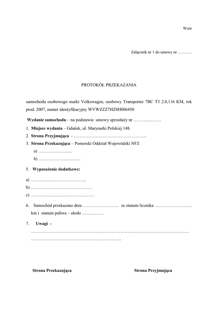 Wzór Załącznik nr 1 do umowy nr ……….. PROTOKÓŁ PRZEKAZANIA samochodu osobowego marki Volkswagen, osobowy Transporter 7BC T5 2.0,116 KM, rok prod. 2007, numer identyfikacyjny WVWZZZ7HZ8H006450 Wydanie samochodu – na podstawie umowy sprzedaży nr ………………. 1. Miejsce wydania – Gdańsk, ul. Marynarki Polskiej 148. 2. Strona Przyjmująca - ………………………………………….. 3. Strona Przekazująca – Pomorski Oddział Wojewódzki NFZ a) ………………….. b) ……………………….. 5. Wyposażenie dodatkowe: a) ……………………………….. b) …………………………………… c) ……………………………………. 6. Samochód przekazano dnia ……………………. ze stanem licznika ……………………. km i stanem paliwa – około …………… 7. Uwagi ……………………………………………………………………………………………… …………………………………………………….. Strona Przekazująca Strona Przyjmująca