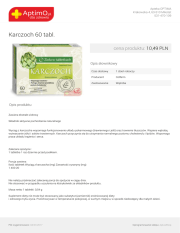 Apteka OPTIMA Krakowska 4, 63-510 Mikstat 531-470-109 Karczoch 60 tabl. cena produktu: 10,49 PLN Opis słownikowy Czas dostawy 1 dzień roboczy Producent Colfarm Zastosowanie Wątroba Opis produktu Zawiera ekstrakt ziołowy Składniki aktywne pochodzenia naturalnego Wyciąg z karczocha wspomaga funkcjonowanie układu pokarmowego (trawiennego i jelit) oraz trawienie tłuszczów. Wspiera wątrobę, wytwarzanie żółci i soków trawiennych. Karczoch przyczynia się do utrzymania normalnego poziomu cholesterolu i lipidów. Wspomaga pracę układu krążenia i serca. Zalecane spożycie : 1 tabletka 1 raz dziennie przed posiłkiem. Porcja zawiera: Ilość tabletek Wyciąg z karczocha (mg) Zawartość cynaryny (mg) 1 400 20 Nie należy przekraczać zalecanej porcji do spożycia w ciągu dnia. Nie stosować w przypadku uczulenia na którykolwiek ze składników produktu. Masa netto 1 tabletki: 0,54 g Suplement diety nie może być stosowany jako substytut (zamiennik) zróżnicowanej diety i zdrowego trybu życia. Przechowywać w temperaturze pokojowej, w suchym miejscu, w sposób niedostępny dla małych dzieci. Plik wygenerowano: 04-03-2017 Powered by TCPDF (www.tcpdf.org) Oprogramowanie sklepu: AptusShop