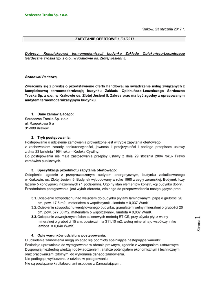 Serdeczna Troska Sp. z o.o. Kraków, 23 stycznia 2017 r. ZAPYTANIE OFERTOWE 1 /01/2017 Dotyczy: Kompleksowej termomodernizacji budynku Zakładu Serdeczna Troska Sp. z o.o., w Krakowie os. Złotej Jesieni 5. Opiekuńczo-Leczniczego Szanowni Państwo, Zwracamy się z prośbą o przedstawienie oferty handlowej na świadczenie usług związanych z kompleksową termomodernizacją budynku Zakładu Opiekuńczo-Leczniczego Serdeczna Troska Sp. z o.o., w Krakowie os. Złotej Jesieni 5. Zakres prac ma być zgodny z opracowanym audytem termomodernizacyjnym budynku. 1. Dane zamawiającego: Serdeczna Troska Sp. z o.o. ul. Rzepakowa 5 a 31-989 Kraków 2. Tryb postępowania: Postępowanie o udzielenie zamówienia prowadzone jest w trybie zapytania ofertowego z zachowaniem zasady konkurencyjności, jawności i przejrzystości i podlega przepisom ustawy z dnia 23 kwietnia 1964 roku – Kodeks Cywilny. Do postępowania nie mają zastosowania przepisy ustawy z dnia 29 stycznia 2004 roku- Prawo zamówień publicznych. 4. Opis warunków udziału w postępowaniu: O udzielenie zamówienia mogą ubiegać się podmioty spełniające następujące warunki: Posiadają uprawnienia do występowania w obrocie prawnym, zgodnie z wymaganiami ustawowymi. Dysponują niezbędną wiedzą i doświadczeniem, a także potencjałem ekonomicznym i technicznym oraz pracownikami zdolnymi do wykonania danego zamówienia. Nie podlegają wykluczeniu z udziału w postępowaniu. Nie są powiązane kapitałowo, ani osobowo z Zamawiającym . Strona 3.1. Ocieplenie stropodachu nad wejściem do budynku płytami laminowanymi papą o grubości 20 cm, pow. 17,5 m2 , materiałem o współczynniku lambda = 0,037 W/mK 3.2. Ocieplenie stropodachu wentylowanego budynku, granulatem wełny mineralnej o grubości 20 cm, pow. 577,00 m2, materiałem o współczynniku lambda = 0,037 W/mK. 3.3. Ocieplenie zewnętrznych ścian osłonowych metodą ETICS, przy użyciu płyt z wełny mineralnej o grubości 15 cm, powierzchnia 311,10 m2, wełną mineralną o współczynniku lambda = 0,040 W/mK. 1 3. Specyfikacja przedmiotu zapytania ofertowego: Ocieplenie, zgodnie z przeprowadzonym audytem energetycznym, budynku zlokalizowanego w Krakowie, os. Złotej Jesieni 5. Budynek wybudowany w roku 1960 z cegły żerańskiej. Budynek liczy łącznie 5 kondygnacji naziemnych i 1 podziemną. Ogólny stan elementów konstrukcji budynku dobry. Przedmiotem postępowania, jest wybór oferenta, zdolnego do przeprowadzenia następujących prac: Serdeczna Troska Sp. z o.o. 5. Forma rozliczenia: Rozliczenie nastąpi za zakończone etapy prac, na podstawie protokołu zdawczo-odbiorczego. 6. Czas realizacji: Termin rozpoczęcia: 1 marca 2017 r. Termin zakończenia: 31 grudnia 2017 r. 7. Termin składania ofert upływa w dniu: 31.01.2017 r. 8. Oferta musi pozostać ważna min. do dnia: 31.03.2017 r. 9. Wybór najkorzystniejszej oferty nastąpi do dnia 3 lutego 2017 r. 10. Przy wyborze oferty zamawiający będzie się kierował następującymi kryteriami i ich wagą: Lp. Kryterium Waga (%) 1. Cena netto 70 2. Termin przystąpienia do realizacji usługi 30 Maksymalna ilość punktów, jaką po uwzględnieniu wagi może osiągnąć oferta wynosi 100 pkt. Za najkorzystniejszą uważa się ofertę, która otrzymała największą ilość punktów wyliczoną według poniższego wzoru Lpu=L1+L2 gdzie: a. Lpu – liczba uzyskanych punktów b. L1 – liczba uzyskanych punktów za kryterium pierwsze (cena netto) c. L2 – liczba uzyskanych punktów za kryterium drugie (termin wykonania) Poszczególne kryteria będą przeliczane według następującego wzoru: d. Kryterium nr 1 (cena netto) L1= (najniższa oferowana cena/ cena oferowana)x100x70%. e. Kryterium nr 2 (termin przystąpienia do prac ) – w przypadku terminu przystąpienia do prac: od 1 marca do 10 marca 2017 r. – 10 pkt, od 13 marca do 17 marca 2017 r. - 5 pkt, po 20 marca 2017 r. – 0 pkt. Złożona oferta musi zawierać: nazwę i adres oferenta, oświadczenie o spełnieniu warunków udziału w postępowaniu, opis zrealizowanych prac o podobnym zakresie, referencje, cenę całkowitą netto i brutto wyrażoną w polskich złotych, datę sporządzenia, termin ważności oferty, warunki i termin płatności, termin rozpoczęcia realizacji usługi, podpis oferującego wraz z pieczątką firmową. Strona 12. 2 11. Oferta powinna być dostarczona: Preferowany sposób dostarczenia oferty osobiście w siedzibie zamawiającego: Serdeczna Troska Sp. z o.o., ul. Rzepakowa 5 a ,31-989 Kraków. Dopuszcza się również złożenie oferty drogą pocztową (poczta, kurier etc.) i drogą elektroniczną w postaci pliku pdf, na adres e-mail: [email protected] . Serdeczna Troska Sp. z o.o. Strona 3 13. Zamawiający zastrzega sobie prawo do: Odwołania postępowania, unieważnienia go w całości lub w części w każdym czasie, bez podania przyczyny, co nie będzie podstawą dla oferenta do dochodzenia przeciwko zamawiającemu jakichkolwiek roszczeń lub do wykonania jakichkolwiek uprawnień, zamknięcia postępowania bez dokonania wyboru oferty, zmiany terminów wyznaczonych w ogłoszeniu, żądania szczegółowych informacji i wyjaśnień od oferentów na każdym etapie przetargu, wyłącznej interpretacji zapisów ogłoszenia.