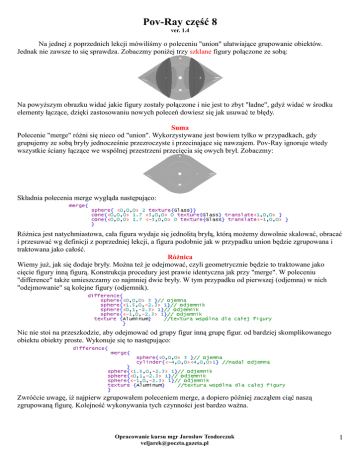 Pov-Ray część 8 ver. 1.4 Na jednej z poprzednich lekcji mówiliśmy o poleceniu "union" ułatwiające grupowanie obiektów. Jednak nie zawsze to się sprawdza. Zobaczmy poniżej trzy szklane figury połączone ze sobą: Na powyższym obrazku widać jakie figury zostały połączone i nie jest to zbyt "ładne", gdyż widać w środku elementy łączące, dzięki zastosowaniu nowych poleceń dowiesz się jak usuwać te błędy. Suma Polecenie "merge" różni się nieco od "union". Wykorzystywane jest bowiem tylko w przypadkach, gdy grupujemy ze sobą bryły jednocześnie przezroczyste i przecinające się nawzajem. Pov-Ray ignoruje wtedy wszystkie ściany łączące we wspólnej przestrzeni przecięcia się owych brył. Zobaczmy: Składnia polecenia merge wygląda następująco: Różnica jest natychmiastowa, cała figura wydaje się jednolitą bryłą, którą możemy dowolnie skalować, obracać i przesuwać wg definicji z poprzedniej lekcji, a figura podobnie jak w przypadku union będzie zgrupowana i traktowana jako całość. Różnica Wiemy już, jak się dodaje bryły. Można też je odejmować, czyli geometrycznie będzie to traktowane jako cięcie figury inną figurą. Konstrukcja procedury jest prawie identyczna jak przy "merge". W poleceniu "difference" także umieszczamy co najmniej dwie bryły. W tym przypadku od pierwszej (odjemna) w nich "odejmowanie" są kolejne figury (odjemnik). Nic nie stoi na przeszkodzie, aby odejmować od grupy figur inną grupę figur. od bardziej skomplikowanego obiektu obiekty proste. Wykonuje się to następująco: Zwróćcie uwagę, iż najpierw zgrupowałem poleceniem merge, a dopiero później zacząłem ciąć naszą zgrupowaną figurę. Kolejność wykonywania tych czynności jest bardzo ważna. Opracowanie kursu mgr Jarosław Teodorczuk [email protected] 1 Polecenie difference tworzy możliwość tworzenia bardzo skomplikowanych figur z już istniejących. Poniżej zaprezentuję prosty przykład zastosowania tej funkcji. Umieściłem kulkę w przestrzeni, a następnie wyciąłem w niej prostopadłościanem dziurę, na końcu wstawiłem wewnątrz cięcia źródła światła. Oto przykład: Część wspólna Dzięki "intersection" możemy tworzyć figury, które powstają poprzez określenie części wspólnych innych figur. Oczywiście nie muszę już chyba przypominać, że czynnikami operacji "intersection" mogą być także grupy union, merge a nawet difference. Sprawdźmy jak działa "intersection" dla połączenia walca i kuli. Jak widać część wspólna kuli i walca to "wypukły walec" Zadanie 1 Napisz rysunek obrazujący ser (7 dziur) Wskazówka: Użyj polecenia "difference" i z box "wydłubuj" dziury przy pomocy mniejszych kul. Zadanie 2 Narysuj rysunek lampki stołowej i krzesła. (światło musi wydobywać się z wyciętego stożka). Krzesło ma mieć wycięte specyficzne oparcie. Zwróć uwagę na zaokrąglenie na krześle. Wskazówka: Aby zrobić świecącą lampkę wytnij stożek innym stożkiem. Wykonaj to tak samo jak na rysunku poniżej. 1- oznacza lampkę, natomiast 2 – jest to figura którą tniemy, żółty symbol to źródło światła Opracowanie kursu mgr Jarosław Teodorczuk [email protected] 2