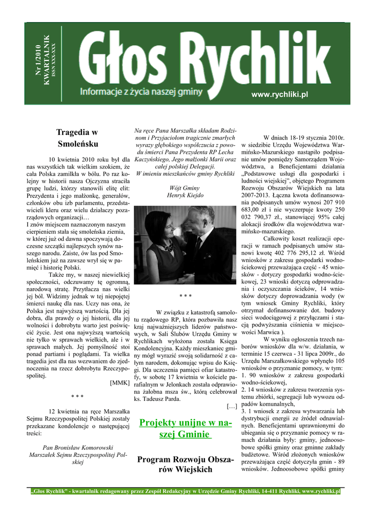 ISSN XXX-XXX Nr 1/2010 KWARTALNIK www.rychliki.pl Na ręce Pana Marszałka składam Rodzinom i Przyjaciołom tragicznie zmarłych wyrazy głębokiego współczucia z powodu śmierci Pana Prezydenta RP Lecha 10 kwietnia 2010 roku był dla Kaczyńskiego, Jego małżonki Marii oraz całej polskiej Delegacji. nas wszystkich tak wielkim szokiem, że cała Polska zamilkła w bólu. Po raz ko- W imieniu mieszkańców gminy Rychliki lejny w historii nasza Ojczyzna straciła Wójt Gminy grupę ludzi, którzy stanowili elitę elit: Henryk Kiejdo Prezydenta i jego małżonkę, generałów, członków obu izb parlamentu, przedstawicieli kleru oraz wielu działaczy pozarządowych organizacji… I znów miejscem naznaczonym naszym cierpieniem stała się smoleńska ziemia, w której już od dawna spoczywają doczesne szczątki najlepszych synów naszego narodu. Zaiste, ów las pod Smoleńskiem już na zawsze wrył się w pamięć i historię Polski. Także my, w naszej niewielkiej społeczności, odczuwamy tę ogromną, narodową stratę. Przytłacza nas wielki jej ból. Widzimy jednak w tej niepojętej *** śmierci naukę dla nas. Uczy nas ona, że Polska jest najwyższą wartością. Dla jej W związku z katastrofą samolodobra, dla prawdy o jej historii, dla jej tu rządowego RP, która pozbawiła nasz wolności i dobrobytu warto jest poświę- kraj najważniejszych liderów państwocić życie. Jest ona najwyższą wartością wych, w Sali Ślubów Urzędu Gminy w nie tylko w sprawach wielkich, ale i w Rychlikach wyłożona została Księga sprawach małych. Jej pomyślność stoi Kondolencyjna. Każdy mieszkaniec gmiponad partiami i poglądami. Ta wielka ny mógł wyrazić swoją solidarność z catragedia jest dla nas wezwaniem do zjed- łym narodem, dokonując wpisu do Księnoczenia na rzecz dobrobytu Rzeczypo- gi. Dla uczczenia pamięci ofiar katastrospolitej. fy, w sobotę 17 kwietnia w kościele pa[MMK] rafialnym w Jelonkach została odprawiona żałobna msza św., którą celebrował *** ks. Tadeusz Parda. […] 12 kwietnia na ręce Marszałka Sejmu Rzeczypospolitej Polskiej zostały przekazane kondolencje o następującej treści: Tragedia w Smoleńsku Projekty unijne w naszej Gminie Pan Bronisław Komorowski Marszałek Sejmu Rzeczypospolitej Polskiej Program Rozwoju Obszarów Wiejskich W dniach 18-19 stycznia 2010r. w siedzibie Urzędu Województwa Warmińsko-Mazurskiego nastąpiło podpisanie umów pomiędzy Samorządem Województwa, a Beneficjentami działania „Podstawowe usługi dla gospodarki i ludności wiejskiej”, objętego Programem Rozwoju Obszarów Wiejskich na lata 2007-2013. Łączna kwota dofinansowania podpisanych umów wynosi 207 910 683,00 zł i nie wyczerpuje kwoty 250 032 790,37 zł., stanowiącej 95% całej alokacji środków dla województwa warmińsko-mazurskiego. Całkowity koszt realizacji operacji w ramach podpisanych umów stanowi kwotę 402 776 295,12 zł. Wśród wniosków z zakresu gospodarki wodnościekowej przeważająca część - 45 wniosków - dotyczy gospodarki wodno-ściekowej, 23 wnioski dotyczą odprowadzania i oczyszczania ścieków, 14 wniosków dotyczy doprowadzania wody (w tym wniosek Gminy Rychliki, który otrzymał dofinansowanie dot. budowy sieci wodociągowej z przyłączami i stacją podwyższania ciśnienia w miejscowości Marwica ). W wyniku ogłoszenia trzech naborów wniosków dla w/w. działania, w terminie 15 czerwca - 31 lipca 2009r., do Urzędu Marszałkowskiego wpłynęło 105 wniosków o przyznanie pomocy, w tym: 1. 90 wniosków z zakresu gospodarki wodno-ściekowej, 2. 14 wniosków z zakresu tworzenia systemu zbiórki, segregacji lub wywozu odpadów komunalnych, 3. 1 wniosek z zakresu wytwarzania lub dystrybucji energii ze źródeł odnawialnych. Beneficjentami uprawnionymi do ubiegania się o przyznanie pomocy w ramach działania były: gminy, jednoosobowe spółki gminy oraz gminne zakłady budżetowe. Wśród złożonych wniosków przeważająca część dotyczyła gmin - 89 wniosków. Jednoosobowe spółki gminy „Głos Rychlik” - kwartalnik redagowany przez Zespół Redakcyjny w Urzędzie Gminy Rychliki, 14-411 Rychliki, www.rychliki.pl złożyły 8 wniosków, zakłady budżetowe również 8 wniosków. Pozytywny wynik weryfikacji uzyskały odpowiednio: 1. 82 wnioski na kwotę 210 358 922,00 zł z zakresu gospodarki wodno-ściekowej, 2. 10 wniosków na kwotę 1 466 713,00 zł z zakresu tworzenia systemu zbiórki, segregacji lub wywozu odpadów komunalnych, 3. 1 wniosek na kwotę 84 750,00 zł z zakresu wytwarzania lub dystrybucji energii ze źródeł odnawialnych. W dniu 6 stycznia 2010r. Zarząd Województwa Warmińsko-Mazurskiego zatwierdził Uchwałą nr 1/2/10/III listy operacji dla działania 321 „Podstawowe usługi dla gospodarki i ludności wiejskiej” w ramach Programu Rozwoju Obszarów Wiejskich na lata 2007-2013 oraz określił ko- lejność zawierania umów o przyznanie pomocy w następującej kolejności : 1. lista operacji z zakresu wytwarzania lub dystrybucji energii ze źródeł odnawialnych, 2. lista operacji z zakresu tworzenia systemu zbiórki, segregacji lub wywozu odpadów komunalnych, 3. lista operacji z zakresu gospodarki wodno-ściekowej. Refundacją zostaną objęte koszty kwalifikowalne, poniesione przez Beneficjentów w wysokości nieprzekraczającej 75% tych kosztów. Dla jednej gminy w okresie realizacji Programu kwota dofinansowania nie może przekroczyć 4 mln zł z zakresu operacji dotyczących gospodarki wodno-ściekowej, 200 tys. zł z zakresu operacji dotyczących tworzenia systemu zbiórki, segregacji lub wywozu od- padów komunalnych oraz 3 mln zł z zakresu operacji dotyczących wytwarzania lub dystrybucji energii ze źródeł odnawialnych. [...] Budowa wodociągu w Marwicy Podróżującym trasą Pasłęk-Dzierzgoń, rzuca się w oczy trwająca budowa sieci wodociągowej w miej-scowości Marwica. Stoi już nowa stacja podwyższania ciśnienia, a inne prace prędko posuwają się napr