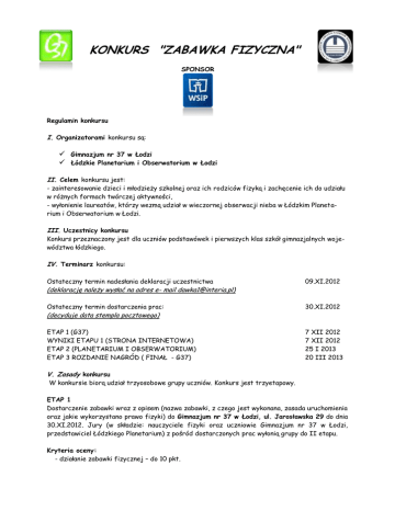 KONKURS "ZABAWKA FIZYCZNA" SPONSOR Regulamin konkursu I. Organizatorami konkursu są: Gimnazjum nr 37 w Łodzi Łódzkie Planetarium i Obserwatorium w Łodzi II. Celem konkursu jest: - zainteresowanie dzieci i młodzieży szkolnej oraz ich rodziców fizyką i zachęcenie ich do udziału w różnych formach twórczej aktywności, - wyłonienie laureatów, którzy wezmą udział w wieczornej obserwacji nieba w Łódzkim Planetarium i Obserwatorium w Łodzi. III. Uczestnicy konkursu Konkurs przeznaczony jest dla uczniów podstawówek i pierwszych klas szkół gimnazjalnych województwa łódzkiego. IV. Terminarz konkursu: Ostateczny termin nadesłania deklaracji uczestnictwa 09.XI.2012 Ostateczny termin dostarczenia prac: 30.XI.2012 ETAP 1 (G37) WYNIKI ETAPU 1 (STRONA INTERNETOWA) ETAP 2 (PLANETARIUM I OBSERWATORIUM) ETAP 3 ROZDANIE NAGRÓD ( FINAŁ - G37) 7 XII 2012 7 XII 2012 25 I 2013 20 III 2013 (deklarację należy wysłać na adres e- mail [email protected]) (decyduje data stempla pocztowego) V. Zasady konkursu W konkursie biorą udział trzyosobowe grupy uczniów. Konkurs jest trzyetapowy. ETAP 1 Dostarczenie zabawki wraz z opisem (nazwa zabawki, z czego jest wykonana, zasada uruchomienia oraz jakie wykorzystano prawo fizyki) do Gimnazjum nr 37 w Łodzi, ul. Jarosławska 29 do dnia 30.XI.2012. Jury (w składzie: nauczyciele fizyki oraz uczniowie Gimnazjum nr 37 w Łodzi, przedstawiciel Łódzkiego Planetarium) z pośród dostarczonych prac wyłonią grupy do II etapu. Kryteria oceny: - działanie zabawki fizycznej – do 10 pkt. - wskazanie w opisie praw fizyki wykorzystanych w zabawce – do 15 pkt. - estetyka wykonania – do 5 pkt. ETAP 2 Wyłonione 5 grup prezentuje zabawkę na forum przed Jury oraz pozostałymi uczestnikami drugiego etapu. Prezentacja nie może przekraczać 15 minut. Etap odbywa się w Łódzkim Planetarium i Obserwatorium w dniu 25.I.2013. Z pośród wszystkich prezentacji zostanie wyłoniona grupa finałowa. Kryteria oceny: - znajomość wykorzystanych praw fizyki – do 15 pkt. - forma prezentacji – do 5 pkt. ETAP 3 – FINAŁ Grupy finałowe wezmą udział w rajdzie edukacyjnym, który odbędzie się na terenie Gimnazjum nr 37 w Łodzi dnia 20.III.2013. Zadaniem uczestników będzie przejście w jak najkrótszym czasie trasy, na której będą znajdowały się proste zagadki fizyczne. W przypadku braku prawidłowej odpowiedzi uczniowie będą musieli wykonać dodatkowe zadanie sportowe, które wydłużą czas przejścia trasy. Kryteria oceny: W tym etapie liczy się całkowity czas przejścia trasy. Grupa 1 otrzymuje Grupa 2 otrzymuje Grupa 3 otrzymuje Grupa 4 otrzymuje Grupa 5 otrzymuje – 50 pkt. – 40 pkt. - 30 pkt. - 20 pkt. – 10 pkt. W całym konkursie zwycięzcą zostaje grupa, która uzyska największą ilość punktów. Maksymalna ilość punktów możliwa do zdobycia wynosi 100. VI. O co walczymy? Wszyscy finaliści otrzymają dyplomy uczestnictwa oraz wezmą udział w wieczornej obserwacji nieba w Łódzkim Planetarium, a zwycięzcy najciekawszych prac nagrody rzeczowe. Zabawki nadesłane na konkurs przechodzą na własność organizatorów. Zgłoszenie zabawki na konkurs jest jednoznaczne z przyjęciem warunków regulaminu, oraz wyrażeniem zgody na publikowanie danych osobowych w materiałach promocyjnych konkursu. Wyniki konkursu prezentowane będą na stronach: www.dawka1.w.interia.pl; http://gim37.szkoly.lodz.pl; http://www.planetarium.toya.net.pl W razie pytań prosimy o kontakt z Pawłem Dawczyńskim – 509-01-77-44. ZAPRASZAMY. KARTA ZGŁOSZENIA do konkursu KONKURS "ZABAWKA FIZYCZNA" w roku szkolnym 2012 / 2013 Lp. Nazwisko i imię ucznia Data i miejsce urodzenia Klasa i szkoła Nazwisko i imię nauczyciela telefon kontaktowy GRUPA 1 1 2 3 Nazwa zabawki GRUPA 2 1 2 3 Nazwa zabawki GRUPA 3 1 2 3 Nazwa zabawki Imię i nazwisko nauczyciela opiekuna grupy.