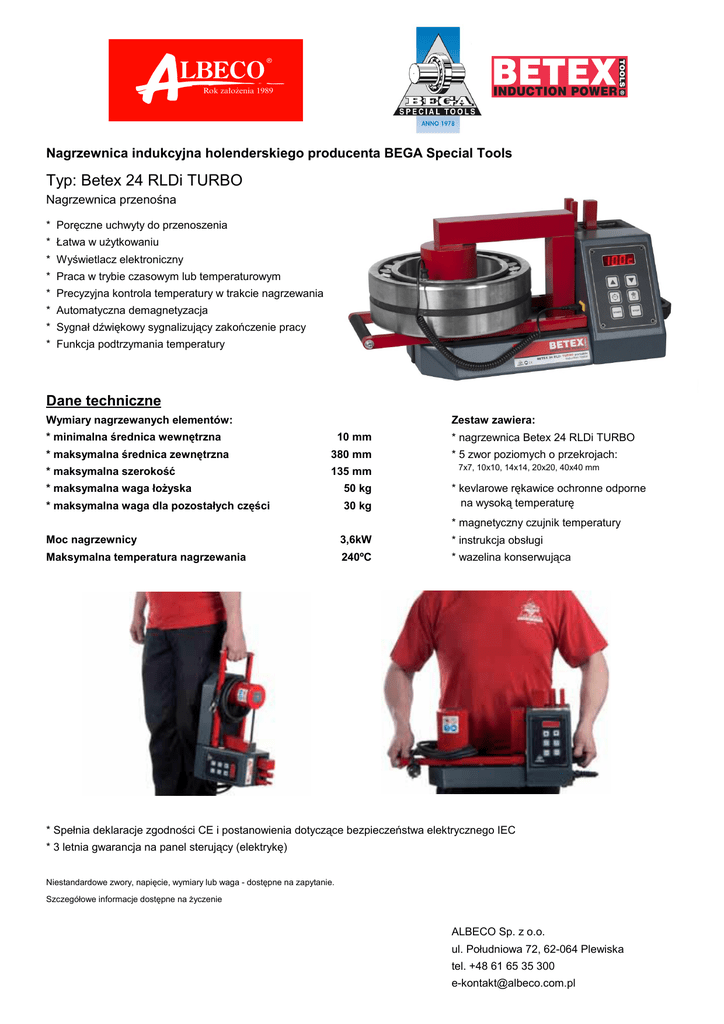 Nagrzewnica indukcyjna holenderskiego producenta BEGA Special Tools Typ: Betex 24 RLDi TURBO Nagrzewnica przenośna * Poręczne uchwyty do przenoszenia * Łatwa w użytkowaniu * Wyświetlacz elektroniczny * Praca w trybie czasowym lub temperaturowym * Precyzyjna kontrola temperatury w trakcie nagrzewania * Automatyczna demagnetyzacja * Sygnał dźwiękowy sygnalizujący zakończenie pracy * Funkcja podtrzymania temperatury Dane techniczne Wymiary nagrzewanych elementów: Zestaw zawiera: * minimalna średnica wewnętrzna 10 mm * maksymalna średnica zewnętrzna 380 mm * maksymalna szerokość 135 mm * maksymalna waga łożyska 50 kg * maksymalna waga dla pozostałych części 30 kg * nagrzewnica Betex 24 RLDi TURBO * 5 zwor poziomych o przekrojach: 7x7, 10x10, 14x14, 20x20, 40x40 mm * kevlarowe rękawice ochronne odporne na wysoką temperaturę * magnetyczny czujnik temperatury Moc nagrzewnicy 3,6kW * instrukcja obsługi Maksymalna temperatura nagrzewania 240ºC * wazelina konserwująca * Spełnia deklaracje zgodności CE i postanowienia dotyczące bezpieczeństwa elektrycznego IEC * 3 letnia gwarancja na panel sterujący (elektrykę) Niestandardowe zwory, napięcie, wymiary lub waga - dostępne na zapytanie. Szczegółowe informacje dostępne na życzenie ALBECO Sp. z o.o. ul. Południowa 72, 62-064 Plewiska tel. +48 61 65 35 300 [email protected]