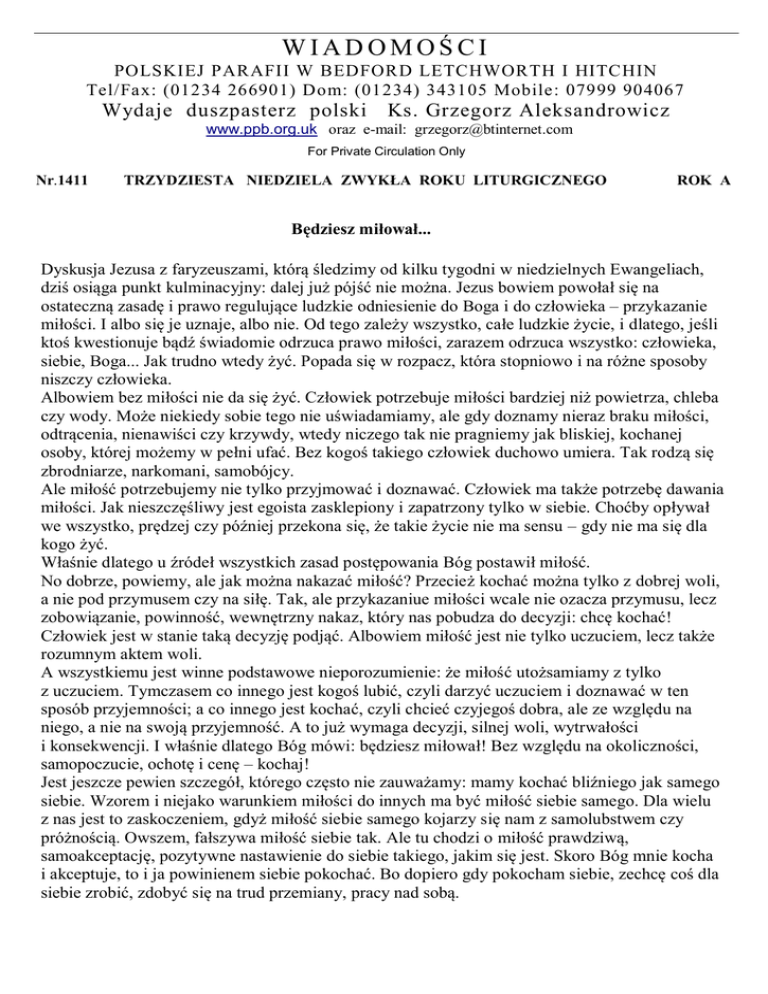 WIADOMOŚCI POLSKIEJ PARAFII W BEDFORD LETCHWORTH I HITCHIN Tel/Fax: (01234 266901) Dom: (01234) 343105 Mobile: 07999 904067 Wydaje duszpasterz polski Ks. Grzegorz Aleksandrowicz www.ppb.org.uk oraz e-mail: [email protected] For Private Circulation Only Nr.1411 TRZYDZIESTA NIEDZIELA ZWYKŁA ROKU LITURGICZNEGO ROK A Będziesz miłował... Dyskusja Jezusa z faryzeuszami, którą śledzimy od kilku tygodni w niedzielnych Ewangeliach, dziś osiąga punkt kulminacyjny: dalej już pójść nie można. Jezus bowiem powołał się na ostateczną zasadę i prawo regulujące ludzkie odniesienie do Boga i do człowieka – przykazanie miłości. I albo się je uznaje, albo nie. Od tego zależy wszystko, całe ludzkie życie, i dlatego, jeśli ktoś kwestionuje bądź świadomie odrzuca prawo miłości, zarazem odrzuca wszystko: człowieka, siebie, Boga... Jak trudno wtedy żyć. Popada się w rozpacz, która stopniowo i na różne sposoby niszczy człowieka. Albowiem bez miłości nie da się żyć. Człowiek potrzebuje miłości bardziej niż powietrza, chleba czy wody. Może niekiedy sobie tego nie uświadamiamy, ale gdy doznamy nieraz braku miłości, odtrącenia, nienawiści czy krzywdy, wtedy niczego tak nie pragniemy jak bliskiej, kochanej osoby, której możemy w pełni ufać. Bez kogoś takiego człowiek duchowo umiera. Tak rodzą się zbrodniarze, narkomani, samobójcy. Ale miłość potrzebujemy nie tylko przyjmować i doznawać. Człowiek ma także potrzebę dawania miłości. Jak nieszczęśliwy jest egoista zasklepiony i zapatrzony tylko w siebie. Choćby opływał we wszystko, prędzej czy później przekona się, że takie życie nie ma sensu – gdy nie ma się dla kogo żyć. Właśnie dlatego u źródeł wszystkich zasad postępowania Bóg postawił miłość. No dobrze, powiemy, ale jak można nakazać miłość? Przecież kochać można tylko z dobrej woli, a nie pod przymusem czy na siłę. Tak, ale przykazaniue miłości wcale nie ozacza przymusu, lecz zobowiązanie, powinność, wewnętrzny nakaz, który nas pobudza do decyzji: chcę kochać! Człowiek jest w stanie taką decyzję podjąć. Albowiem miłość jest nie tylko uczuciem, lecz także rozumnym aktem woli. A wszystkiemu jest winne podstawowe nieporozumienie: że miłość utożsamiamy z tylko z uczuciem. Tymczasem co innego jest kogoś lubić, czyli darzyć uczuciem i doznawać w ten sposób przyjemności; a co innego jest kochać, czyli chcieć czyjegoś dobra, ale ze względu na niego, a nie na swoją przyjemność. A to już wymaga decyzji, silnej woli, wytrwałości i konsekwencji. I właśnie dlatego Bóg mówi: będziesz miłował! Bez względu na okoliczności, samopoczucie, ochotę i cenę – kochaj! Jest jeszcze pewien szczegół, którego często nie zauważamy: mamy kochać bliźniego jak samego siebie. Wzorem i niejako warunkiem miłości do innych ma być miłość siebie samego. Dla wielu z nas jest to zaskoczeniem, gdyż miłość siebie samego kojarzy się nam z samolubstwem czy próżnością. Owszem, fałszywa miłość siebie tak. Ale tu chodzi o miłość prawdziwą, samoakceptację, pozytywne nastawienie do siebie takiego, jakim się jest. Skoro Bóg mnie kocha i akceptuje, to i ja powinienem siebie pokochać. Bo dopiero gdy pokocham siebie, zechcę coś dla siebie zrobić, zdobyć się na trud przemiany, pracy nad sobą. MSZE ŚWIĘTE I NABOŻEŃSTWA w BEDFORD: Charity Reg.No.1119423 Niedziela,26.10.2014 TRZYDZIESTA NIEDZIELA ROKU LITURGICZNEGO Rok A Godz. 9.30 O błog.Boże i łaski dlaMieczysławy i Romualda Wojciechowskich w 40-tą rocz ślun Godz.11.00 O błog.Boże dla Victorii Dąbrówka z ok.1-szej rocznicy urodzin – int. rodziców Godz. 19.00 O błog.Boże i opiekę M.Bożej na dalsze lata dla męża Krzysztofa i taty Wojciecha. Poniedziałek,27.10. Godz. 9.30 - O błogosławieństwo Boże dla wnuczki Matyldy Śmigasiewicz – int. dziadków. Wtorek, 28.10.2014 Godz. 9.30 - za dusze ś.p. Krystyny Kulesz - int. Pani Zofii Markowskiej. Godz.11.00 - Msza swięta załobna i Pogrzeb ś.p. Krystyny Kulesz. Środa, 29.10.2014 Godz 19.00 - O błogosławieństwo Boże, zdrowie i potrzebne łaski dla Konrada int. rodziców. NABOŻEŃSTWO RÓŻAŃCOWE. Czwartek,30.10.2014 Godz. 9.30 - za dusze ś.p.Adama Gorczyńskiego w 6-tą rocznicę śmierci - int. kuzynki. Piątek, 31.10.2014 Godz.15.00 - za dusze ś.p.Bronisława Guzińskiego - int.żony. KORONKA DO MIŁOSIERDZIA BOŻEGO. Sobota, 1.11.2014 Godz. 9.30 - Intencja wolna. Godz.19.00 - za dusze ś.p. zmarłych wymienionych w tegorocznych Wypominkach. Niedziela,2.11.2014 UROCZYSTOŚĆ WSZYSTKICH ŚWIĘTYCH. Godz. 9.30 - za dusze ś.p. zmarłych wymienionych w tegorocznych Wypominkach. Godz.11.00 18.00 - za dusze ś.p.zmarłych wymienionych w tegorocznych Wypominkach. Godz.18.00 - ADORACJA NAJŚWIĘTSZEGO SAKRAMENTU. Godz.19.00 - za dusze ś.p. zmarłych wymienionych w tegorocznych Wypominkach. Poniedziałek,3.11.14 Godz. 9.30 - za dusze ś.p. Krystyny Kulesz - int. rodziny Romanowskich. Godz.10.00 - W intencjach Ojca Świętego Franciszka. DZIEŃ Godz.19.00 - za dusze ś.p. wszystkich wiernych zmarłych. ZADUSZNY Wtorek, 4. 11.2014 Godz. 9.30 - za dusze ś.p. Krystyny Kulesz - int. Pani Janiny Sverdelean. Środa, 5. 11.2014 Godz.19.00 za ś.p. rodzicow i zmarłych z rodziny Gołębiewskich i Grochowskich – int. dzieci. Czwartek,6. 11.2014 Godz. 9.30 -O błogosławieństwo Boże i potrzebne łaski dla rodziców i braci – int. syna i brata Piątek, 7. 11.2014 - PIERWSZY PIĄTEK miesiąca LISTOPADA Godz.15.00 - Intencja wolna. KORONKA DO MIŁOSIERDZIA BOŻEGO. Godz.19.00 - Intencja wolna. Sobota, 8.11.2014 Godz. 9.30 - Intencja wolna. Godz.19.00 - O błogosławieństwo Boże, zdrowie i potrzebne łaski dla rodziny Konopków. Niedziela, 9.11.2014 TRZYDZIESTA DRUGA NIEDZIELA ROKU LITURGICZNEGO - Rok A Godz. 9.30 - za dusze ś.p. Haliny Trice - int. matki. Godz.11.00 - W intencji dzieci Komunijnych - int. rodziców. Godz.19.00 - O błogosławie