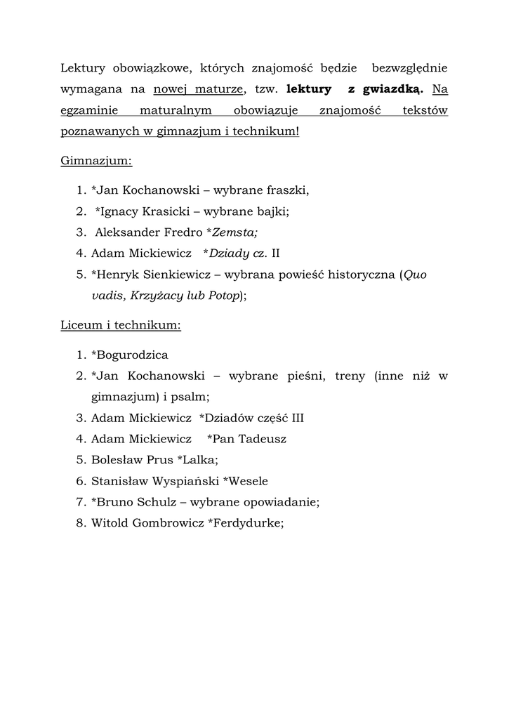 Lektury obowiązkowe, których znajomość będzie wymagana na nowej maturze, tzw. lektury egzaminie maturalnym obowiązuje bezwzględnie z gwiazdką. Na znajomość tekstów poznawanych w gimnazjum i technikum! Gimnazjum: 1. *Jan Kochanowski – wybrane fraszki, 2. *Ignacy Krasicki – wybrane bajki; 3. Aleksander Fredro *Zemsta; 4. Adam Mickiewicz *Dziady cz. II 5. *Henryk Sienkiewicz – wybrana powieść historyczna (Quo vadis, Krzyżacy lub Potop); Liceum i technikum: 1. *Bogurodzica 2. *Jan Kochanowski – wybrane pieśni, treny (inne niż w gimnazjum) i psalm; 3. Adam Mickiewicz *Dziadów część III 4. Adam Mickiewicz *Pan Tadeusz 5. Bolesław Prus *Lalka; 6. Stanisław Wyspiański *Wesele 7. *Bruno Schulz – wybrane opowiadanie; 8. Witold Gombrowicz *Ferdydurke;