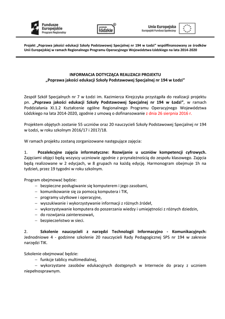 Projekt „Poprawa jakości edukacji Szkoły Podstawowej Specjalnej nr 194 w Łodzi” współfinansowany ze środków Unii Europejskiej w ramach Regionalnego Programu Operacyjnego Województwa Łódzkiego na lata 2014-2020 INFORMACJA DOTYCZĄCA REALIZACJI PROJEKTU „Poprawa jakości edukacji Szkoły Podstawowej Specjalnej nr 194 w Łodzi” Zespół Szkół Specjalnych nr 7 w Łodzi im. Kazimierza Kirejczyka przystąpiła do realizacji projektu pn. „Poprawa jakości edukacji Szkoły Podstawowej Specjalnej nr 194 w Łodzi”, w ramach Poddziałania XI.1.2 Kształcenie ogólne Regionalnego Programu Operacyjnego Województwa Łódzkiego na lata 2014-2020, zgodnie z umową o dofinansowanie z dnia 26 sierpnia 2016 r. Projektem objętych zostanie 55 uczniów oraz 20 nauczycieli Szkoły Podstawowej Specjalnej nr 194 w Łodzi, w roku szkolnym 2016/17 i 2017/18. W ramach projektu zostaną zorganizowane następujące zajęcia: 1. Pozalekcyjne zajęcia informatyczne: Rozwijanie u uczniów kompetencji cyfrowych. Zajęciami objęci będą wszyscy uczniowie zgodnie z przynależnością do zespołu klasowego. Zajęcia będą realizowane w 2 edycjach, w 8 grupach na każdą edycję. Harmonogram obejmuje 1h na tydzień, przez 19 tygodni w roku szkolnym. Program obejmować będzie: bezpieczne posługiwanie się komputerem i jego zasobami, komunikowanie się za pomocą komputera i TIK, programy użytkowe i operacyjne, wyszukiwanie i wykorzystywanie informacji z różnych źródeł, wykorzystywanie komputera do poszerzania wiedzy i umiejętności z różnych dziedzin, do rozwijania zainteresowań, bezpieczeństwo w sieci. 2. Szkolenie nauczycieli z narzędzi Technologii Informacyjno - Komunikacyjnych: Jednodniowe 4 - godzinne szkolenie 20 nauczycieli Rady Pedagogicznej SPS nr 194 w zakresie narzędzi TIK. Szkolenie obejmować będzie: funkcje tablicy multimedialnej, wykorzystane zasobów edukacyjnych dostępnych w Internecie do pracy z uczniem niepełnosprawnym. Projekt „Poprawa jakości edukacji Szkoły Podstawowej Specjalnej nr 194 w Łodzi” współfinansowany ze środków Unii Europejskiej w ramach Regionalnego Programu Operacyjnego Województwa Łódzkiego na lata 2014-2020 3. Studia podyplomowe z zakresu pedagogiki specjalnej, kwalifikacje z zakresu logopedii Ramowy opis programu nauczania obejmować będzie bloki: medyczny, psychologiczny, pedagogiczny, lingwistyczny i logopedyczny. z zakresu pedagogiki specjalnej - stosowana analiza zachowania Ramowy opis programu nauczania obejmować będzie: stosowana analiza zachowania w edukacji, diagnoza, terapia i zagadnienia etyczne w pracy z dziećmi z autyzmem, konstruowanie programów edukacyjno-terapeutycznych, umiejętności społeczne, metody oceny i techniki nauczania, zachowania trudne (ocena funkcjonalna, metody oddziaływań i kwestie etyczne). 4. Zajęcia specjalistyczne: zajęcia korekcyjno - kompensacyjne zajęcia logopedyczne zajęcia z gimnastyki korekcyjno - kompensacyjnej zajęcia dydaktyczno - wyrównawcze W ramach projektu zostaną zakupione następujące narzędzia: 1. Urządzenia do projekcji obrazu i emisji dźwięku (zestaw: tablica multimedialna, wideoprojektor z uchwytem, laptop z oprogramowaniem). Powyższe urządzenia będą do dyspozycji uczniów oraz nauczycieli SPS nr 194 w Łodzi. Wykorzystywanie będą do nauczania przedmiotowego i zajęć specjalistycznych. 2. Uposażenie pracowni szkoły SPS nr 194: zestaw pomocy dydaktycznych do wspomagania rozwoju i stymulacji polisensorycznej, multimedialne programy edukacyjne do wspomagania rozwoju i korygowania zaburzonych funkcji (zestaw logopedyczny), multimedialne programy edukacyjne do wspomagania rozwoju i korygowania zaburzonych funkcji (zestaw do zajęć korekcyjno - kompensacyjnych), zestaw pomocy dydaktycznych do wspomagania rozwoju i korygowania zaburzonych funkcji wzrokowych, słuchowych i mowy, zestaw pomocy dydaktycznych do wspomagania rozwoju i korygowania zaburzonych funkcji ruchowych, zestaw materiałów dydaktycznych. Projekt „Poprawa jakości edukacji Szkoły Podstawowej Specjalnej nr 194 w Łodzi” współfinansowany ze środków Unii Europejskiej w ramach Regionalnego Programu Operacyjnego Województwa Łódzkiego na lata 2014-2020 3. Przenośne wielofunkcyjne. komputery z oprogramowaniem, tablety i sieciowe urządzenia Narzędzia te będą stanowiły wyposażenie pracowni informatyczne SPS nr 194, z której będą korzystali wszyscy uczniowie. Tablety będą przeznaczone dla uczniów z zaburzeniami ruchowymi uniemożliwiającymi posługiwanie się klawiaturą i myszką (racjonalne usprawnienie). Urządzenie wielofunkcyjne będzie umożliwiało drukowanie, kopiowanie i skanowanie materiałów dydaktycznych dla uczniów. Kryteria kwalifikacji uczniów do zajęć w ramach projektu: Rekrutacja ma charakter zamknięty, jednocześnie będzie skierowana do wszystkich uczniów i nauczycieli SPS nr 194 w Łodzi. Wynika to z zaleceń poradni psychologiczno - pedagogicznych zawartych w orzeczeniach o potrzebie kształcenia specjalnego. Warunkiem przystąpienia do projektu będzie wypełnienie deklaracji przystąpienia do projektu (dla uczniów: zobowiązanie dotrzymanie obowiązku uczestnictwa w zajęciach; dla nauczycieli: zobowiązanie rzetelnego rozliczenia się z poniesionych kosztów). Łódź, dn. 01.09.2016 r. …………………………………………………….. (Podpis Dyrektora Szkoły)