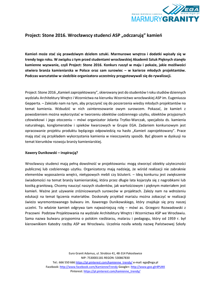 Project: Stone 2016. Wrocławscy studenci ASP „odczarują” kamień Kamień może stać się prawdziwym dziełem sztuki. Marmurowe wnętrza i dodatki wpisały się w trendy tego roku. W związku z tym przed studentami wrocławskiej Akademii Sztuk Pięknych stanęło kamienne wyzwanie, czyli Project: Stone 2016. Konkurs ruszył w maju i pokaże, jakie możliwości otwiera branża kamieniarska w Polsce oraz sam surowiec – w karierze młodych projektantów. Podczas warsztatów w siedzibie organizatora uczestnicy przygotowywali się do rywalizacji. Project: Stone 2016 „Kamień zaprojektowany”, skierowany jest do studentów I roku studiów dziennych wydziału Architektury Wnętrz i Wzornictwa na kierunku Wzornictwo wrocławskiej ASP im. Eugeniusza Gepperta. – Zależało nam na tym, aby przyczynić się do poszerzenia wiedzy młodych projektantów na temat kamienia. Wzbudzić w nich zainteresowanie owym surowcem. Pokazać, że kamień z powodzeniem można wykorzystać w tworzeniu obiektów codziennego użytku, obiektów przyjaznych człowiekowi i jego otoczeniu – mówi organizator Jolanta Trytko-Warczak, specjalista ds. kamienia naturalnego, konglomeratów i spieków kwarcowych w Grupie EGA. Zadaniem konkursowym jest opracowanie projektu produktu będącego odpowiedzią na hasło „Kamień zaprojektowany”. Prace mają stać się przykładem wykorzystania kamienia w nieoczywisty sposób. Być głosem w dyskusji na temat kierunków rozwoju branży kamieniarskiej. Xawery Dunikowski – inspiracją? Wrocławscy studenci mają pełną dowolność w projektowaniu: mogą stworzyć obiekty użyteczności publicznej lub codziennego użytku. Organizatorzy mają nadzieję, że wśród realizacji nie zabraknie elementów wyposażenia wnętrz, nietypowych mebli czy biżuterii. – Ideą konkursu jest zwiększenie świadomości na temat branży kamieniarskiej, która przez długie lata kojarzyła się z nagrobkami lub kostką granitową. Chcemy nauczyć naszych studentów, jak wartościowym i pięknym materiałem jest kamień. Ważne jest używanie zróżnicowanych surowców w projektach. Zależy nam na wdrożeniu edukacji na temat łączenia materiałów. Doskonały przykład mariażu można zobaczyć w realizacji świeżo wyremontowanego bulwaru im. Xawerego Dunikowskiego, który znajduje się przy naszej uczelni. To właśnie kamień odgrywa tam najważniejszą rolę – mówi as. Grzegorz Rozwadowski z Pracowni Podstaw Projektowania na wydziale Architektury Wnętrz i Wzornictwa ASP we Wrocławiu. Sama nazwa bulwaru przypomina o polskim rzeźbiarzu, malarzu i pedagogu, który od 1959 r. był kierownikiem Katedry rzeźby ASP we Wrocławiu. Uczelnia nosiła wtedy nazwę Państwowej Szkoły Euro Granit Adamus, ul. Strobice 41, 48-314 Pakosławice NIP: 7530001181 REGON: 530867830 Tel.: 666 550 666 https://pl.pinterest.com/kamienne_trendy/ e-mail: [email protected] Facebook: http://www.facebook.com/KamienneTrendy Google+: http://www.goo.glr4PUKK Pinterest: https://pl.pinterest.com/kamienne_trendy/ Sztuk Plastycznych we Wrocławiu. Jego najpopularniejsze prace wykonane z kamienia można zobaczyć w warszawskiej Królikarni, a pomniki znajdują się m.in. w Olsztynie i na Górze Świętej Anny. Warsztaty dla studentów Młodzi projektanci mogą szukać inspiracji nie tylko w twórczości Xawerego Dunikowskiego. Dwudziestu czterech studentów wzornictwa zostało zaproszonych przez organizatora – Grupę EGA, dystrybutora kamienia naturalnego, do głównego magazynu – hurtowni w Goleniowie, koło Szczecina. Podczas warsztatów studenci zdobyli praktyczną wiedzę na temat właściwości i zastosowania kamieni. W jednym miejscu, na powierzchni 5,5 tys. m², mogli zobaczyć różne ich rodzaje, charakteryzujące się mnogością kolorów i faktur. Podczas szkolenia poznali ich cechy fizyczne i proces obróbki. Dowiedzieli się też, jaki kamień warto wybrać do projektów, które skupiają się na sztuce użytkowej w przestrzeni publicznej, a jaki do wystroju wnętrz. Forma składania prac i jury Studenci na dostarczenie projektów mają czas do 31 maja. Do tego czasu mają przygotować koncepcje i wizualizacje swoich pomysłów na planszach w postaci szkiców i rysunków technicznych lub wizualizacji 3D zaprojektowanych produktów. W jury konkursu zasiądą przedstawiciele ASP we Wrocławiu: kierownik Katedry Wzornictwa dr hab. Piotr Jędrzejewski, prof. ASP oraz prof. Jan Kukuła z Pracowni Projektowania Narzędzi i Środowiska Pracy, oraz as. Grzegorz Rozwadowski z Pracowni Podstaw Projektowania. Z ramienia organizatora, w roli mentora, osoby edukującej przyszłych adeptów sztuki projektowania nt. kamienia naturalnego będzie Jolanta Trytko-Warczak, specjalista ds. kamienia naturalnego, konglomeratów i spieków kwarcowych w Grupie EGA. W zakresie oceny potencjału marketingowego przedstawionego produktu przez studentów opinie swoją wyrazi Jakub Wolff, Art Director w Grupie Me & My Friends. Grupa EGA jest otwarta na działanie z różnymi instytucjami na terenie Polski, a współpraca z Akademią Sztuk Pięknych ma szansę na rozwój. Uczelnia chętnie tworzy studentom warunki do zdobywania praktycznych umiejętności. Kolejne tematyczne warsztaty i spotkania ze specjalistami branży kamieniarskiej już są w planie. Studenci, którzy dopiero zaczynają zdobywanie wiedzy, mogą wybrać kierunek, w którym chcą się rozwijać. Kamień naturalny i materiały z nim związane mogą stać się inspiracją dla młodych projektantów poszukujących swojej niszy we współczesnym wzornictwie. Nagrody w konkursie Project: Stone 2016 również mają być ułatwieniem w zdobywaniu umiejętności. Dzięki profesjonalnym tabletom projekty artystów zyskają nowy wymiar. Patronat medialny na wydarzeniem objął Kurier Kamieniarski oraz Świat Kamienia. Euro Granit Adamus, ul. Strobice 41, 48-314 Pakosławice NIP: 7530001181 REGON: 530867830 Tel.: 666 550 666 https://pl.pinterest.com/kamienne_trendy/ e