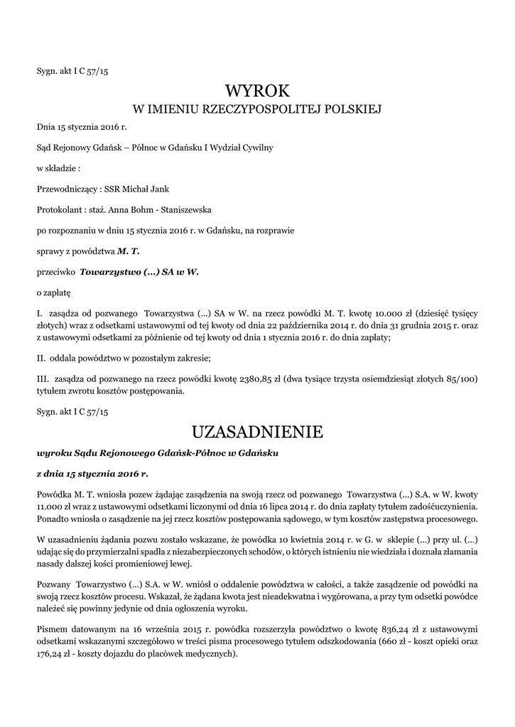 Sygn. akt I C 57/15 WYROK W IMIENIU RZECZYPOSPOLITEJ POLSKIEJ Dnia 15 stycznia 2016 r. Sąd Rejonowy Gdańsk – Północ w Gdańsku I Wydział Cywilny w składzie : Przewodniczący : SSR Michał Jank Protokolant : staż. Anna Bohm - Staniszewska po rozpoznaniu w dniu 15 stycznia 2016 r. w Gdańsku, na rozprawie sprawy z powództwa M. T. przeciwko Towarzystwo (...) SA w W. o zapłatę I. zasądza od pozwanego Towarzystwa (...) SA w W. na rzecz powódki M. T. kwotę 10.000 zł (dziesięć tysięcy złotych) wraz z odsetkami ustawowymi od tej kwoty od dnia 22 października 2014 r. do dnia 31 grudnia 2015 r. oraz z ustawowymi odsetkami za późnienie od tej kwoty od dnia 1 stycznia 2016 r. do dnia zapłaty; II. oddala powództwo w pozostałym zakresie; III. zasądza od pozwanego na rzecz powódki kwotę 2380,85 zł (dwa tysiące trzysta osiemdziesiąt złotych 85/100) tytułem zwrotu kosztów postępowania. Sygn. akt I C 57/15 UZASADNIENIE wyroku Sądu Rejonowego Gdańsk-Północ w Gdańsku z dnia 15 stycznia 2016 r. Powódka M. T. wniosła pozew żądając zasądzenia na swoją rzecz od pozwanego Towarzystwa (...) S.A. w W. kwoty 11.000 zł wraz z ustawowymi odsetkami liczonymi od dnia 16 lipca 2014 r. do dnia zapłaty tytułem zadośćuczynienia. Ponadto wniosła o zasądzenie na jej rzecz kosztów postępowania sądowego, w tym kosztów zastępstwa procesowego. W uzasadnieniu żądania pozwu zostało wskazane, że powódka 10 kwietnia 2014 r. w G. w sklepie (...) przy ul. (...) udając się do przymierzalni spadła z niezabezpieczonych schodów, o których istnieniu nie wiedziała i doznała złamania nasady dalszej kości promieniowej lewej. Pozwany Towarzystwo (...) S.A. w W. wniósł o oddalenie powództwa w całości, a także zasądzenie od powódki na swoją rzecz kosztów procesu. Wskazał, że żądana kwota jest nieadekwatna i wygórowana, a przy tym odsetki powódce należeć się powinny jedynie od dnia ogłoszenia wyroku. Pismem datowanym na 16 września 2015 r. powódka rozszerzyła powództwo o kwotę 836,24 zł z ustawowymi odsetkami wskazanymi szczegółowo w treści pisma procesowego tytułem odszkodowania (660 zł - koszt opieki oraz 176,24 zł - koszty dojazdu do placówek medycznych). Pozwana zakwestionowała rozszerzenie powództwa wskazując, że powódka nie wykazała zasadności poniesienia deklarowanych kosztów i związku z doznanymi obrażeniami. Sąd ustalił następujący stan faktyczny sprawy: J. T. prowadziła sklep (...) przy ul. (...) w G.. W sklepie znajduje się przymierzalnia, do której wchodzi się przez drewniane drzwi. Po wejściu do przymierzalni po lewej stronie znajdują się schody do piwnicy. W dniu 10 kwietnia 2014 r. około godziny 11:00 M. T. udała się do przymierzalni, w której było ciemno i nie zauważyła, że po prawej stronie znajdują się schody, z których spadła. Właścicielka nie informowała jej o schodach, a zejście do piwnicy nie było należycie zabezpieczone. (okoliczności bezsporne) W wyniku upadku M. T. doznała urazu lewego nadgarstka w postaci złamania nasady dalszej kości promieniowej lewej. Wykonano repozycję, a także założono unieruchomienie gipsowe naramienne na 4 tygodnie. W dniu 2 maja powódka była leczona operacyjnie z powodu destabilizacji odłamów, w czasie której zespolono odłamy płytką. Unieruchomienie w opatrunku gipsowym stosowano przez 2 tygodnie, zaś do 27 maja 2015 r. stosowano longetę. W czerwcu i listopadzie M. T. korzystała z rehabilitacji ręki (2 serie po 10 zabiegów). Po operacji odczuwała ból ręki i zażywała środki na jego uśmierzenie. M. T. cierpi na bóle nadgarstka, drętwienie palców I-III zwłaszcza rano i po wysiłku. Utrudnia to sprawowanie opieki nad chorą matką powódki, prace w ogrodzie, a także rekreacyjne uprawianie sportu. Możliwe jest jednak wykonywanie podstawowych czynności codziennych. Przez okres 3-4 miesięcy korzystała z pomocy osoby trzeciej. /dowód: zeznania powódki – k. 58-59 oraz 61; dokumentacja medyczna k. 41-51; opinia biegłego – k. 74-75/ Lewy nadgarstek jest nieco zniekształcony, o większym obwodzie niż prawy, zaś po stronie dłoniowej znajduje się blizna o długości 6 cm. Zakres ruchów nadgarstka lewego - wprost 30°, zgięcie 35° (prawego po 70°), odchylenie łokciowe w promieniowe po 10°. Obserwuje się niewielkie ograniczenei odwodzenia kciuka, nieco osłabioną siłę mięśni. U powódki wystąpiło przebyte złamanie nasady dalszej lewej kości promieniowej wygojone z średnim ograniczeniem ruchomości nadgarstka i jego odkształceniem, co uzasadnia kwalifikację 10% trwałego uszczerbek na zdrowiu Powódka odczuwa skutki wypadku do dzisiaj - największe ograniczenia w funkcjonowaniu ręki istniały w okresie pierwszych dwóch miesięcy. W okresie od 10 kwietnia do 16 maja wymagała pomocy innych osób w czynnościach dnia codziennego w wymiarze średnio 2 godzin dziennie. /dowód: dokumentacja medyczna - k. 41-51; opinia biegłego - k. 74 i 75) J. T. zawarła ubezpieczenie odpowiedzialności cywilnej z Towarzystwem (...) S.A. w W. na okres od 13 stycznia 2014 r. do 12 stycznia 2015 r. Powódka zgłosiła pozwanemu szkodę oraz żądanie zapłaty zadośćuczynienia. Towarzystwo (...) S.A uznało swoją odpowiedzialność i wypłaciło M. T. kwotę 9.000 zł tytułem zadośćuczynienia na podstawie decyzji z dnia 15 lipca 2014 r. Następnie powódka i pozwany prowadzili negocjacje w celu zawarcia ugody opiewającej na wyższą kwotę, jednakże ostatecznie nie doszło do jej zawarcia. (okoliczności bezsporne) Sąd zważył co następuje: Powództwo zasługuje na częściowe uwzględnienie . Stan faktyczny w sprawie był częściowo niesporny. W szczególności poza sporem był fakt zaistnienia zdarzenia, w którym powódka doznała określonego uszczerbku na zdrowiu, legitymacja bierna pozwanego oraz fakt wypłacenia powódce kwoty 9.000 zł tytułem zadośćuczynienia Przedmiotowy stan faktyczny Sąd ustali