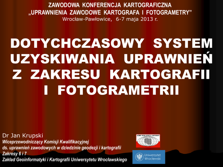 ZAWODOWA KONFERENCJA KARTOGRAFICZNA „UPRAWNIENIA ZAWODOWE KARTOGRAFA I FOTOGRAMETRY” Wrocław-Pawłowice, 6-7 maja 2013 r. DOTYCHCZASOWY SYSTEM UZYSKIWANIA UPRAWNIEŃ Z ZAKRESU KARTOGRAFII I FOTOGRAMETRII Dr Jan Krupski Wiceprzewodniczący Komisji Kwalifikacyjnej ds. uprawnień zawodowych w dziedzinie geodezji i kartografii Zakresy 6 i 7 Zakład Geoinformatyki i Kartografii Uniwersytetu Wrocławskiego Podstawy prawne: Ustawa Prawo geodezyjne i kartograficzne z dnia 17. 05. 1989 r. (ost. zmiany z 2010 r. Nr 76, poz. 489, Nr 106, poz. 675, Nr 193 poz. 1287 – tu tekst jednolity). - Rozdział 8 - Uprawnienia zawodowe do wykonywania samodzielnych funkcji w dziedzinie geodezji i kartografii; art. 42-47. Rozporządzenie Ministra Infrastruktury z dn. 30. 07. 2003 r. w sprawie uprawnień zawodowych w geodezji i kartografii (Dz. U. nr 143, poz. 1396) Wewnętrzne wytyczne organizacyjne działania komisji kwalifikacyjnej ds. uprawnień zawodowych w dziedzinie geodezji i kartografii. Główny Urząd Geodezji i Kartografii, grudzień 2004 r. (z późniejszymi zmianami). Rodzaje prac (minima) wymagane do uznania praktyki zawodowej Minima prac dla zakresu 6: 1. Projektowanie, zakładanie i aktualizacja baz danych systemów informacji geograficznej 2. Numeryczny model terenu – budowa, edycja i dostosowanie do różnych celów kartograficznych. 3. Opracowanie, redagowanie i aktualizacja map topograficznych i tematycznych lub opracowań pochodnych, w tym urzędowych map i atlasów, m.in. z wykorzystaniem ortofotomap, zdjęć lotniczych lub obrazów satelitarnych. 4. Reprodukowanie map i przygotowanie ich do druku. Rodzaje prac (minima) wymagane do uznania praktyki zawodowej Minima prac dla zakresu 7: 1. Fotogrametryczne zdjęcia lotnicze – projektowanie zdjęć i osnowy, wykonywanie zdjęć. 2. Aerotriangulacja – projektowanie, pomiary i wyrównanie. 3. Opracowanie numerycznego modelu rzeźby terenu i jego zastosowania. 4. Opracowanie ortofotomapy, stereodigitalizacja. 5. Fotogrametryczna aktualizacja map: zasadniczej, topograficznych i tematycznych. 6. Analiza (fotointerpretacja) , przetwarzanie (kalibracja) zdjęć lotniczych lub obrazów satelitarnych. Tryb postępowania kwalifikacyjnego Część wstępna 1. Badanie dokumentów i ich kompletności: a) wniosek o nadanie uprawnień zawodowych, b) potwierdzenie posiadanego wykształcenia (zgodnie z art. 44 ust. 1 pkt 1 lub art. 44 ust.1 pkt 2 ustawy), c) potwierdzenie praktyki zawodowej – wykaz osobiście wykonanych prac i opis wybranych prac, poświadczone przez pracodawcę, d) oświadczenie o niekaralności za przestępstwa przeciwko wiarygodności dokumentów, d) inne dokumenty mające wpływ na ocenę dotychczasowego dorobku zawodowego, w tym opinie pracodawców, e) dwie fotografie. Tryb postępowania kwalifikacyjnego Uznanie praktyki zawodowej - zgodność z zakresem uprawnień zawodowych o które występuje osoba zainteresowana - minimalny czas praktyki zawodowej wymaganej przepisami ustawy (3 lub 6 lat pracy w zawodzie od czasu uzyskania dyplomu ukończenia studiów). Tryb postępowania kwalifikacyjnego Część sprawdzająca 1. Część pisemna – 2 etapy 2. Część ustna 1 etap pisemny – test, 60 pytań, czas – 1 godz. zegarowa zaliczenie – minimum 41 punktów. Wyniki podawane do wiadomości w ciągu 2 godzin. Dozwolone korzystanie z opublikowanych przepisów prawnych, nie z „bryków”. Przykładowe pytania testowe Pytania testowe i opisowe dla poszczególnych zakresów, wykorzystane na egzaminach są opublikowane na stronie internetowej GUGiK. Przykładowe pytania testowe z ogólnych przepisów prawnych Osoba ubiegająca się o uprawnienia w zakresie geodezji i kartografii dokumentuje praktykę zawodową zaświadczeniem pracodawcy lub: a) poświadczeniem od zleceniodawców, b) wykazem prac z ośrodka dokumentacji geodezyjnej i kartograficznej, c) zaświadczeniem od geodety województwa, d) składa oświadczenie dotyczące praktyki zawodowej. Gdzie należy zgłaszać wykonanie prac geodezyjnych i kartograficznych? a) do Centralnego Ośrodka Dokumentacji Geodezyjnej i Kartograficznej, b) Wojewódzkiego Ośrodka Dokumentacji Geodezyjnej i Kartograficznej, c) Powiatowego Ośrodka Dokumentacji Geodezyjnej i Kartograficznej, d) Właściwego miejscowo i rzeczowo ośrodka. Tryb postępowania kwalifikacyjnego 2 etap pisemny – 3 pytania opisowe tematycznie związane z zakresem uprawnień. Czas – 1 godz. zegarowa. Punktacja – maksymalnie 7 pkt. za 1 odpowiedź, w tym 2 pkt. za podanie przepisów prawnych i technologicznych związanych z tematem odpowiedzi. Zaliczenie – minimum 15 punktów za wszystkie odpowiedzi. Także dozwolone korzystanie z opublikowanych materiałów pomocniczych Przykładowe pytania opisowe Pytania z zakresu szóstego w dniu 26 marca 2010 r. (Warszawa) 1. Proszę wymienić podstawowe źródła danych wektorowych i ogólne zasady ich wprowadzania do TBD, źródła nazw geograficznych i poprawności ich pisowni, dokładność opisu geometrycznego oraz opisać metodę wydzielania kompleksów użytkowania terenu w TBD. 2. Struktura państwowego zasobu geodezyjnego i kartograficznego, rodzaje gromadzonych materiałów kartograficznych i tryb ich udostępniania oraz kompetencje odpowiednich szczebli Służby Geodezyjnej i Kartograficznej w odniesieniu do zasobu. 3. Proszę wymienić i scharakteryzować rodzaje terenów zamkniętych i prac geodezyjnych i kartograficznych o szczególnym znaczeniu dla obronności kraju oraz podać przepisy prawa określające te prace i czynności z nimi związane. Przykładowe pytania opisowe Pytania z zakresu siódmego 1. W ostatnich zamówieniach publicznych Agencji Restrukturyzacji i Modernizacji Rolnictwa, związanych z modernizacją baz LPIS, wymaga się aby zdjęcia lotnicze były wykonane kamerą cyfrową. W związku z tym: (1) Czy polskie przepisy techniczne uwzględniają stosowanie kamer cyfrowych, jeśli nie to dlaczego? (2) Jakie są technologiczne konsekwencje zast