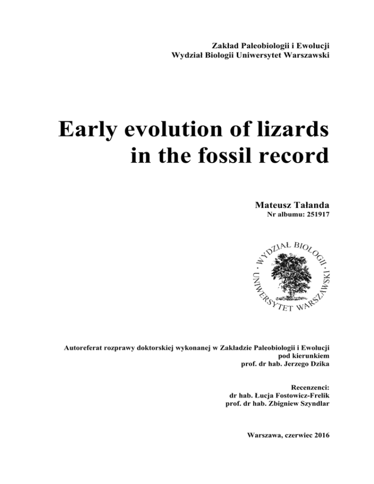 Zakład Paleobiologii i Ewolucji Wydział Biologii Uniwersytet Warszawski Early evolution of lizards in the fossil record Mateusz Tałanda Nr albumu: 251917 Autoreferat rozprawy doktorskiej wykonanej w Zakładzie Paleobiologii i Ewolucji pod kierunkiem prof. dr hab. Jerzego Dzika Recenzenci: dr hab. Łucja Fostowicz-Frelik prof. dr hab. Zbigniew Szyndlar Warszawa, czerwiec 2016 Gady łuskonośne, reprezentowane przez około 10 tysięcy gatunków, są jedną z najbardziej zróżnicowanych grup dzisiejszych kręgowców. Skolonizowały one wszystkie lądy i niektóre morza, z wyjątkiem regionów o bardzo chłodnym klimacie. Reprezentują szeroką gamę przystosowań do różnego pokarmu, strategii rozmnażania i rozmiarów ciała. W przeciwieństwie do ssaków, czy ptaków, ich początki pozostają niejasne. Hatterie są tradycyjnie uważane za bardziej prymitywne niż gady łuskonośne, a wiele aspektów ich anatomii za pierwotne dla obu grup. Najstarsze niekwestionowane kopalne jaszczurki (w tej pracy termin jaszczurki obejmuje wszystkie gady łuskonośne poza wężami) pochodzą z wczesnej jury. Hatterie są stosunkowo liczne w okresie triasowym, ale żadne niekwestionowane jaszczurki nie są znane z tego przedziału czasu. W efekcie szacunki dotyczące rozejścia się tych dwóch linii są bardzo szerokie, sięgające od 300 do 180 milionów lat. Najstarsze lepidozaury (gady łuskonośne i hatterie) mają zredukowany dolny łuk skroniowy i pleurodontyczne uzębienie. W ewolucji hatterii łuk ten został odtworzony, a ich zęby stały się akrodontyczne. Linia ewolucyjna jaszczurek prawdopodobnie zachowała stan plezjomorficzny w tych aspektach, ale zredukowała większość uzębienia na podniebieniu i wszystkie żebra brzuszne. Większość głównych grup jaszczurek dotrwała do naszych czasów, choć wiele z nich to obecnie relikty dawnego ich zróżnicowania a trzy duże grupy wymarły (Mosasauria, Polyglyphanodontidae i Pachyophidae). Dotychczas legwany (Iguania) były postrzegane jako dobry model pierwotnej czaszki jaszczurek. Dlatego badacze opierali swe rekonstrukcje zmian ewolucyjnych u początków gadów łuskonośnych na ich morfologii. Tak jak hatterie, mają one akinetyczne, sztywne czaszki i wzrokowo rozpoznają ofiary, którą chwytają za pomocą języka. Scleroglossa (grupa obejmująca wszystkie pozostałe jaszczurki) mają zwykle elastyczną czaszkę i traktowane są jako bardziej zaawansowane. Wiąże się to z chwytaniem ofiary szczękami. Rozbudowały one receptory chemiczne do wykrywania i rozpoznawania ofiar. Badania molekularne podważają ten pogląd, umieszczając legwany wśród najbardziej zaawansowanych gadów łuskonośnych (Serpentes i Anguimorpha). Sugerują one, że najprymitywniejszymi gadami łuskonośnymi są Dibamidae. To oznacza, że legwany rozwinęły swe zmysły i morfologię niezależnie od hatterii. Jednak dibamidy są wyspecjalizowane pod wieloma względami. Ich jedynymi cechami pierwotnymi mogą być wapienne skorupki jaj oraz nierozdwojony język. Prawdopodobnie niewiele cech pierwotnych zachowało się w ich szkielecie. Jako polemiczna wobec filogenetyki molekularnej, ogromna analiza morfologiczna została przeprowadzona przez zespół pod kierunkiem Gauthier’a (2012). Opierała się ona na tomografii komputerowej prawie 200 gatunków. Żadna cecha nie wsparła zaawansowanej pozycji legwanów (zwłaszcza blisko węży i Anguimorpha), natomiast przybyło argumentów za ich bazalną pozycją. Zatem, albo sekwencje nie zawierają właściwego sygnału filogenetycznego, albo dane morfologiczne o dzisiejszych gadach łuskonośnych nie są wiarygodne. Pomimo swej obecnej różnorodności, gady łuskonośne mogły zachować niewiele sygnałów filogenetycznych o ich ewolucji sprzed 200 milionów lat. Tylko zapis kopalny może rozstrzygnąć te rozbieżności. Jest on niekompletny, lecz rośnie z każdym rokiem. Szkielet triasowego lepidozaura Megachirella wachtleri, nieuwzględniony w wielu wcześniejszych analizach, może mieć kluczowe znaczenie. Jest ze środkowego triasu i wydaje się być morfologicznie blisko wspólnego przodka jaszczurek i hatterii. To, wraz z nowym materiałem z Polski, pozwala testować hipotezy na temat powstania i wczesnego różnicowania się lepidozaurów (Rozdział 1). Pokazuję w tym rozdziale, że do lepidozaurów należą znane wcześniej gady klasyfikowane poza, tą grupą. Paliguana, Megachirella i Marmoretta odpowiadają różnym stadiom ewolucji grupy pnia gadów łuskonośnych, a Sophineta może być blisko początków hatterii. To może oznaczać, że, pod względem filogenetycznym, pleurodontyczne lepidozaury są parafiletyczne do hatterii. Ich linia powstała prawdopodobnie już w permie. Następnym punktem spornym, który testuję przy użyciu materiału kopalnego, jest czas, miejsce i charakter powstania grupy koronnej gadów łuskonośnych (Dibamidae, Gekkota, Scincoidea, Lacertoidea, Iguania, Serpentes i Anguimorpha). Najbardziej oczywistą rozbieżnością między danymi morfologicznymi a molekularnymi jest to, która grupa miałaby pierwsza oddzielić się od pozostałych (legwany contra dibamidy). Natomiast oba zestawy danych zgadzają się, że drugim odgałęzieniem były gekony. Jest to zgodne z ich zapisem kopalnym sięgającym prawdopodobnie do jury. Następne powinny być scynkoidy lub lacertoidy, albo tworząc jeden klad według danych morfologicznych, albo oddzielając się osobno od pozostałych jaszczurek, jak pokazują dane molekularne. Wcześniejsze dane paleontologiczne sugerowały, że jurajskie i kredowe Paramacellodidae (jaszczurki pokryte prostokątnymi tarczkami kostnymi) są bazalnymi scynkoidami, podczas gdy najstarsze lacertoidy i koronne scynkoidy byłyby z kredy. Dla kontrastu, bardziej zaawansowane linie Anguimorpha i Serpentes sięgają aż do środkowej jury. Wcześniej nieznane, rozpoznane przeze mnie, aspekty anatomii późnojurajskiej jaszczurki Ardeosaurus brevipes (