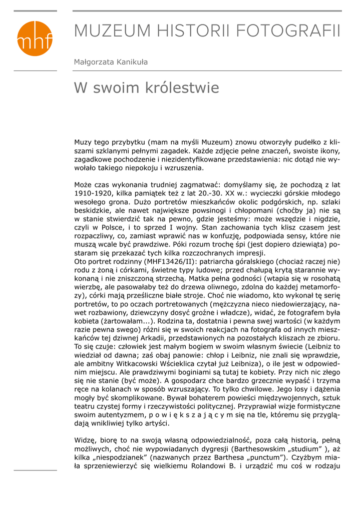 MUZEUM HISTORII FOTOGRAFII Małgorzata Kanikuła W swoim królestwie Muzy tego przybytku (mam na myśli Muzeum) znowu otworzyły pudełko z kliszami szklanymi pełnymi zagadek. Każde zdjęcie pełne znaczeń, swoiste ikony, zagadkowe pochodzenie i niezidentyfikowane przedstawienia: nic dotąd nie wywołało takiego niepokoju i wzruszenia. Może czas wykonania trudniej zagmatwać: domyślamy się, że pochodzą z lat 1910-1920, kilka pamiątek też z lat 20.-30. XX w.: wycieczki górskie młodego wesołego grona. Dużo portretów mieszkańców okolic podgórskich, np. szlaki beskidzkie, ale nawet największe powsinogi i chłopomani (choćby ja) nie są w stanie stwierdzić tak na pewno, gdzie jesteśmy: może wszędzie i nigdzie, czyli w Polsce, i to sprzed I wojny. Stan zachowania tych klisz czasem jest rozpaczliwy, co, zamiast wprawić nas w konfuzję, podpowiada sensy, które nie muszą wcale być prawdziwe. Póki rozum trochę śpi (jest dopiero dziewiąta) postaram się przekazać tych kilka rozczochranych impresji. Oto portret rodzinny (MHF13426/II): patriarcha góralskiego (chociaż raczej nie) rodu z żoną i córkami, świetne typy ludowe; przed chałupą krytą starannie wykonaną i nie zniszczoną strzechą. Matka pełna godności (wtapia się w rosohatą wierzbę, ale pasowałaby też do drzewa oliwnego, zdolna do każdej metamorfozy), córki mają prześliczne białe stroje. Choć nie wiadomo, kto wykonał tę serię portretów, to po oczach portretowanych (mężczyzna nieco niedowierzający, nawet rozbawiony, dziewczyny dosyć groźne i władcze), widać, że fotografem była kobieta (żartowałam...). Rodzina ta, dostatnia i pewna swej wartości (w każdym razie pewna swego) różni się w swoich reakcjach na fotografa od innych mieszkańców tej dziwnej Arkadii, przedstawionych na pozostałych kliszach ze zbioru. To się czuje: człowiek jest małym bogiem w swoim własnym świecie (Leibniz to wiedział od dawna; zaś obaj panowie: chłop i Leibniz, nie znali się wprawdzie, ale ambitny Witkacowski Wścieklica czytał już Leibniza), o ile jest w odpowiednim miejscu. Ale prawdziwymi boginiami są tutaj te kobiety. Przy nich nic złego się nie stanie (być może). A gospodarz chce bardzo grzecznie wypaść i trzyma ręce na kolanach w sposób wzruszający. To tylko chwilowe. Jego losy i dążenia mogły być skomplikowane. Bywał bohaterem powieści międzywojennych, sztuk teatru czystej formy i rzeczywistości politycznej. Przyprawiał wizje formistyczne swoim autentyzmem, p o w i ę k s z a j ą c y m się na tle, któremu się przyglądają wnikliwiej tylko artyści. Widzę, biorę to na swoją własną odpowiedzialność, poza całą historią, pełną możliwych, choć nie wypowiadanych dygresji (Barthesowskim „studium” ), aż kilka „niespodzianek” (nazwanych przez Barthesa „punctum”). Czyżbym miała sprzeniewierzyć się wielkiemu Rolandowi B. i urządzić mu coś w rodzaju tragicznej bitwy pod Roncesvalles? Te punkciki zapalne (choćby te ręce, spojrzenie w obiektyw, dłonie kobiet na ramieniu mężczyzny, piękna matka i jej powaga, wierzba rosnąca zamiast skrzydeł, uśmiech, inny jakiś, drugiej córki z głębi obrazu) tworzą konstelację takich intrygujących punktów. W kształcie Krzyża Południa akurat, jeśli już się tak bawimy. Mam się zdecydować na jedyne punctum? Proponuję w takim razie zaciekawioną (czym? fotografowaniem!) i uśmiechniętą drugą córkę. Nidy się nie dowiemy, czy siostry przeżyły wojnę jedną, drugą, czy nazywały się z domu Karamazow czy Wścieklica; czy założyły zakład fotograficzny, np., jak to zwykle górale, gdzieś nad morzem, choćby w Odessie, arkadyjskiej a rebours, jeśli tak, to mogło im być trochę ciężko, o ile nie sprzedawały też widokówek. Może któraś wyszła za mąż za fotografa (autora tego zdjęcia), o ile w domu nie było broni palnej, rzecz jasna. Zapraszamy do Muzeum. 2