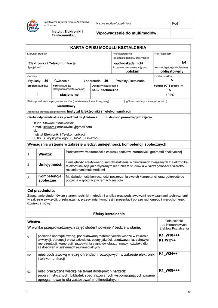 Państwowa Wyższa Szkoła Zawodowa w Gnieźnie Instytut Elektroniki i Telekomunikacji Nazwa modułu/przedmiotu Kod Wprowadzenie do multimediów KARTA OPISU MODUŁU KSZTAŁCENIA Kierunek studiów Profil kształcenia Rok / Semestr (ogólnoakademicki, praktyczny) 3/6 ogólnoakademicki Elektronika i Telekomunikacja Specjalność Przedmiot oferowany w języku: Kurs (obligatoryjny/obieralny) polskim obligatoryjny Liczba punktów Godziny Wykłady: 30 Stopień studiów: Ćwiczenia: Laboratoria: 30 Forma studiów (stacjonarna/niestacjonarna) I 5 Projekty / seminaria: Obszar(y) kształcenia Podział ECTS (liczba i %) nauki techniczne 5 100% stacjonarne Status przedmiotu w programie studiów (podstawowy, kierunkowy, inny) Liczba punktów (ogólnouczelniany, z innego kierunku) Kierunkowy Jednostka prowadząca przedmiot: Instytut xx Elektroniki i Telekomunikacji Osoba odpowiedzialna za przedmiot / wykładowca: xxx Lista osób prowadzących zajęcia: Dr inż. Sławomir Maćkowiak e-mail: [email protected] tel. Instytut Elektroniki i Telekomunikacji ul. Ks. S. Wyszyńskiego 36, 62-200 Gniezno Wymagania wstępne w zakresie wiedzy, umiejętności, kompetencji społecznych: Podstawowe wiadomości z zakresu podstaw informatyki i geometrii analitycznej 1 Wiedza: 2 Umiejętności: telekomunikacją jako wybranym kierunkiem studiów a w szczególności z szeroko Umiejętność efektywnego samokształcenia w dziedzinach związanych z elektroniką i rozumianymi multimediami 3 Kompetencje społeczne Ma świadomość konieczności poszerzania swoich kompetencji oraz gotowość do podjęcia współpracy w ramach zespołu Cel przedmiotu: Zapoznanie studentów ze stanem techniki, metodami analizy oraz podstawowymi rozwiązaniami technicznymi w zakresie akwizycji, przetwarzania, przesyłania, kompresji i prezentacji obrazu ruchomego i nieruchomego, dźwięku i mowy. Efekty kształcenia Wiedza. W wyniku przeprowadzonych zajęć student powinien/ będzie w stanie: 01 02 03 1 posiadać uporządkowaną, podbudowaną matematycznie wiedzę w zakresie akwizycji, percepcji przez człowieka, oceny jakości, przetwarzania, cyfrowych reprezentacji, kompresji i przesyłania sygnałów obrazu, mowy i dźwięku dla zastosowań w systemach multimedialnych Odniesienie do Kierunkowych Efektów Kształcenia K1_W10+++ K1_W17++ mieć podstawową wiedzę o trendach rozwojowych w zakresie elektroniki K1_W24++ i telekomunikacji mieć praktyczną wiedzę na temat dostępnych narzędzi programistycznych, bibliotek specjalizowanych wspomagających pisanie oprogramowanie dla zastosowań multimedialnych. K1_W08+++ 41 Państwowa Wyższa Szkoła Zawodowa w Gnieźnie Instytut Elektroniki i Telekomunikacji Nazwa modułu/przedmiotu Kod Wprowadzenie do multimediów Umiejętności. W wyniku przeprowadzonych zajęć student będzie potrafił: Odniesienie do Kierunkowych Efektów Kształcenia 01 rozwiązywać podstawowe problemy związane ze stanem techniki, metodami analizy oraz podstawowymi rozwiązaniami technicznymi w zakresie akwizycji, przetwarzania, przesyłania, kompresji i prezentacji obrazu ruchomego i nieruchomego, dźwięku i mowy; K1_U07+++ K1_U12+++ K1_U17++ 02 określić wymagania dla systemu realizującego podstawowe zadania związane z multimediami K1_U13+++ 03 rozumieć podstawowe postanowienia odpowiednich norm międzynarodowych. K1_U01++ K1_U05+ Kompetencje społeczne. W wyniku przeprowadzonych zajęć student zdobędzie następujące kompetencje: 01 Rozumie potrzebę permanentnego kształcenia się i przekazywania w sposób zrozumiały informacji z najbliższym otoczeniem w działalności zawodowej. 02 Ma poczucie odpowiedzialności za zaprojektowane systemy elektroniczne i telekomunikacyjne. Odniesienie do Kierunkowych Efektów Kształcenia K1_K01 K1_K04 Sposoby sprawdzenia efektów kształcenia Wykład pisemny test – sprawdzenie wiedzy (6 pytań), Ćwiczenia laboratoryjne: sprawdzian i premiowanie przyrostu wiedzy niezbędnej do realizacji postawionych problemów w danym obszarze tematyki przedmiotu; ocenianie ciągłe, na każdych zajęciach - premiowanie przyrostu umiejętności posługiwania się poznanymi zasadami i metodami; ocena poprawności działania w ramach pracy własnej. Uzyskiwanie punktów dodatkowych za aktywność podczas zajęć, a szczególnie za: efektywność zastosowania zdobytej wiedzy podczas rozwiązywania zadanego problemu; uwagi związane z udoskonaleniem materiałów dydaktycznych; staranność estetyczną opracowywanych sprawozdań i zadań – w ramach nauki własnej; Treści programowe 2 41 Państwowa Wyższa Szkoła Zawodowa w Gnieźnie Instytut Elektroniki i Telekomunikacji Nazwa modułu/przedmiotu Kod Wprowadzenie do multimediów Wykłady: - podstawy przetwarzania sygnałów dwuwymiarowych - podstawy techniki obrazu - reprezentacja i kompresja obrazu ruchomego i nieruchomego - podstawy techniki dźwięku i mowy Ćwiczenia laboratoryjne: - ćwiczenia laboratoryjne dotyczą wybranych zagadnień z zakresu wykładów. Literatura podstawowa: 1. Domański, Zaawansowane techniki kompresji obrazów i sekwencji wizyjnych, Wydawnictwo Politechniki Poznańskiej, 2000 2. Domański M., Obraz cyfrowy, WKŁ, Warszawa 2010. 3. ITU-R Rec., BT.500-1, Methodology for the subjective assessment of the quality of television pictures, 2002. 4. Zieliński T., Cyfrowe przetwarzanie sygnałów. Od teorii do zastosowań, WKŁ, Warszawa 2005. Literatura uzupełniająca: 1. ITU-T Rec., H.264, Advanced video coding for generic audiovisual service, 2003. 2. ISO/IEC IS 13818 / ITU-T Rec. H.262, Information technology – Generic coding of moving pictures and associated audio information, 1997 3. Iain E.G. Richardson, Video Codec Design, John Wiley & Sons Ltd., 2002 4. Klonecki W.: Statystyka dla inżynierów. Wydawnictwo Naukowe PWN SA, Warszawa, 1999 5. Sobczyk M.: Statystyka. Wydawnictwo Naukowe PWN SA, Warszawa, 2002 Obciążenie pracą studenta forma aktywności godzin Łączny nakład pracy 128 Zajęcia wymagające indywi