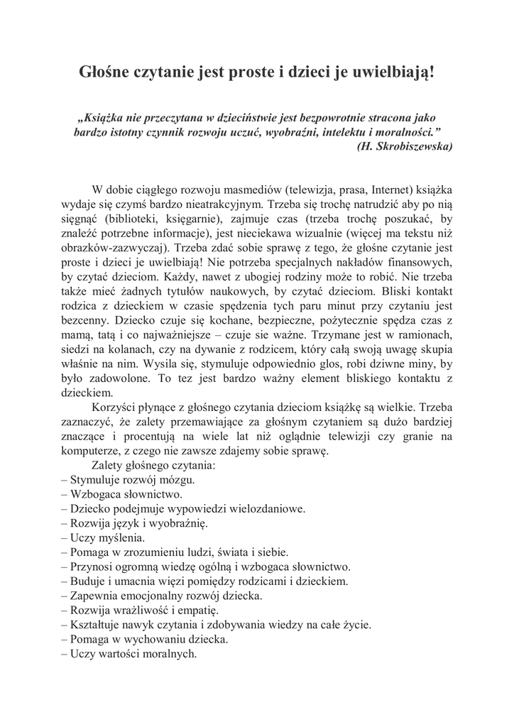Głośne czytanie jest proste i dzieci je uwielbiają! „Książka nie przeczytana w dzieciństwie jest bezpowrotnie stracona jako bardzo istotny czynnik rozwoju uczuć, wyobraźni, intelektu i moralności.” (H. Skrobiszewska) W dobie ciągłego rozwoju masmediów (telewizja, prasa, Internet) książka wydaje się czymś bardzo nieatrakcyjnym. Trzeba się trochę natrudzić aby po nią sięgnąć (biblioteki, księgarnie), zajmuje czas (trzeba trochę poszukać, by znaleźć potrzebne informacje), jest nieciekawa wizualnie (więcej ma tekstu niż obrazków-zazwyczaj). Trzeba zdać sobie sprawę z tego, że głośne czytanie jest proste i dzieci je uwielbiają! Nie potrzeba specjalnych nakładów finansowych, by czytać dzieciom. Każdy, nawet z ubogiej rodziny może to robić. Nie trzeba także mieć żadnych tytułów naukowych, by czytać dzieciom. Bliski kontakt rodzica z dzieckiem w czasie spędzenia tych paru minut przy czytaniu jest bezcenny. Dziecko czuje się kochane, bezpieczne, pożytecznie spędza czas z mamą, tatą i co najważniejsze – czuje sie ważne. Trzymane jest w ramionach, siedzi na kolanach, czy na dywanie z rodzicem, który całą swoją uwagę skupia właśnie na nim. Wysila się, stymuluje odpowiednio glos, robi dziwne miny, by było zadowolone. To tez jest bardzo ważny element bliskiego kontaktu z dzieckiem. Korzyści płynące z głośnego czytania dzieciom książkę są wielkie. Trzeba zaznaczyć, że zalety przemawiające za głośnym czytaniem są dużo bardziej znaczące i procentują na wiele lat niż oglądnie telewizji czy granie na komputerze, z czego nie zawsze zdajemy sobie sprawę. Zalety głośnego czytania: – Stymuluje rozwój mózgu. – Wzbogaca słownictwo. – Dziecko podejmuje wypowiedzi wielozdaniowe. – Rozwija język i wyobraźnię. – Uczy myślenia. – Pomaga w zrozumieniu ludzi, świata i siebie. – Przynosi ogromną wiedzę ogólną i wzbogaca słownictwo. – Buduje i umacnia więzi pomiędzy rodzicami i dzieckiem. – Zapewnia emocjonalny rozwój dziecka. – Rozwija wrażliwość i empatię. – Kształtuje nawyk czytania i zdobywania wiedzy na całe życie. – Pomaga w wychowaniu dziecka. – Uczy wartości moralnych. – Wpływa na zmianę negatywnych postaw na pozytywne. – Uczy nieagresywnych sposobów rozwiązywania problemów i konfliktów. – Ułatwia samodzielne czytanie, daje podwaliny pod sukces w mówieniu i pisaniu. – Głośne czytanie dziecku od najmłodszych lat ułatwia samodzielne czytanie, daje podwaliny pod sukces w edukacji szkolnej, (dzieciom, którym czyta się głośno już od najmłodszych lat, łatwiej przychodzi nauka, także w szkole). – Rozbudza zainteresowania. – Tworzy skojarzenie czytania z przyjemnością i poczuciem bezpieczeństwa. – Buduje samouznanie – dziecko czuje się ważne, kochane i coraz bardziej kompetentne. – Chroni przed uzależnieniem od telewizji i absorbowaniem z niej antywartości. – Jest najlepszą inwestycją w pomyślną przyszłość dziecka. Lista książek szczególnie polecanych przez Fundację ABCXXI która rozpoczęła akcję „Cała Polska Czyta Dzieciom”: Wiek 0-4 lata: Marta Bogdanowicz (opracowanie) – Rymowanki-przytulanki Paulette Bourgeois, Brenda Clark – seria o Franklinie Jan Brzechwa – Wiersze i bajki Josef Czapek – Opowieści o piesku i kotce Karel Czapek – Daszeńka Gilbert Delahaye – seria o Martynce Dorota Gellner – Bajeczki Czesław Janczarski – Miś Uszatek, Wędrówki Misia Uszatka Janosch – Ach, jak cudowna jest Panama Astrid Lindgren – Lotta z ulicy Awanturników; Ja też chcę mieć rodzeństwo Hanna Łochocka – O wróbelku Elemelku Sam McBratney – Nawet nie wiesz, jak bardzo Cię kocham Nele Most, Annet Rudolph – Wszystko moje; Co wolno, a czego nie wolno Beata Ostrowicka – Lulaki, Pan Czekoladka i przedszkole Julian Tuwim – Wiersze dla dzieci Wiek 4-6 lat: Hans Christian Andersen – Brzydkie Kaczątko Florence and Richard Atwater – Pingwiny Pana Poppera Wanda Chotomska – Wiersze, Pięciopsiaczki Carlo Collodi – Pinokio Waclaw Cztwrtek – O gajowym Chrobotku; Bajki z mchu i paproci Dimiter Inkiow – Ja i moja siostra Klara Astrid Lindgren – seria o Pipi Pończoszance, Emil ze Smolandii Hugh Lofting – seria o Doktorze Dolittle Kornel Makuszyński – Przygody Koziołka Matołka Małgorzata Musierowicz – Znajomi z zerówki Alan A. Milne – Kubuś Puchatek, Chatka Puchatka Zofia Rogoszówna – Dzieci Pana Majstra Krystyna Siesicka – Idzie Jaś Małgorzata Strzałkowska – Leśne głupki; Wierszyki łamiące języki Danuta Wawiłow – Wiersze Wiek 6-8 lat: Marcin Brykczyński – Ni pies, ni wydra Jan Brzechwa – Pchła Szachrajka; Szelmostwa Lisa Witalisa, Akademia Pana Kleksa Frances Hodgson Burnett – Mała księżniczka Tove Jansson – seria o Muminkach Astrid Lingren – Dzieci z Bullerbyn; Mio, mój Mio Mira Lobbe – Babcia na jabłoni Anna Onichimowska – Najwyższa góra świata Stanisław Pagaczewski – Porwanie Baltazara Gąbki Dr. Seuss – Słoń, który wysiedział jajo Anna Sójka – Czytam od A do Z M. Strzałkowska – Rady nie od parady Anne-Cath. Westly – Sekret Taty i ciężarówka Jan Whybrow – Księga straszliwej niegrzeczności, Małego Wilczka księga wilkoczynów Piotr Wojciechowski – Z kufra pana Pompuła Wojciech Żukrowski – Porwanie w Tiutiurlistanie. Opracowała Joanna Gawron i Iwona Stefaniuk