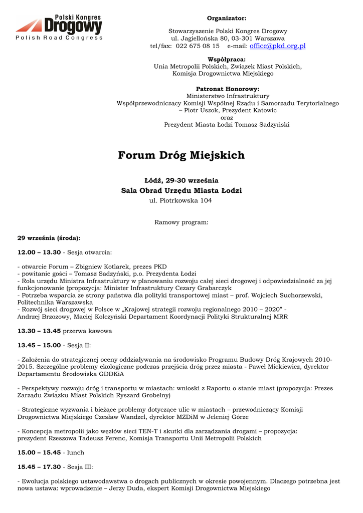 Organizator: Stowarzyszenie Polski Kongres Drogowy ul. Jagiellońska 80, 03-301 Warszawa tel/fax: 022 675 08 15 e-mail: [email protected] Współpraca: Unia Metropolii Polskich, Związek Miast Polskich, Komisja Drogownictwa Miejskiego Patronat Honorowy: Ministerstwo Infrastruktury Współprzewodniczący Komisji Wspólnej Rządu i Samorządu Terytorialnego – Piotr Uszok, Prezydent Katowic oraz Prezydent Miasta Łodzi Tomasz Sadzyński Forum Dróg Miejskich Łódź, 29-30 września Sala Obrad Urzędu Miasta Łodzi ul. Piotrkowska 104 Ramowy program: 29 września (środa): 12.00 – 13.30 - Sesja otwarcia: - otwarcie Forum – Zbigniew Kotlarek, prezes PKD - powitanie gości – Tomasz Sadzyński, p.o. Prezydenta Łodzi - Rola urzędu Ministra Infrastruktury w planowaniu rozwoju całej sieci drogowej i odpowiedzialność za jej funkcjonowanie (propozycja: Minister Infrastruktury Cezary Grabarczyk - Potrzeba wsparcia ze strony państwa dla polityki transportowej miast – prof. Wojciech Suchorzewski, Politechnika Warszawska - Rozwój sieci drogowej w Polsce w „Krajowej strategii rozwoju regionalnego 2010 – 2020” Andrzej Brzozowy, Maciej Kolczyński Departament Koordynacji Polityki Strukturalnej MRR 13.30 – 13.45 przerwa kawowa 13.45 – 15.00 - Sesja II: - Założenia do strategicznej oceny oddziaływania na środowisko Programu Budowy Dróg Krajowych 20102015. Szczególne problemy ekologiczne podczas przejścia dróg przez miasta - Paweł Mickiewicz, dyrektor Departamentu Środowiska GDDKiA - Perspektywy rozwoju dróg i transportu w miastach: wnioski z Raportu o stanie miast (propozycja: Prezes Zarządu Związku Miast Polskich Ryszard Grobelny) - Strategiczne wyzwania i bieżące problemy dotyczące ulic w miastach – przewodniczący Komisji Drogownictwa Miejskiego Czesław Wandzel, dyrektor MZDiM w Jeleniej Górze - Koncepcja metropolii jako węzłów sieci TEN-T i skutki dla zarządzania drogami – propozycja: prezydent Rzeszowa Tadeusz Ferenc, Komisja Transportu Unii Metropolii Polskich 15.00 – 15.45 - lunch 15.45 – 17.30 - Sesja III: - Ewolucja polskiego ustawodawstwa o drogach publicznych w okresie powojennym. Dlaczego potrzebna jest nowa ustawa: wprowadzenie – Jerzy Duda, ekspert Komisji Drogownictwa Miejskiego - Koncepcja zmiany ustawy o drogach publicznych na ustawę o drogach, placach i ulicach publicznych Jan Friedberg, ekspert Unii Metropolii Polskich - Prezentacja powstających projektów zmiany ustawy o drogach publicznych - Dyskusja 17.30 – 17.40 - przerwa kawowa 17.40 – 18.40 - Sesja IV: Panel Dyskusyjny „Współdziałanie zarządców dróg różnych szczebli – teoria i praktyka”. Uczestnicy: zarządcy dróg krajowych i samorządowych, m.in. Dariusz Joński, wiceprezydent Łodzi, Zbigniew Paliński, dyrektor łódzkiego oddziału GDDKiA, Zbigniew Tabor, dyrektor Zarządu Dróg Wojewódzkich w Katowicach. Moderator: prof. Wojciech Suchorzewski 20.00 - Wieczór drogowca (Klub Spadkobierców) 30 września (czwartek): 10.00 -12.00 - Sesja V: - Przepisy techniczne i standardy dotyczące ulic: potrzeba zmian – prof. Tadeusz Sandecki, Politechnika Warszawska - Nowe centrum Łodzi: biznesowe, kulturalne i transportowe serce metropolii - Maciej Winsche, dyrektor Zarządu Dróg i Transportu w Łodzi -Trasa Górna jako największa inwestycja drogowa Łodzi: wyzwanie dla inwestora i wykonawcy Piotr Palmowski, Mosty Łódź - Rozwiązywanie problemów z hałasem w miastach na przykładzie Programu Ochrony Przed Hałasem dla Krakowa - dr Janusz Bohatkiewicz, EKKOM 12.00 – 12.20 - przerwa kawowa 12.20 – 14.30 -Sesja VI: - Innowacyjne nawierzchnie ulic - prof. Dariusz Sybilski, Instytut Badawczy Dróg i Mostów - Nowoczesne rozwiązania informacji przestrzennej GIS perspektywą zarządzania przestrzenią publiczną w miastach – Janusz Koper, pełnomocnik prezydenta Rybnika do spraw dróg i gospodarki komunalnej - Systemy zarządzania ruchem i ich wdrażanie w polskich miastach" - Piotr Krukowski, Zarząd Dróg i Utrzymania Miasta we Wrocławiu - Potrzeby rozwoju infrastruktury dla komunikacji rowerowej w miastach" - Cezary Grochowski, Ogólnopolska Sieć Organizacji Rowerowych Miasta dla Rowerów - Specyfika zagrożeń dla bezpieczeństwa ruchu w miastach - Przedstawienie propozycji wniosków Forum - Dyskusja 14.30 - Lunch, zakończenie Forum Warunkiem uczestnictwa w Forum jest przesłanie wypełnionej karty zgłoszenia i dokonanie wpłaty w wysokości: - 700 zł netto (854 zł z VAT*) – członkowie PKD**, przedstawiciele jednostek samorządowych i sfery budżetowej - 600 zł netto (732 zł z VAT*) – członkowie PKD**, przedstawiciele jednostek samorządowych i sfery budżetowej, w przypadku zgłoszenia przez podmiot każdego następnego uczestnika oraz Partnerzy FDM, w zakresie podanym w pakietach partnerskich - 950 zł netto (1159 z VAT*) – pozostali uczestnicy - 800 zł netto (976 z VAT*) – pozostali uczestnicy, w przypadku zgłoszenia przez firmę każdego następnego uczestnika * stawka VAT – 22% ** pod warunkiem braku zaległości z tytułu składek członkowskich Wpłaty należy kierować na konto: Stowarzyszenie Polski Kongres Drogowy Alior Bank S.A. 77 2490 0005 0000 4520 9168 6331 w terminie do 22 września 2010 r. Opłata obejmuje: udział w dwudniowej konferencji, lunch 29 i 30 września, przerwy kawowe, udział w uroczystej kolacji „Wieczór drogowca” w dniu 29 września oraz materiały konferencyjne. Uwaga: uczestnicy przybywają do Łodzi na własny koszt, a także samodzielnie dokonują rezerwacji noclegów. Lista rekomendowanych hoteli: Andel's Hotel, ul. Ogrodowa 17, 91-065 Łódź, tel.( 42) 299 0045, www.andelslodz.com.pl , **** Qubus Hotel , aleja Adama Mickiewicza 7, 90-443 Łódź tel.: (42) 275 5100, [email protected] , *** Hotel Campanile, al. Piłsudskiego 27, 90-307 Łódź, tel. (42) 664 2600, www.campanile-lodz.pl, Hotel Ibis, al. Piłsudskiego 11, 90-368 Łódż, tel. (42) 638 67 77, www.accorhotels.com Hotel Foc
