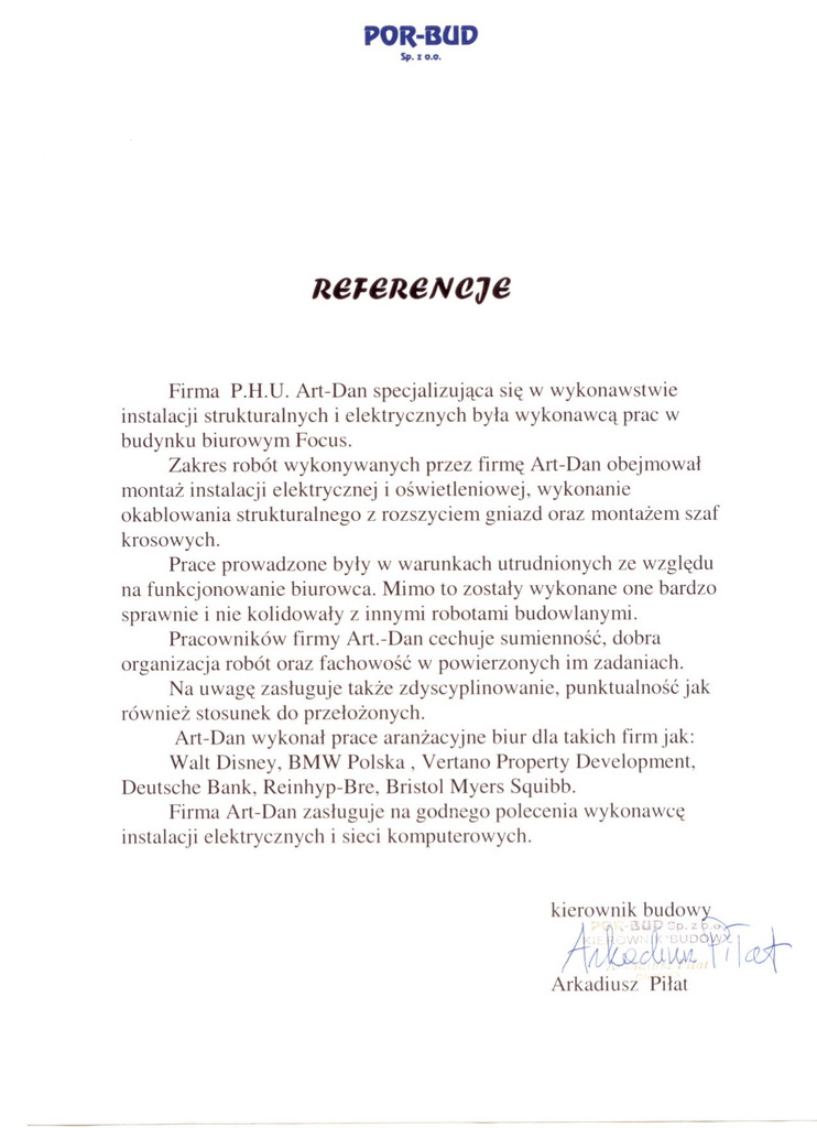 POR-BUD Sp. z 0.0. ne'leneNlJ,;/e Firma P.H.U. Art-Dan specjalizujaca sie w wykonawstwie instalacji strukturalnych ielektrycznych byla wykonawca prac w budynku biurowym Focus. Zakres robót wykonywanych przez firme Art-Dan obejn10wal montaz instalacji elektrycznej ioswietleniowej, wykonanie okablowania strukturalnego zrozszyciem gniazd oraz montazem szaf krosowych. Prace prowadzone byly wwarunkach utrudnionych zewzgledu nafunkcjonowanie biurowca. Mimo to zostaly wykonane one bardzo sprawnie inie kolidowaly zinnymi robotami budowlanymi. Pracowników firmy Art.-Dan cechuje sumiennosc, dobra organizacja robót oraz fachowosc w powierzonych im zadaniach. Na uwage zasluguje takze zdyscyplinowanie, punktualnosc jak równiez stosunek do przelozonych. Art-Dan wykonal prace aranzacyjne biur dla takich firmjak: Walt Disney, BMW Polska, Vertano Property Oevelopment, Oeutsche Bank, Reinhyp-Bre, Bristol Myers Squibb. Firma Art-Oan zasluguje nagodnego polecenia wykonawce instalacji elektrycznych isieci komputerowych. kierowni~ bll~ow~ _ A~~~~f1T~ Arkadiusz Pilat