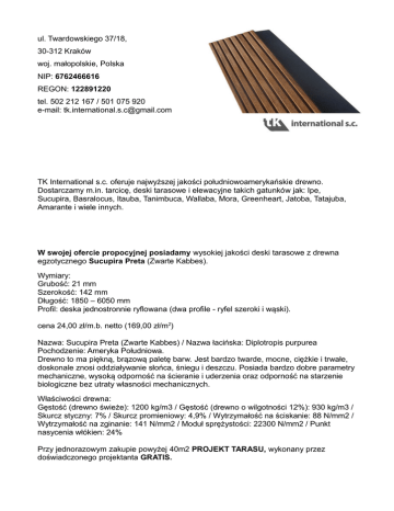 ul. Twardowskiego 37/18, 30-312 Kraków woj. małopolskie, Polska NIP: 6762466616 REGON: 122891220 tel. 502 212 167 / 501 075 920 e-mail: [email protected] TK International s.c. oferuje najwyższej jakości południowoamerykańskie drewno. Dostarczamy m.in. tarcicę, deski tarasowe i elewacyjne takich gatunków jak: Ipe, Sucupira, Basralocus, Itauba, Tanimbuca, Wallaba, Mora, Greenheart, Jatoba, Tatajuba, Amarante i wiele innych. W swojej ofercie propocyjnej posiadamy wysokiej jakości deski tarasowe z drewna egzotycznego Sucupira Preta (Zwarte Kabbes). Wymiary: Grubość: 21 mm Szerokość: 142 mm Długość: 1850 – 6050 mm Profil: deska jednostronnie ryflowana (dwa profile - ryfel szeroki i wąski). cena 24,00 zł/m.b. netto (169,00 zł/m2) Nazwa: Sucupira Preta (Zwarte Kabbes) / Nazwa łacińska: Diplotropis purpurea Pochodzenie: Ameryka Południowa. Drewno to ma piękną, brązową paletę barw. Jest bardzo twarde, mocne, ciężkie i trwałe, doskonale znosi oddziaływanie słońca, śniegu i deszczu. Posiada bardzo dobre parametry mechaniczne, wysoką odporność na ścieranie i uderzenia oraz odporność na starzenie biologiczne bez utraty własności mechanicznych. Właściwości drewna: Gęstość (drewno świeże): 1200 kg/m3 / Gęstość (drewno o wilgotności 12%): 930 kg/m3 / Skurcz styczny: 7% / Skurcz promieniowy: 4,9% / Wytrzymałość na ściskanie: 88 N/mm2 / Wytrzymałość na zginanie: 141 N/mm2 / Moduł sprężystości: 22300 N/mm2 / Punkt nasycenia włókien: 24% Przy jednorazowym zakupie powyżej 40m2 PROJEKT TARASU, wykonany przez doświadczonego projektanta GRATIS. Dostępne profile: Galeria zdjęć: Sucupira Preta (Zwarte Kabbes) - realizacja Kraków 2015 Sucupira Preta (Zwarte Kabbes) - realizacja Brzesko 2014 Sucupira Preta (Zwarte Kabbes)