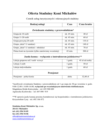 Oferta Stadniny Koni Michałów Cennik usług turystycznych i rekreacyjnych stadniny Rodzaj usługi Czas Cena brutto Zwiedzanie stadniny z przewodnikiem* Grupa do 10 osób ok. 45 min. 40 zł Grupa 11-20 osób ok. 45 min. 60 zł Grupa powyżej 20 osób ok. 45 min. 110 zł Grupa „duża” (1 autokar) ok. 45 min. 140 zł Grupa „duża” (1 autokar) - młodzież ok. 45 min. 70 zł 45 min. 300 zł Pokaz koni na życzenie (tylko zamówiony wcześniej) Jazda konna – wyłącznie z instruktorem jeździectwa** Lekcja grupowa od 3 osób wzwyż 1 godz. 45 zł od osoby Lekcja 2 osób 1 godz. 50 zł Lekcja indywidualna 1 godz. 60 zł doba 32,40 zł Pensjonat Pensjonat – pobyt konia *możliwość zwiedzania Stadniny z przewodnikiem od 1-go maja do 30-go września w godz. 9:00-12:00 i 14:00-16:00, wyłącznie po wcześniejszym umówieniu telefonicznym. Magdalena Helak-Kulczyńska – tel. 693 900 089 Agnieszka Kozłowska – tel. 607 090 919 **W sprawie jazdy konnej prosimy kontaktować się bezpośrednio z instruktorem jeździectwa Krzysztofem Cyrą – tel. 692 186 872 Stadnina Koni Michałów Sp. z o.o. 28-411 Michałów tel. (41) 356 54 05 fax (41) 356 54 06 [email protected] www.stadninamichalow.pl