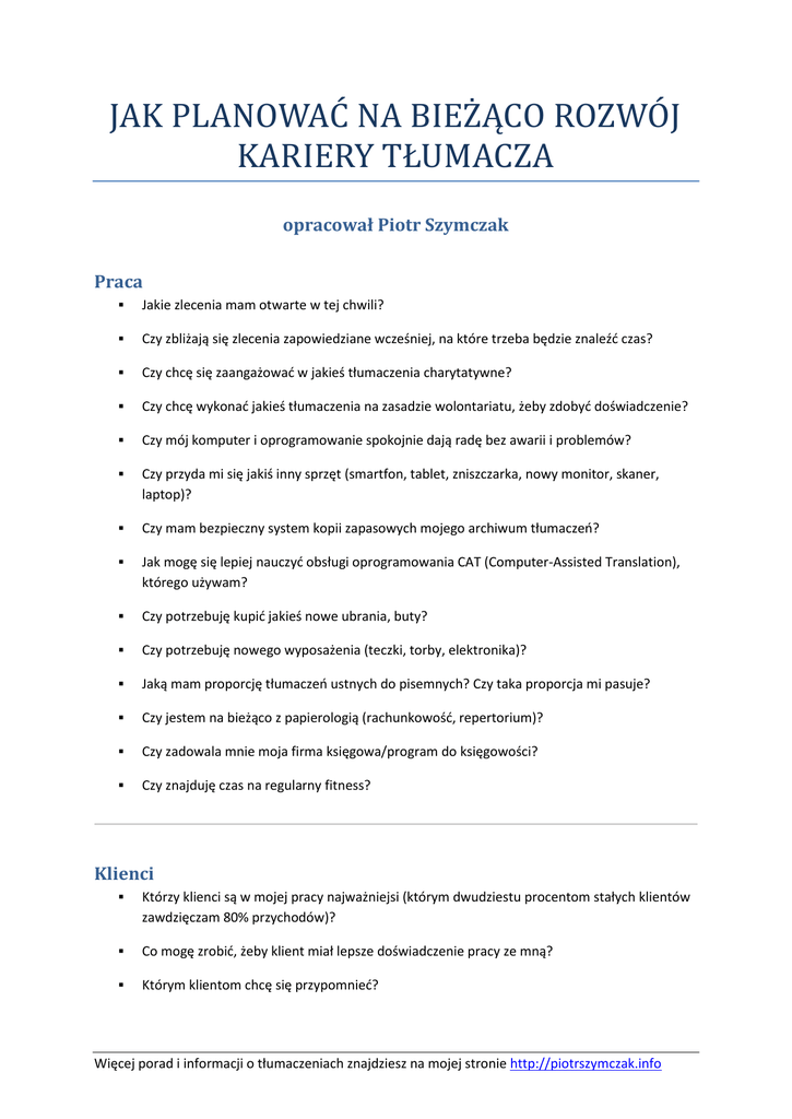 JAK PLANOWAĆ NA BIEŻĄCO ROZWÓJ KARIERY TŁUMACZA opracował Piotr Szymczak Praca Jakie zlecenia mam otwarte w tej chwili? Czy zbliżają się zlecenia zapowiedziane wcześniej, na które trzeba będzie znaleźć czas? Czy chcę się zaangażować w jakieś tłumaczenia charytatywne? Czy chcę wykonać jakieś tłumaczenia na zasadzie wolontariatu, żeby zdobyć doświadczenie? Czy mój komputer i oprogramowanie spokojnie dają radę bez awarii i problemów? Czy przyda mi się jakiś inny sprzęt (smartfon, tablet, zniszczarka, nowy monitor, skaner, laptop)? Czy mam bezpieczny system kopii zapasowych mojego archiwum tłumaczeń? Jak mogę się lepiej nauczyć obsługi oprogramowania CAT (Computer-Assisted Translation), którego używam? Czy potrzebuję kupić jakieś nowe ubrania, buty? Czy potrzebuję nowego wyposażenia (teczki, torby, elektronika)? Jaką mam proporcję tłumaczeń ustnych do pisemnych? Czy taka proporcja mi pasuje? Czy jestem na bieżąco z papierologią (rachunkowość, repertorium)? Czy zadowala mnie moja firma księgowa/program do księgowości? Czy znajduję czas na regularny fitness? Klienci Którzy klienci są w mojej pracy najważniejsi (którym dwudziestu procentom stałych klientów zawdzięczam 80% przychodów)? Co mogę zrobić, żeby klient miał lepsze doświadczenie pracy ze mną? Którym klientom chcę się przypomnieć? Więcej porad i informacji o tłumaczeniach znajdziesz na mojej stronie http://piotrszymczak.info Z jakimi nowymi klientami chcę nawiązać kontakt? Których klientów chcę poprosić o polecenie? Jaką reklamę albo promocję swoich usług mogę zaproponować? Czy na rynku pojawiły się jakieś nowe agencje tłumaczeniowe? Z którymi agencjami chcę nawiązać kontakt? Jak mogę poprawić swoją obecność w sieci? Czy potrzebuję uaktualnić CV? Rozwój językowy Czy warto byłoby skończyć jakieś dodatkowe studia filologiczne? Czy chcę zacząć pracować nad zdobyciem nowej pary języków? Czy chcę uzyskać jakieś certyfikaty językowe? Które podręczniki będą mi przydatne? Czy chcę poszukać nowych podcastów w języku obcym do regularnego słuchania? Jak mogę znaleźć znajomych, z którymi mogę regularnie rozmawiać w moim drugim języku? Czy chcę się zapisać na jakieś kursy? Czy potrzebuję nowych słowników? Rozwój zawodowy Czy chcę się zapisać do jakichś organizacji branżowych (np. TEPIS, STP, STL, STAW)? Co chcę przez to osiągnąć i co muszę w tym celu zrobić? Jakie nowe informacje pojawiły się na stronach TEPIS i Stowarzyszenia Tłumaczy Polskich? Czy są jakieś studia (tłumaczeniowe albo branżowe), na które chcę się zapisać? Czy są szkolenia, na które chcę się zapisać? Czy są konferencje, na które chcę pojechać? Jakie nowe książki o tłumaczeniu chcę przeczytać? Czy chcę poszukać nowych blogów albo stron o tłumaczeniu do zasubskrybowania na kanale RSS? Więcej porad i informacji o tłumaczeniach znajdziesz na mojej stronie http://piotrszymczak.info Czy są czasopisma albo gazety branżowe, które chcę regularnie czytać/prenumerować? Czy jest jakaś nowa dziedzina specjalizacji, którą chcę opanować? Czy są jakieś uprawnienia zawodowe, które chcę zdobyć (przysięgłe, europejskie)? Co zamierzam w tym celu zrobić? Czy jest jakieś oprogramowanie CAT (Computer-Assisted Translation), które chcę poznać albo kupić? Dla jakich dziedzin chcę sobie opracować glosariusze i elektroniczne fiszki z terminologią branżową? – Ale lista jest do niczego! W pięć minut mogę lepszą wymyślić! Ooo, jak miło, że to proponujesz. Zostaw mi komentarz ze swoimi sugestiami albo pomysłami na tej stronie i wspólnymi siłami jakoś wyprowadzimy tę listę na ludzi! Pozdrawiam, Piotr Szymczak Więcej porad i informacji o tłumaczeniach znajdziesz na mojej stronie http://piotrszymczak.info