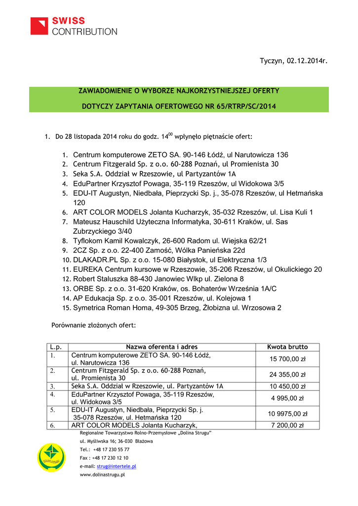 Tyczyn, 02.12.2014r. ZAWIADOMIENIE O WYBORZE NAJKORZYSTNIEJSZEJ OFERTY DOTYCZY ZAPYTANIA OFERTOWEGO NR 65/RTRP/SC/2014 1. Do 28 listopada 2014 roku do godz. 1400 wpłynęło piętnaście ofert: Centrum komputerowe ZETO SA. 90-146 Łódź, ul Narutowicza 136 Centrum Fitzgerald Sp. z o.o. 60-288 Poznań, ul Promienista 30 Seka S.A. Oddział w Rzeszowie, ul Partyzantów 1A EduPartner Krzysztof Powaga, 35-119 Rzeszów, ul Widokowa 3/5 EDU-IT Augustyn, Niedbała, Pieprzycki Sp. j., 35-078 Rzeszów, ul Hetmańska 120 6. ART COLOR MODELS Jolanta Kucharzyk, 35-032 Rzeszów, ul. Lisa Kuli 1 7. Mateusz Hauschild Użyteczna Informatyka, 30-611 Kraków, ul. Sas Zubrzyckiego 3/40 8. Tyflokom Kamil Kowalczyk, 26-600 Radom ul. Wiejska 62/21 9. 2CZ Sp. z o.o. 22-400 Zamość, Wólka Panieńska 22d 10. DLAKADR.PL Sp. z o.o. 15-080 Białystok, ul Elektryczna 1/3 11. EUREKA Centrum kursowe w Rzeszowie, 35-206 Rzeszów, ul Okulickiego 20 12. Robert Staluszka 88-430 Janowiec Wlkp ul. Zielona 8 13. ORBE Sp. z o.o. 31-620 Kraków, os. Bohaterów Września 1A/C 14. AP Edukacja Sp. z o.o. 35-001 Rzeszów, ul. Kolejowa 1 15. Symetrica Roman Homa, 49-305 Brzeg, Żłobizna ul. Wrzosowa 2 1. 2. 3. 4. 5. Porównanie złożonych ofert: L.p. 1. 2. 3. 4. 5. 6. Nazwa oferenta i adres Centrum komputerowe ZETO SA. 90-146 Łódź, ul. Narutowicza 136 Centrum Fitzgerald Sp. z o.o. 60-288 Poznań, ul. Promienista 30 Seka S.A. Oddział w Rzeszowie, ul. Partyzantów 1A EduPartner Krzysztof Powaga, 35-119 Rzeszów, ul. Widokowa 3/5 EDU-IT Augustyn, Niedbała, Pieprzycki Sp. j. 35-078 Rzeszów, ul. Hetmańska 120 ART COLOR MODELS Jolanta Kucharzyk, Regionalne Towarzystwo Rolno-Przemysłowe „Dolina Strugu” ul. Myśliwska 16; 36-030 Błażowa Tel.: +48 17 230 55 77 DOLINA S TR UGU Fax : +48 17 230 12 10 e-mail: [email protected] www.dolinastrugu.pl Kwota brutto 15 700,00 zł 24 355,00 zł 10 450,00 zł 4 995,00 zł 10 9975,00 zł 7 200,00 zł 7. 8. 9. 10. 11. 12. 13. 14. 15. 35-032 Rzeszów, ul. Lisa Kuli 1 Mateusz Hauschild Użyteczna Informatyka, 30-611 Kraków, ul. Sas-Zubrzyckiego 3/40 Tyflokom Kamil Kowalczyk, 26-600 Radom ul. Wiejska 62/21 2CZ Sp. z o.o. 22-400 Zamość, Wólka Panieńska 22d DLAKADR.PL Sp. z o.o. 15-080 Białystok, ul. Elektryczna 1/3 EUREKA Centrum kursowe w Rzeszowie, 35-206 Rzeszów, ul. Okulickiego 20 Robert Staluszka 88-430 Janowiec Wlkp ul. Zielona 8 ORBE Sp. z o.o. 31-620 Kraków, os. Bohaterów Września 1A/C AP Edukacja Sp. z o.o. 35-001 Rzeszów, ul. Kolejowa 1 Symetrica Roman Homa, 49-305 Brzeg, Żłobizna ul. Wrzosowa 2 24 600,00 zł 6 960,00 zł 8 746,00 zł 6 650,00 zł 6 700,00 zł 20 080,00 zł 10 257,50 zł 7 405,00 zł 4 500,00 zł Oferty złożone przez: 1. ORBE Sp. z o.o. 31-620 Kraków, os. Bohaterów Września 1A/C 2. Symetrica Roman Homa, 49-305 Brzeg, Żłobizna ul. Wrzosowa 2 Zostały odrzucone podczas oceny formalnej (brak kompletnego załącznika nr 6). W związku z zakończeniem oceny złożonych ofert, w oparciu o zaproszenie do składania ofert, Zamawiający informuje, że w prowadzonym postępowaniu, do realizacji jako najkorzystniejszą wybrano ofertę złożoną przez: EduPartner Krzysztof Powaga, 35-119 Rzeszów, ul. Widokowa 3/5 Uzasadnienie wyboru: oferta spełnia wszystkie wymagania formalne, a zaoferowana cena jest najniższa z ofert spełniających wymagania. Oferta otrzymała najwyższą liczbę punktów w oparciu o kryteria oceny ofert tj. spełnianie warunków kryteriów formalnych, na podstawie oświadczenia przedstawiona oferta cenowa 100% Regionalne Towarzystwo Rolno-Przemysłowe „Dolina Strugu” ul. Myśliwska 16; 36-030 Błażowa Tel.: +48 17 230 55 77 DOLINA S TR UGU Fax : +48 17 230 12 10 e-mail: [email protected] www.dolinastrugu.pl