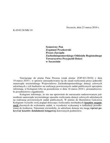 Szczecin, dnia 23 marca 2010 r. K-0542/28/MK/10 Szanowny Pan Zygmunt Pyszkowski Prezes Zarządu Zachodniopomorskiego Oddziału Regionalnego Towarzystwa Przyjaciół Dzieci w Szczecinie Nawiązując do pisma Pana Prezesa (znak pisma: ZOP/421/2010) z dnia 10 marca 2010 r. w sprawie ustosunkowania się do zasad rozliczania przez jednostki samorządu terytorialnego Województwa Zachodniopomorskiego dotacji celowych udzielanych z ich budżetów na realizację powierzonych zadań publicznych uprzejmie informuję, iż Kolegium Izby na posiedzeniu w dniu 16 marca 2010 r. przeanalizowało przedmiotowe zagadnienie. Kolegium informuje, że nie ma uprawnień do narzucania nadzorowanym jednostkom samorządu terytorialnego sposobu rozliczania dotacji celowych udzielanych na realizację powierzonych zadań publicznych. W piśmie do Burmistrza Golczewa Kolegium wyraziło swój pogląd dotyczący rozliczania niezbędnych kosztów organizacji zleconych do wykonania zadań, w wysokości wykazanej w kalkulacji przedłożonej do konkursu. Natomiast stwierdziło, że udzielone dotacje nie mogą wprost pokrywać kosztów działalności księgowej dotowanych podmiotów.