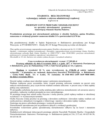 Załącznik do Zarządzenia Starosty Bełchatowskiego Nr 74/2016, z dnia 25 lipca 2016 r. STAROSTA BEŁCHATOWSKI wykonujący zadanie z zakresu administracji rządowej ogłasza PIERWSZY USTNY PRZETARG NIEOGRANICZONY na sprzedaż nieruchomości gruntowej stanowiącej własność Skarbu Państwa Przedmiotem przetargu jest nieruchomość położona w obrębie Suchcice, gmina Drużbice, oznaczona w ewidencji gruntów numerem działki 3/3 o powierzchni 0,1170 ha. Dla przedmiotowej działki w Sądzie Rejonowym w Bełchatowie prowadzona jest Księga Wieczysta nr PT1B/00027659/1. Działy III i IV Księgi Wieczystej są wolne od obciążeń. Plan ogólny przestrzennego zagospodarowania gminy Drużbice obowiązywał do 31.12.2003 r. Zgodnie z ustaleniami studium uwarunkowań i kierunków zagospodarowania przestrzennego Gminy Drużbice zatwierdzonego uchwałą Rady Gminy Drużbice nr XXII/137/01 z dnia 28.06.2001r. powyższa nieruchomość położona jest w terenach zabudowy zagrodowej i mieszkaniowej Dla działki nr 3/3 obr. Suchcice nie została wydana decyzja o warunkach zabudowy Cena wywoławcza nieruchomości wynosi 17 205,00 zł Przetarg odbędzie się dnia 8 września 2016 r. o godz. 10 00, w Starostwie Powiatowym w Bełchatowie, przy ul. Pabianickiej 17/19, w Sali Narad (pokój nr 111, I piętro). Wadium w wysokości 10 % ceny wywoławczej, tj. 1720,50 zł należy wpłacać wyłącznie : w pieniądzu, na rachunek depozytowy Starostwa Powiatowego w Bełchatowie – Getin Noble Bank SA w Łodzi, Nr rachunku 36 1560 0013 2459 3649 9000 0005, do dnia 2 września 2016 r. Dowód wpłaty wadium musi określać numer i położenie nieruchomości. Wadium wpłacone przez uczestnika, który wygrał przetarg zaliczone zostanie na poczet ceny nabycia nieruchomości, przy czym kwota wadium zostanie zaliczona w poczet ceny w dniu zapłaty pełnej ceny należności. W przypadku uchylenia się przez osobę ustaloną jako nabywca nieruchomości od zawarcia umowy sprzedaży, wpłacone wadium przepada na rzecz sprzedającego. W przetargu mogą brać udział osoby fizyczne i osoby prawne, jeżeli wpłacą wadium w określonej wysokości i w wyznaczonym terminie. Osoba fizyczna winna przybyć na przetarg z dowodem osobistym i dowodem wpłaty wadium zaś osoba prawna z aktualnym wyciągiem z właściwego rejestru i dowodem wpłaty wadium. Zastrzega się prawo odwołania przetargu z ważnych powodów. Nieruchomość sprzedawana jest na podstawie danych z ewidencji geodezyjnej. Ewentualne wznowienie granic sprzedawanej nieruchomości odbywa się na koszt i staraniem nabywcy. Dodatkowych informacji dotyczących przetargu udziela Naczelnik Wydziału Skarbu i Gospodarki Nieruchomościami Starostwa Powiatowego w Bełchatowie (pokój nr 216, 217) tel. 44 635 86 50, 44 635 86 38