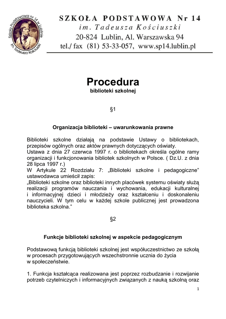 Procedura biblioteki szkolnej §1 Organizacja biblioteki – uwarunkowania prawne Biblioteki szkolne działają na podstawie Ustawy o bibliotekach, przepisów ogólnych oraz aktów prawnych dotyczących oświaty. Ustawa z dnia 27 czerwca 1997 r. o bibliotekach określa ogólne ramy organizacji i funkcjonowania bibliotek szkolnych w Polsce. ( Dz.U. z dnia 28 lipca 1997 r.) W Artykule 22 Rozdziału 7: „Biblioteki szkolne i pedagogiczne” ustawodawca umieścił zapis: „Biblioteki szkolne oraz biblioteki innych placówek systemu oświaty służą realizacji programów nauczania i wychowania, edukacji kulturalnej i informacyjnej dzieci i młodzieży oraz kształceniu i doskonaleniu nauczycieli. W tym celu w każdej szkole publicznej jest prowadzona biblioteka szkolna.” §2 Funkcje biblioteki szkolnej w aspekcie pedagogicznym Podstawową funkcją biblioteki szkolnej jest współuczestnictwo ze szkołą w procesach przygotowujących wszechstronnie ucznia do życia w społeczeństwie. 1. Funkcja kształcąca realizowana jest poprzez rozbudzanie i rozwijanie potrzeb czytelniczych i informacyjnych związanych z nauką szkolną oraz 1 z indywidualnymi zainteresowaniami uczniów. Mają być oni przysposabiani do samokształcenia. Biblioteka szkolna ma stworzyć warunki do poszukiwania, porządkowania i wykorzystywania informacji z różnych źródeł oraz efektywnego posługiwania się technologią informacyjną. Działania jej mają wspierać również nauczycieli w ich pracy zawodowej i doskonaleniu własnym. 2. Realizując funkcję wychowawczą biblioteka szkolna wpływa na potrzeby i poziom kompetencji czytelniczych swoich użytkowników, udziela pomocy w przezwyciężaniu ich braku. Wspomaga również działania szkoły w realizacji programów profilaktycznych, np. profilaktyki prozdrowotnej, przeciwdziałaniu uzależnieniom, ekologicznych itd. Wspiera również rodziców w rozwiązywaniu problemów wychowawczych poprzez wskazywanie im literatury pedagogicznej. 3. Realizując funkcję kulturalną biblioteka szkolna uczestniczy w rozwijaniu życia kulturalnego uczniów i kształtowaniu umiejętności odbioru wartości kulturalnych oraz ich tworzeniu. 4. Realizując funkcję opiekuńczą nauczyciele-bibliotekarze sprawują opiekę nad uczniami przebywającymi w bibliotece dbając o ich bezpieczeństwo, organizując zajęcia indywidualne oraz pomoc w nauce. §3 Funkcje biblioteki szkolnej w aspekcie bibliotecznym 1. Organizacja zbiorów polega na dostarczaniu nauczycielom i uczniom środków dydaktycznych, wychowawczych oraz rekreacyjnych. Polityka gromadzenia zbiorów prowadzona jest pod kątem wykorzystania ich w procesie dydaktycznym, środki finansowe na ich zakup ujęte są w planie finansowym szkoły. 2. Funkcja katalogowa i biblioteczna polega na stworzeniu w bibliotece szkolnej systemu informacji o zbiorach własnych. 3. Funkcja kształcąca, polega na wdrożeniu uczniów do racjonalnego korzystania ze zbiorów bibliotecznych oraz wykształcenia umiejętności posługiwania sie warsztatem informacyjnym biblioteki. Nauczycielebibliotekarze zobowiązani są m.in. do stworzenia uczniom warunków do 2 poszukiwania, porządkowania i wykorzystywania informacji z różnych źródeł oraz efektywnego posługiwania sie technologią informacyjną. Nauczyciel – bibliotekarz wspiera nauczycieli w realizacji programów edukacyjnych zwłaszcza edukację czytelniczą i medialną, której celami są: - przygotowanie do samodzielnego poszukiwania potrzebnych informacji i materiałów, - przygotowanie do odbioru informacji rozpowszechnianych przez media, - przygotowanie do świadomego i odpowiedzialnego korzystania ze środków masowej komunikacji (telewizji, komputerów, prasy), - kształtowanie postawy szacunku dla polskiego dziedzictwa kulturowego w związku z globalizacją kultury masowej. §4 Organizacja biblioteki szkolnej jako Internetowego Centrum Informacji Multimedialnej 1. Biblioteka to centrum różnych źródeł informacji oraz centrum dydaktyczne szkoły, w którym są prowadzone zajęcia w oparciu o zgromadzone zbiory książkowe i pozaksiążkowe. 2. Na zasoby biblioteki szkolnej składają się: książki, czasopisma, mapy, nuty, plansze a także dokumenty zarejestrowane na nośnikach elektronicznych, nagrania na kasetach, na płytach CD oraz DVD i inne. 3. Podstawową rolą biblioteki szkolnej jest stwarzanie uczniom dostępu do informacji, wdrażanie do samodzielnego poszukiwania wiadomości oraz inspirowanie do kreatywnego czytania. Służą temu różne formy zajęć prowadzonych przez nauczycieli bibliotekarzy, których celem jest rozwijanie zainteresowań czytelniczych i ogólnorozwojowych poprzez: konkursy, wystawy, gazetki tematyczne, wycieczki do obiektów kultury, lekcje biblioteczne. 4. Biblioteka stanowiąca centrum dydaktyczne udostępnia potrzebny księgozbiór, komputery i inny sprzęt odtwarzający, a także miejsca do cichej pracy indywidualnej. §5 3 Zasady wypożyczania książek 1. Z biblioteki szkolnej mogą korzystać wszyscy uczniowie, nauczyciele i pracownicy szkoły w godzinach pracy biblioteki. 2. Korzystanie z biblioteki jest bezpłatne. 3. Księgozbiór wypożyczany jest komputerowo za pomocą programu MOL Optivum. 4. Podczas wyboru książek uczniowie korzystają z wolnego dostępu do półek, katalogów elektronicznych oraz niezbędnej pomocy merytorycznej nauczyciela-bibliotekarza w zakresie korzystania z narzędzi i zasobu dokumentów biblioteki. Katalog elektroniczny dostępny jest na stronie internetowej szkoły http://www.sp14.lublin.pl/ pod linkiem „Biblioteka”. 5. Czytelnicy zobowiązani są do dbałości o wypożyczone materiały. 6. Jednorazowo można wypożyczyć trzy książki lub czasopisma na okres dwóch tygodni. W uzasadnionych przypadkach bibliotekarz może ograniczyć lub zwiększyć liczbę wypożyczonych materiałów a także przedłużyć termin zwrotu wypożyczonych książek. 7. Czytelnik może prosić o zarezerwowanie potrzeb