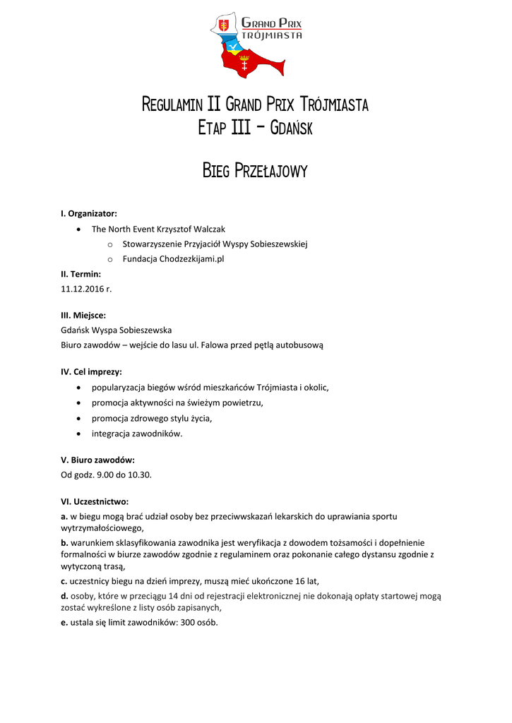 Regulamin II Grand Prix Trójmiasta Etap III – Gdańsk Bieg Przełajowy I. Organizator: The North Event Krzysztof Walczak o Stowarzyszenie Przyjaciół Wyspy Sobieszewskiej o Fundacja Chodzezkijami.pl II. Termin: 11.12.2016 r. III. Miejsce: Gdańsk Wyspa Sobieszewska Biuro zawodów – wejście do lasu ul. Falowa przed pętlą autobusową IV. Cel imprezy: popularyzacja biegów wśród mieszkańców Trójmiasta i okolic, promocja aktywności na świeżym powietrzu, promocja zdrowego stylu życia, integracja zawodników. V. Biuro zawodów: Od godz. 9.00 do 10.30. VI. Uczestnictwo: a. w biegu mogą brać udział osoby bez przeciwwskazań lekarskich do uprawiania sportu wytrzymałościowego, b. warunkiem sklasyfikowania zawodnika jest weryfikacja z dowodem tożsamości i dopełnienie formalności w biurze zawodów zgodnie z regulaminem oraz pokonanie całego dystansu zgodnie z wytyczoną trasą, c. uczestnicy biegu na dzień imprezy, muszą mieć ukończone 16 lat, d. osoby, które w przeciągu 14 dni od rejestracji elektronicznej nie dokonają opłaty startowej mogą zostać wykreślone z listy osób zapisanych, e. ustala się limit zawodników: 300 osób. VII. Program minutowy: 9:00 – otwarcie biura zawodów 10:30 – zamknięcie biura zawodów 10:45 – wspólna rozgrzewka 11:00 – start biegu przełajowego 8km 13:00 – dekoracja i zakończenie Starty towarzyszące: 11:10 – start nordic walking 8km Uwaga: Start towarzyszący ma odrębny regulamin. VIII. Kategorie wiekowe w marszu głównym: kobiety i mężczyźni 16-19 lat kobiety i mężczyźni 20-29 lat kobiety i mężczyźni 30-39 lat kobiety i mężczyźni 40-49 lat kobiety i mężczyźni 50-59 lat kobiety i mężczyźni 60-69 lat kobiety i mężczyźni 70-79 lat kobiety i mężczyźni 80 lat i starsi Uwaga: O przynależności do danej kategorii wiekowej decyduje rok urodzenia. IX. Nagrody bieg główny: a. kategorie wiekowe: puchary za trzy pierwsze miejsca, b. wszyscy zawodnicy otrzymają pamiątkowy medal. X. Wpisowe: a. 20 zł do 25.11.2016, b. 30 zł od 26.11.2016 do 9.12.2016, c. 40 zł w dniu imprezy, d. osoby w wieku 70+ wpłacają 5 zł, w dniu zawodów 10zł. Uwaga: Opłaty startowe nie podlegają zwrotowi. XI. Zgłoszenia: a. on-line: http://elektronicznezapisy.pl/g/II_Grand_Prix_Trojmiasta.html b. w dniu imprezy, w biurze zawodów (uwaga limit: pula wolnych numerów będzie wynosiła 10% zapisanych uczestników, którzy do 2 dni przed imprezą dokonają opłaty startowej /lub całościowy limit 300 osób). XII. Pomiar czasu Czas zawodników mierzony jest elektronicznie za pomocą zwrotnych chipów umieszczonych przy bucie zawodnika. Czas zawodników mierzony jest brutto, co oznacza, że start każdej kategorii wiekowej liczony jest oddzielnie. Przy małej liczbie osób dopuszcza się łączenie kategorii podczas startu. Rejestrowany jest czas każdego zawodnika kończącego swój dystans, tam gdzie to możliwe rejestrowane są również międzyczasy. XIII. Numery startowe Każdy zawodnik zobowiązany jest do przypięcia w widoczny sposób numeru startowego na piersi, bądź brzuchu. Zawodnicy chowający numery startowe pod odzieżą mogą spodziewać się kar minutowych. Noszony numer startowy musi odpowiadać numerowi chipa elektronicznego. XIV. Trasa Trasa poprowadzona jest po miękkim i twardym podłożu, które nie zagraża bezpieczeństwu zawodników. Trasa jest wyraźnie oznakowana, aby ułatwić poruszanie się po niej. Na trasie, zależnie od warunków atmosferycznych, znajdują się punkty odświeżania z wodą niegazowaną podawaną do rąk zawodników. Długość trasy liczona jest po najkrótszej linii jaką może pokonać zawodnik. Dopuszcza się możliwość niedużego błędu w pomiarze. Start i meta oznaczone są bramami/bramą startową. W okolicach startu i mety muszą znajdują się punkty z wodą. XV. Wyniki Organizator zobowiązany jest do wywieszenia nieoficjalnych wyników w widocznym miejscu najszybciej jak to możliwe. Nieoficjalne wyniki obowiązują zawsze z zastrzeżeniem protestu. Oficjalne wyniki zostaną wywieszone przed dekoracją oraz ogłaszane podczas samej dekoracji zwycięzców i dostępne są tego samego dnia na stronie internetowej Organizatora. Oficjalne wyniki są nieodwołalne. Wyniki w formie elektronicznej dostępne będą na stronie www.gp3miasta.pl Wszelkie błędy zawodnika spowodowane niepoprawnym wypełnieniem formularza zgłaszającego, zawodnik może zgłaszać do 24h od umieszczenia wyników na stronie. XVI. Bezpieczeństwo Nad bezpieczeństwem zawodników czuwa służba medyczna i wykwalifikowana służba techniczna. Organizator zapewnia bezpieczeństwo na trasie i zamknięcie ruchu kołowego na odcinku zawodów. Na polecenie służb medycznych zawodnik musi niezwłocznie zejść z trasy. XVII. Punktacja w cyklu Grand Prix Punkty zdobywa się według klucza: 1 miejsce 20 punktów, 2 miejsce 18 punktów, 3 miejsce 16 punktów, 4 miejsce 14 punktów, 5 miejsce 13 punktów, 6 miejsce 12 punktów, . . 16 miejsce 2 punkty, od 17 miejsca wzwyż wszyscy otrzymują po 1 punkcie. Klasyfikacja generalna: a. Wygrywa osoba, która zbierze najwięcej punktów we wszystkich trzech startach, w przypadku takiej samej ilości punktów decyduje ostatni start. b. By zostać sklasyfikowanym w podsumowaniu końcowym należy wziąć udział w jednej imprezie. XVIII. Nagrody w klasyfikacji generalnej Grand Prix Statuetki i bony na sprzęt sportowy. XIX. Postanowienia końcowe: a. zawody odbędą się bez względu na pogodę, b. na każdego zawodnika kończącego bieg będzie czekać poczęstunek, c. Organizator nie ponosi odpowiedzialności za rzeczy zgubione podczas imprezy i za szkody wyrządzone przez uczestników, d. przekazanie do Organizatora, prawidłowo wypełnionego i podpisanego formularza zgłoszeniowego oznacza wyrażenie zgody przez uczestnika na wykorzystanie podanych przez niego danych osobowych na potrzeby przesłania do uczestnika informacji o przyszłych imprezach, pr