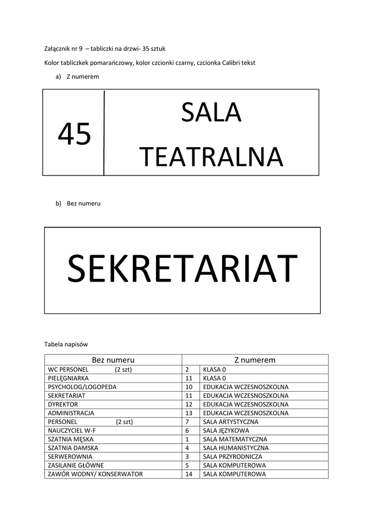 Załącznik nr 9 – tabliczki na drzwi- 35 sztuk Kolor tabliczkek pomarańczowy, kolor czcionki czarny, czcionka Calibri tekst a) Z numerem 45 SALA TEATRALNA b) Bez numeru cvcx SEKRETARIAT Tabela napisów Bez numeru WC PERSONEL (2 szt) PIELĘGNIARKA PSYCHOLOG/LOGOPEDA SEKRETARIAT DYREKTOR ADMINISTRACJA PERSONEL (2 szt) NAUCZYCIEL W-F SZATNIA MĘSKA SZATNIA DAMSKA SERWEROWNIA ZASILANIE GŁÓWNE ZAWÓR WODNY/ KONSERWATOR Z numerem 2 11 10 11 12 13 7 6 1 4 3 5 14 KLASA 0 KLASA 0 EDUKACJA WCZESNOSZKOLNA EDUKACJA WCZESNOSZKOLNA EDUKACJA WCZESNOSZKOLNA EDUKACJA WCZESNOSZKOLNA SALA ARTYSTYCZNA SALA JĘZYKOWA SALA MATEMATYCZNA SALA HUMANISTYCZNA SALA PRZYRODNICZA SALA KOMPUTEROWA SALA KOMPUTEROWA KOTŁOWNIA ŚWIETLICA/STOŁÓWKA HALA SPORTOWA BIBLIOTEKA INTEGRACJA SENSORYCZNA PEDAGOG SALA TEATRALNA Piktogramy – wc męski, wc damski, wc niepełnosprawni Wc męski- szt Wc damski- szt Wc niepełnosprawni- szt