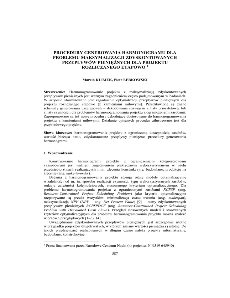 Streszczenie: Harmonogramowanie projektu z maksymalizacją zdyskontowanych