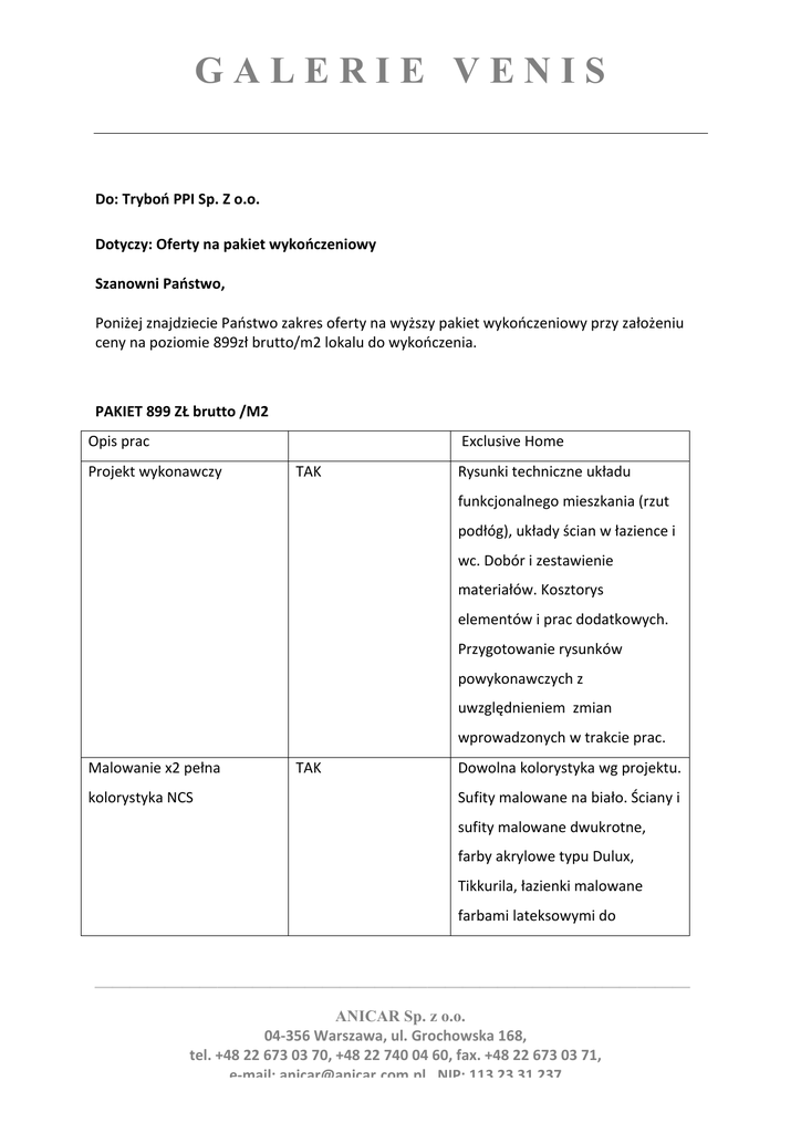 GALERIE VENIS Do: Tryboń PPI Sp. Z o.o. Dotyczy: Oferty na pakiet wykończeniowy Szanowni Państwo, Poniżej znajdziecie Państwo zakres oferty na wyższy pakiet wykończeniowy przy założeniu ceny na poziomie 899zł brutto/m2 lokalu do wykończenia. PAKIET 899 ZŁ brutto /M2 Opis prac Exclusive Home Projekt wykonawczy TAK Rysunki techniczne układu funkcjonalnego mieszkania (rzut podłóg), układy ścian w łazience i wc. Dobór i zestawienie materiałów. Kosztorys elementów i prac dodatkowych. Przygotowanie rysunków powykonawczych z uwzględnieniem zmian wprowadzonych w trakcie prac. Malowanie x2 pełna kolorystyka NCS TAK Dowolna kolorystyka wg projektu. Sufity malowane na biało. Ściany i sufity malowane dwukrotne, farby akrylowe typu Dulux, Tikkurila, łazienki malowane farbami lateksowymi do __________________________________ ANICAR Sp. z o.o. 04-‐356 Warszawa, ul. Grochowska 168, tel. +48 22 673 03 70, +48 22 740 04 60, fax. +48 22 673 03 71, e-‐mail: [email protected], NIP: 113 23 31 237 GALERIE VENIS pomieszczeń o podwyższonej wilgotności. Gresy hiszpańskie Hall, łazienka, kuchnia Gresy podłogowe, różne wersje Formaty 45x45, szerokość fugi dla płytek 56x56, 60x60, wg rektyfikowanych 1,5 mm, chemia oferty katalogowej, w budowlana (kleje, fugi, silikony) tym opcje różni producenci typu Atlas, rektyfikowane i Mapei, Sopro, kolor wg projektu. dekory. Prod. np. Maksymalna powierzchnia Argenta, Emigres okładzin gresowych w lokalu do 30%. Płytki hiszpańskie Formaty 30x60, Płytki ułożone na dowolną 10x20, 25x75, w tym wysokość, bez limitu ilościowego. opcje rektyfikowane, Powierzchnie nie wyłożone prod. np. Keraben, płytkami Szerokość fugi dla płytek Tau, w tym część opcji rektyfikowanych 1,5 mm, chemia dekoracyjnych budowlana (kleje, fugi, silikony) różni producenci typu Atlas, Mapei, Sopro, kolor wg projektu. Krawędzie szlifowane pod kątem 45 stopni. Wykończenie wewnętrznych narożników za pomocą silikonu w odpowiednim kolorze. Cena elementów dodatkowych (np. dekorów) wg ceny detalicznej danego __________________________________ ANICAR Sp. z o.o. 04-‐356 Warszawa, ul. Grochowska 168, tel. +48 22 673 03 70, +48 22 740 04 60, fax. +48 22 673 03 71, e-‐mail: [email protected], NIP: 113 23 31 237 GALERIE VENIS produktu. Cena zawiera montaż/ demontaż grzejników przed ułożeniem płytek bądź malowaniem. Sanitariaty podwieszane Ceramika sanitarna Cena zawiera stelaż firmy Noken, produkcji hiszpańskiej przycisk (dwa modele do wyboru, Noken S.A. – kolor błyszczący chrom), Porcelanosa Grupo, zabudowę płytą gk, obłożenie oraz Kohler 3 modele płytkami. do wyboru wg katalogu W cenie syfon butelkowy i zawory Baterie Noken Porcelanowa Baterie chromowane do wody Grupo Noken Porcelanosa Grupo, 3 modele Obudowa wanny z płytek wg Wanna Wanny akrylowe i projektu, wykończenie krawędzi żeliwne produkcji styku silikonem. Rewizja płatna hiszpańskiej Noken dodatkowo. Parawan nawannowy S.A.-‐ i jego montaż płatny dodatkowo. Porcelanosa Grupo. Hydroizolacja Mapei na Formaty 160x70, powierzchni wokół wanny. 170x70 Drobne podkucie w tynku (do 2 cm) wliczone w cenę. Dwa modele prod. W cenie odpowiedni brodzik, __________________________________ ANICAR Sp. z o.o. 04-‐356 Warszawa, ul. Grochowska 168, tel. +48 22 673 03 70, +48 22 740 04 60, fax. +48 22 673 03 71, e-‐mail: [email protected], NIP: 113 23 31 237 GALERIE VENIS Kabina prysznicowa Roltechnik-‐ 80x80 i syfon. Krawędzie styku 90x90, drzwi uszczelnione silikonem. wnękowe do formatu Hydroizolacja Mapei na 140 cm. powierzchni podłóg i ścian kabiny. Umywalka Umywalki Noken – W przypadku umywalek Porcelanosa Grupo, w nastawianych dopłata za blat. tym dwa modele nastawiane, oraz modele do szafek Szafka podumywalkowa Model na zamówienie model na zamówienie Galerie Venis Galerie Venis szerokość do 80 cm, 6 kolorów wg wzornika Egger 3 modele DRE lub Ościeżnica regulowana do 14 cm Drzwi 80 cm Porta wg katalogu w cenie. Panele laminowane układane na Panele laminowane Egger TAK folii paraizolacyjnej i podkładzie wyciszającym. Cokoły mdf laminowane w kolorze paneli. Listwy dylatacyjne na łączeniach z płytkami gresowymi aluminiowe __________________________________ ANICAR Sp. z o.o. 04-‐356 Warszawa, ul. Grochowska 168, tel. +48 22 673 03 70, +48 22 740 04 60, fax. +48 22 673 03 71, e-‐mail: [email protected], NIP: 113 23 31 237 GALERIE VENIS 1,5 cm lub 2.5 cm w zależności od warunków technicznych. Listwy podokienne w formie ćwierćwałka w kolorze uzgodnionym z Klientem. Układane bez klejenia „na pływająco”. Panele naturalne układane na folii Panele naturalne Panele trój-‐ i izolacyjnej i podkładzie dwuwarstwowe z korkowym, układane bez klejenia ekskluzywnej kolekcji „na pływająco”. Cokół drewniany Tortona -‐ L’Antic w kolorze podłogi, klejony do Colonial Porcelanosa ściany. Listwy dylatacyjne na Grupo łączeniach z płytkami gresowymi aluminiowe 1,5 cm lub 2.5 cm w zależności od warunków technicznych. Listwy podokienne w formie ćwierćwałka w kolorze uzgodnionym z Klientem. Sprzątanie końcowe TAK Na nasze prace pakietowe oferujemy rękojmię 36 miesięcy. __________________________________ ANICAR Sp. z o.o. 04-‐356 Warszawa, ul. Grochowska 168, tel. +48 22 673 03 70, +48 22 740 04 60, fax. +48 22 673 03 71, e-‐mail: [email protected], NIP: 113 23 31 237