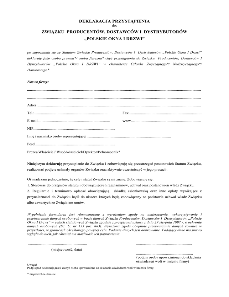 DEKLARACJA PRZYSTĄPIENIA do: ZWIĄZKU PRODUCENTÓW, DOSTAWCÓW I DYSTRYBUTORÓW „POLSKIE OKNA I DRZWI” po zapoznaniu się ze Statutem Związku Producentów, Dostawców i Dystrybutorów „Polskie Okna I Drzwi” deklaruję jako osoba prawna*/ osoba fizyczna* chęć przystąpienia do Związku Producentów, Dostawców I Dystrybutorów „Polskie Okna I DRZWI” w charakterze Członka Zwyczajnego*/ Nadzwyczajnego*/ Honorowego* Nazwa firmy: ..................................................................................................................................................................................... ..................................................................................................................................................................................... Adres:.......................................................................................................................................................................... Tel.:............................................................................. Fax:........................................................................... E-mail........................................................................... www......................................................................... NIP..................................................................................... Imię i nazwisko osoby reprezentującej ....................................................................................... Pesel................................................................................... Prezes/Właściciel/ Współwłaściciel/Dyrektor/Pełnomocnik* Niniejszym deklaruję przystąpienie do Związku i zobowiązuję się przestrzegać postanowień Statutu Związku, realizować podjęte uchwały organów Związku oraz aktywnie uczestniczyć w jego pracach. Oświadczam jednocześnie, Ŝe cele i statut Związku są mi znane. Zobowiązuje się: 1. Stosować do przepisów statutu i obowiązujących regulaminów, uchwał oraz postanowień władz Związku. 2. Regularnie i terminowo opłacać obowiązującą składkę członkowską oraz inne opłaty wynikające z przynaleŜności do Związku bądź do uiszcza których będę zobowiązany na podstawie uchwał władz Związku albo zawartych ze Związkiem umów. Wypełnienie formularza jest równoznaczne z wyraŜeniem zgody na umieszczenie, wykorzystywanie i przetwarzanie danych osobowych w bazie danych Związku Producentów, Dostawców I Dystrybutorów „Polskie Okna I Drzwi” w celach statutowych Związku zgodnie z przepisami ustawy z dnia 29 sierpnia 1997 r. o ochronie danych osobowych (Dz. U. nr 133 poz. 883). WyraŜona zgoda obejmuje przetwarzanie danych równieŜ w przyszłości, w granicach określonego powyŜej celu. Podanie danych jest dobrowolne. Podający dane ma prawo wglądu do nich, jak równieŜ ma moŜliwość ich poprawienia. ............................................................. .......................................................... (miejscowość, data) ........................................................... (podpis osoby upowaŜnionej do składania oświadczeń woli w imieniu firmy) Uwaga! Podpis pod deklaracją musi złoŜyć osoba upowaŜniona do składania oświadczeń woli w imieniu firmy. * niepotrzebne skreślić