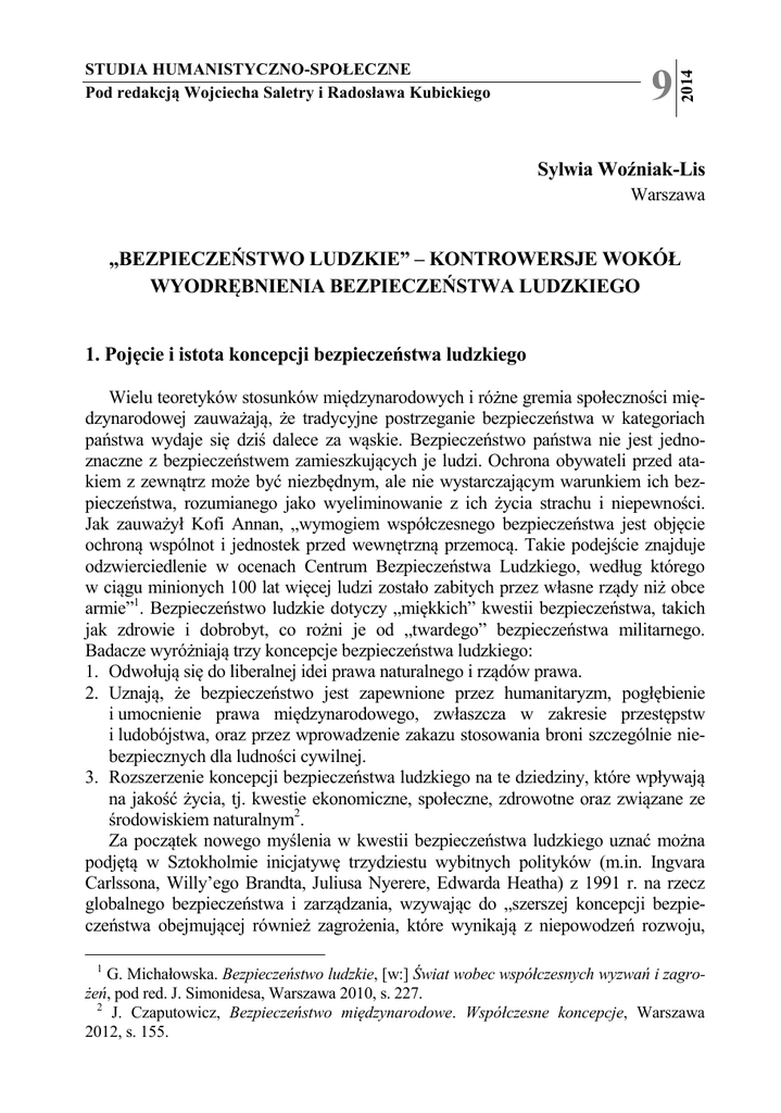 9 2014 STUDIA HUMANISTYCZNO-SPOŁECZNE Pod redakcją Wojciecha Saletry i Radosława Kubickiego Sylwia Woźniak-Lis Warszawa „BEZPIECZEŃSTWO LUDZKIE” – KONTROWERSJE WOKÓŁ WYODRĘBNIENIA BEZPIECZEŃSTWA LUDZKIEGO 1. Pojęcie i istota koncepcji bezpieczeństwa ludzkiego Wielu teoretyków stosunków międzynarodowych i różne gremia społeczności międzynarodowej zauważają, że tradycyjne postrzeganie bezpieczeństwa w kategoriach państwa wydaje się dziś dalece za wąskie. Bezpieczeństwo państwa nie jest jednoznaczne z bezpieczeństwem zamieszkujących je ludzi. Ochrona obywateli przed atakiem z zewnątrz może być niezbędnym, ale nie wystarczającym warunkiem ich bezpieczeństwa, rozumianego jako wyeliminowanie z ich życia strachu i niepewności. Jak zauważył Kofi Annan, „wymogiem współczesnego bezpieczeństwa jest objęcie ochroną wspólnot i jednostek przed wewnętrzną przemocą. Takie podejście znajduje odzwierciedlenie w ocenach Centrum Bezpieczeństwa Ludzkiego, według którego w ciągu minionych 100 lat więcej ludzi zostało zabitych przez własne rządy niż obce armie”1. Bezpieczeństwo ludzkie dotyczy „miękkich” kwestii bezpieczeństwa, takich jak zdrowie i dobrobyt, co rożni je od „twardego” bezpieczeństwa militarnego. Badacze wyróżniają trzy koncepcje bezpieczeństwa ludzkiego: 1. Odwołują się do liberalnej idei prawa naturalnego i rządów prawa. 2. Uznają, że bezpieczeństwo jest zapewnione przez humanitaryzm, pogłębienie i umocnienie prawa międzynarodowego, zwłaszcza w zakresie przestępstw i ludobójstwa, oraz przez wprowadzenie zakazu stosowania broni szczególnie niebezpiecznych dla ludności cywilnej. 3. Rozszerzenie koncepcji bezpieczeństwa ludzkiego na te dziedziny, które wpływają na jakość życia, tj. kwestie ekonomiczne, społeczne, zdrowotne oraz związane ze środowiskiem naturalnym2. Za początek nowego myślenia w kwestii bezpieczeństwa ludzkiego uznać można podjętą w Sztokholmie inicjatywę trzydziestu wybitnych polityków (m.in. Ingvara Carlssona, Willy’ego Brandta, Juliusa Nyerere, Edwarda Heatha) z 1991 r. na rzecz globalnego bezpieczeństwa i zarządzania, wzywając do „szerszej koncepcji bezpieczeństwa obejmującej również zagrożenia, które wynikają z niepowodzeń rozwoju, 1 G. Michałowska. Bezpieczeństwo ludzkie, [w:] Świat wobec współczesnych wyzwań i zagrożeń, pod red. J. Simonidesa, Warszawa 2010, s. 227. 2 J. Czaputowicz, Bezpieczeństwo międzynarodowe. Współczesne koncepcje, Warszawa 2012, s. 155. SYLWIA WOŹNIAK-LIS 148 degradacji środowiska, nadmiernego wzrostu liczby ludności i jej ruchów, braku postępów w rozwoju demokracji”3. Tabela 1. Dziedziny i wskaźniki bezpieczeństwa ludzkiego Bezpieczeństwo Ekonomiczne Zdrowia Środowiska Osobiste Żywności Wspólnoty Polityczne Wskaźniki Stały i satysfakcjonujący dochód, pewność zatrudnienia, ubezpieczenie społeczne Procent PKB przeznaczony na ochronę zdrowia, subiektywne odczucia stanu zdrowia, dostęp do leczenia, subiektywna ocena jakości opieki medycznej. Poziom zanieczyszczenia, zainteresowanie problemami środowiskowymi, zdolność rządu do rozwiązywania problemów środowiskowych, gotowość do inwestowania w ochronę środowiska. Strach przed przemocą, poziom przestępczości, działania samodestrukcyjne, wypadki drogowe, skuteczność instytucji bezpieczeństwa. Fizyczny dostęp do podstawowej żywności, jakość wyżywienia, udział żywności w budżecie gospodarstwa domowego. Stabilność rodziny, poziom zaangażowania we wspólnoty sieci społeczne. Podstawowe wolności i prawa człowieka, zaufanie do rządu, sprawność rządu, zaangażowanie w politykę, postrzeganie korupcji. Źródło: J. Czaputowicz, Bezpieczeństwo, s. 156. Idea bezpieczeństwa ludzkiego zyskała popularność w latach 90. XX w. Po raz pierwszy pojęcie „bezpieczeństwo ludzkie” zostało użyte w raporcie o Rozwoju ONZ z 1994 r., w którym stwierdzono, że sprowadzenie bezpieczeństwa do ochrony przed zewnętrzną agresją i nuklearną zagładą pomija uzasadnione dążenie zwykłych ludzi poszukujących bezpieczeństwa fizycznego w życiu codziennym. Bezpieczeństwo ludzkie jest antropocentryczne, przenosi zainteresowanie z poziomu państwa na poziom jednostki4. Stanowi poszerzone rozumienie bezpieczeństwa, które w hierarchii potrzeb ludzkich Maslova usytuowane jest zaraz za potrzebami fizjologicznymi. Niekiedy określa się je jako „bezpieczeństwo z ludzką twarzą”5. Bezpieczeństwo ludzkie obejmuje wolność od konfliktów zbrojnych, katastrof, klęsk żywiołowych, zanieczyszczenia środowiska, przestępczości, głodu, chorób, represji, naruszeń praw człowieka. Jest bezpieczeństwem od konsekwencji nagłego pogorszenia warunków życia w domu, rodzinie, wspólnocie, miejscu pracy6. Bezpieczeństwo ludzkie obejmuje sie3 G. Michałowska, Bezpieczeństwo, s. 227. J. Czaputowicz. Bezpieczeństwo, s. 155. 5 G. Michałowska, Bezpieczeństwo, s. 228. 6 J. Czaputowicz, Bezpieczeństwo, s. 156. 4 „BEZPIECZEŃSTWO LUDZKIE” 149 dem wymiarów: ekonomiczny, zdrowotny, środowiskowy, osobisty, żywnościowy, wspólnotowy, polityczny (zob. tabela 1). Bezpieczność oznacza odporność na zagrożenie, które zależy od zdolności do unikania niebezpieczeństw i utrzymania poczucia bezpieczeństwa w sytuacji zagrożenia. Poczucie bezpieczeństwa ma charakter indywidualny i zależy od czynników obiektywnych i subiektywnych7. Spotyka się opinie, że bezpieczeństwo ludzkie jest z założenia projektem mglistym i wieloznacznym, a brak precyzyjnej definicji umożliwia pozostanie w jednej koalicji podmiotów o różnych celach. Bezpieczeństwo ludzkie rodzi sprzeczne oceny. W sytuacji braku ogólnie uznawanej teorii w tej dziedzinie wątpliwości odnoszące się do kwalifikacji bezpieczeństwa ludzkiego do sfery bezpieczeństwa międzynarodowego wiążą się z kilkoma kwestiami, z których podstawową jest 