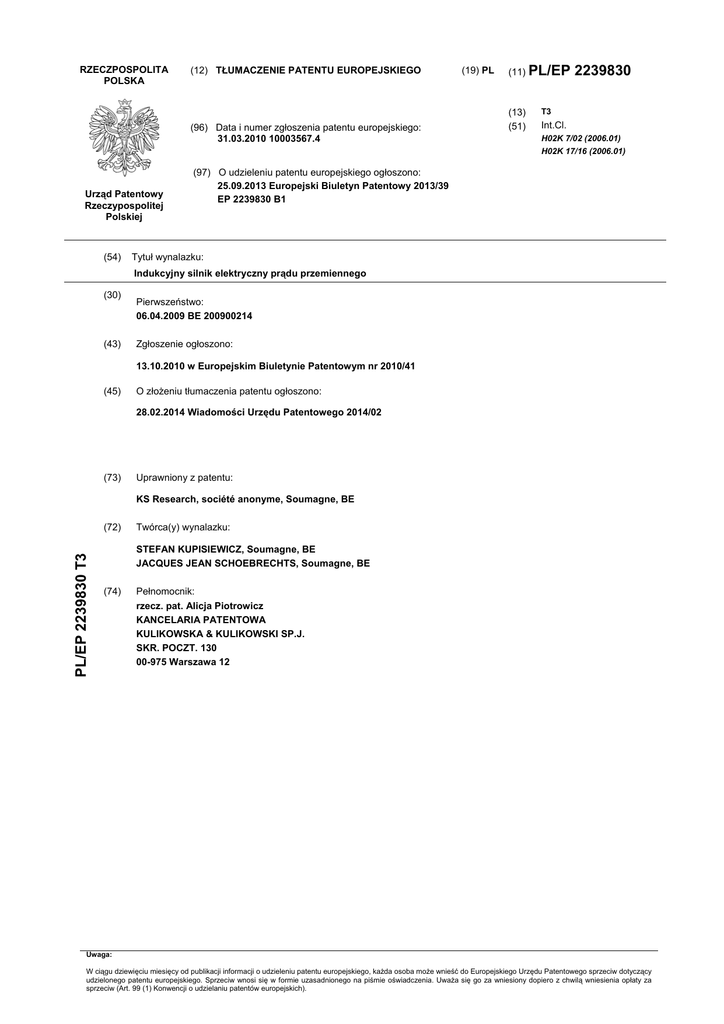 RZECZPOSPOLITA POLSKA (12) TŁUMACZENIE PATENTU EUROPEJSKIEGO (96) Data i numer zgłoszenia patentu europejskiego: 31.03.2010 10003567.4 (19) PL (11) PL/EP (13) (51) 2239830 T3 Int.Cl. H02K 7/02 (2006.01) H02K 17/16 (2006.01) Urząd Patentowy Rzeczypospolitej Polskiej (54) (97) O udzieleniu patentu europejskiego ogłoszono: 25.09.2013 Europejski Biuletyn Patentowy 2013/39 EP 2239830 B1 Tytuł wynalazku: Indukcyjny silnik elektryczny prądu przemiennego (30) (43) Pierwszeństwo: 06.04.2009 BE 200900214 Zgłoszenie ogłoszono: 13.10.2010 w Europejskim Biuletynie Patentowym nr 2010/41 (45) O złożeniu tłumaczenia patentu ogłoszono: 28.02.2014 Wiadomości Urzędu Patentowego 2014/02 (73) Uprawniony z patentu: KS Research, société anonyme, Soumagne, BE PL/EP 2239830 T3 (72) Twórca(y) wynalazku: STEFAN KUPISIEWICZ, Soumagne, BE JACQUES JEAN SCHOEBRECHTS, Soumagne, BE (74) Pełnomocnik: rzecz. pat. Alicja Piotrowicz KANCELARIA PATENTOWA KULIKOWSKA & KULIKOWSKI SP.J. SKR. POCZT. 130 00-975 Warszawa 12 Uwaga: W ciągu dziewięciu miesięcy od publikacji informacji o udzieleniu patentu europejskiego, każda osoba może wnieść do Europejskiego Urzędu Patentowego sprzeciw dotyczący udzielonego patentu europejskiego. Sprzeciw wnosi się w formie uzasadnionego na piśmie oświadczenia. Uważa się go za wniesiony dopiero z chwilą wniesienia opłaty za sprzeciw (Art. 99 (1) Konwencji o udzielaniu patentów europejskich). 23940/PE/13 EP 2 239 830 Opis [0001] Wynalazek dotyczy indukcyjnego silnika elektrycznego prądu przemiennego, indukcyjnym który silniku jest stosowany pierścieniowym gramma, głównie szczególnie w w silniku zasilanym z przemiennika częstotliwości. [0002] Z europejskiego patentu 1.533.884 znany jest już taki silnik, który jest wbudowany w akumulator energii kinetycznej. Posiada on pierścień Gramma, stanowiący stały stojan silnika asynchronicznego. Zadaniem tego silnika jest napędzanie bębna zewnętrznego względem silnika do określonej prędkości. [0003] W tym zastosowaniu silnik jest korzystnie zasilany z przemiennika częstotliwości. [0004] Jednakże stosowanie przetwornic z szybkim przełączaniem powoduje generowanie wskutek wyładowań, prądów pojemnościowych i przez sprzężenia indukcyjne prądów, które mogą być szkodliwe dla łożysk tocznych tych maszyn. [0005] Należy zapewnić pewne podstawowe środki ostrożności. [0006] Polegają one, z jednej strony, na wykonaniu toru o możliwie jak najmniejszej impedancji dla powrotu prądów wysokiej częstotliwości HF w trybie synfazowym w kierunku przemiennika, co zostanie wykonane za pomocą dostosowanych kabli (uziemionych symetrycznie, do prądu faradycznego,…) między wyjściem z przemiennika i silnikiem, który zasila, i z drugiej strony, za pomocą wyrównywania potencjałów systemu uziemienia doskonale dostosowanego do wysokich częstotliwości (HF), ze splotem połączeń, dostosowaniu połączeń, itd. [0007] Zresztą, te środki ostrożności mogą zostać uzupełnione innymi znanymi urządzeniami, takimi jak filtry na wyjściu z przemiennika filtry (filtry dV/dt); izolowanych; trybu stosowanie miotły elektrostatyczny w lub synfazowego, łożysk tocznych szczotki szczelinie filtry sinusowe, lub uziemiające; powietrznej silnika, łożysk ekran i tak dalej. [0008] Te różne urządzenia uzupełniające mają swoje zalety i wady. [0009] Inny silnik według dotychczasowego stanu techniki jest znany z dokumentu US-A-5, 977, 679. [0010] Obecny wynalazek ma na celu skuteczne zapobieganie prądom Niskiej Częstotliwości (BF) i Wysokiej Częstotliwości (HF) wynikającym ze sprzężeń o wysokiej i niskiej częstotliwości indukcyjnej i gwałtowne zredukowanie trudności stosowania przemienników elektronicznych. [0011] Ten indukcyjny cel jest silnik uzyskany według elektryczny wynalazku prądu przez przemiennego wielofazowego, według zastrzeżeń 1 i 7. [0012] Zaletą silnika według wynalazku jest to, że dodatkowe uzwojenie mogących toroidalne uszkodzić przeciwdziała łożyska toczne generowaniu silnika i prądów umożliwia wydłużenie żywotności tych łożysk tocznych oraz przedłużenie czasu okresowych konserwacji. [0013] Wynalazek można zastosować w konwencjonalnym silniku asynchronicznym, asynchronicznych, ale ma również których stojan zastosowanie jest w silnikach utworzony przez pierścień Gramma zasilany przez przemiennik częstotliwości. [0014] zgodnie z określonym punktem widzenia, wynalazek ma zastosowanie w silniku akumulatora energii, którego stojan jest pierścieniem Gramma, zasilanym przemiennikiem częstotliwości. [0015] Uzwojenie toroidalne zamknięte może być wykonane jako uzwojenie dodatkowe, które dodaje się do uzwojenia głównego czynnego, zasilanego alternatywnie, jako przemiennikiem jedyne częstotliwości uzwojenie, stanowiące lub zarówno uzwojenie główne zasilane przemiennikiem częstotliwości, jak i dodatkowe uzwojenie toroidalne, co jest oczywiście mniej kosztowne, ponieważ uzwojenie stały się wspólne, posiadają stojana i co najmniej główne i pomocnicze, które małą reaktancję rozproszenia równą 0,5-krotnej reaktancji rozproszenia silnika konwencjonalnego. [0016] Dla przykładów według większej wykonania wynalazku ograniczającym, z w jasności, opisano poniżej indukcyjnego silnika charakterze ilustracyjnym odwołaniem do kilka elektrycznego załączonych i nie rysunków, w których: Figura 1 jest schematycznym przekrojem nieprzerywanego systemu zasilania według EP 1.533.884, silnika asynchronicznego według dotychczasowego stanu techniki; figura 2 przedstawia przekrój wzdłuż linii II-II z figury 1; figura 3 przedstawia przekrój podobny do tego z figury 2, ale dla silnika według wynalazku; figury 4 i 5 przedstawiają przekroje podobne do tego z figury 3, ale dla innych wykonań według wynalazku; figura 6 konwencjonalnego przedstawia silnika schematyczny asynchronicznego przekrój według wynalazku; figura 7 p