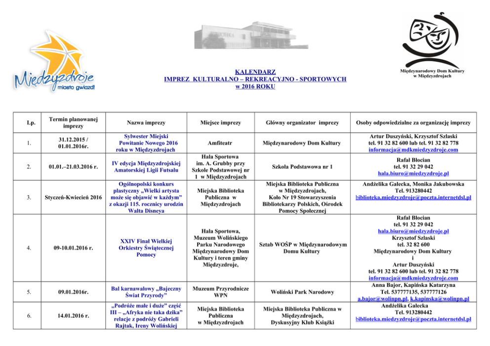 KALENDARZ IMPREZ KULTURALNO – REKREACYJNO - SPORTOWYCH w 2016 ROKU Lp. 1. 2. 3. Termin planowanej imprezy Nazwa imprezy Miejsce imprezy Główny organizator imprezy Osoby odpowiedzialne za organizację imprezy 31.12.2015 / 01.01.2016r. Sylwester Miejski Powitanie Nowego 2016 roku w Międzyzdrojach Amfiteatr Międzynarodowy Dom Kultury Artur Duszyński, Krzysztof Szlaski tel. 91 32 82 600 lub tel. 91 32 82 778 [email protected] 01.01.–21.03.2016 r. IV edycja Międzyzdrojskiej Amatorskiej Ligii Futsalu Hala Sportowa im. A. Grubby przy Szkole Podstawowej nr 1 w Międzyzdrojach Szkoła Podstawowa nr 1 Rafał Błocian tel. 91 32 29 042 [email protected] Styczeń-Kwiecień 2016 Ogólnopolski konkurs plastyczny „Wielki artysta może się objawić w każdym” z okazji 115. rocznicy urodzin Walta Disneya Miejska Biblioteka Publiczna w Międzyzdrojach Miejska Biblioteka Publiczna w Międzyzdrojach, Koło Nr 19 Stowarzyszenia Bibliotekarzy Polskich, Ośrodek Pomocy Społecznej 4. 09-10.01.2016 r. XXIV Finał Wielkiej Orkiestry Świątecznej Pomocy Hala Sportowa, Muzeum Wolińskiego Parku Narodowego Międzynarodowy Dom Kultury i teren gminy Międzyzdroje, 5. 09.01.2016r. Bal karnawałowy „Bajeczny Świat Przyrody” Muzeum Przyrodnicze WPN Woliński Park Narodowy 14.01.2016 r. „Podróże małe i duże” część III – „Afryka nie taka dzika” relacje z podróży Gabrieli Rajtak, Ireny Wolińskiej Miejska Biblioteka Publiczna w Międzyzdrojach Miejska Biblioteka Publiczna w Międzyzdrojach, Dyskusyjny Klub Książki 6. Sztab WOŚP w Międzynarodowym Domu Kultury Andżelika Gałecka, Monika Jakubowska Tel. 913280442 [email protected] Rafał Błocian tel. 91 32 29 042 [email protected] Krzysztof Szlaski tel. 32 82 600 Międzynarodowy Dom Kultury i Artur Duszyński tel. 91 32 82 600 lub tel. 91 32 82 778 [email protected] Anna Bajor, Kapińska Katarzyna Tel. 537777135, 537777126 [email protected], [email protected] Andżelika Gałecka Tel. 913280442 [email protected] i Dariusza Felisiaka Miejska Biblioteka Publiczna w Międzyzdrojach, Miejska Biblioteka Publiczna w Międzyzdrojach, Monika Jakubowska Tel. 913280442 [email protected] 7. 21.01.2016 r. „Wspomnień czar” część III 8. 23.01.2016 r. „Hej kolęda, kolęda” Przegląd kolęd i pastorałek Międzynarodowy Dom Kultury Międzynarodowy Dom Kultury Artur Duszyński, Krzysztof Szlaski tel. 91 32 82 600 lub tel. 91 32 82 778 [email protected] 9. 27.01.2016 r. Międzyzdrojskie Herody Międzynarodowy Dom Kultury Międzynarodowy Dom Kultury Artur Duszyński, Krzysztof Szlaski tel. 91 32 82 600 lub tel. 91 32 82 778 [email protected] 01.02 - 14.02.2016 r. Ferie zimowe w MDK Interdyscyplinarne spotkania z kulturą, sztuką i rozrywką, zgodnie z programem ferii zimowych Międzynarodowy Dom Kultury Międzynarodowy Dom Kultury, Ośrodek Pomocy Społecznej i placówki oświatowe Elżbieta Jakubiak - OPS Artur Duszyński- MDK tel. 91 32 82 600 lub 91 32 82 778 [email protected] 11. 01.02 - 14.02.2016 r. „Kreatywna pracownia plastyczna” – ferie zimowe w bibliotece Miejska Biblioteka Publiczna w Międzyzdrojach Miejska Biblioteka Publiczna w Międzyzdrojach, Ośrodek Pomocy Społecznej 12. 27.02.2016 r. IV Gala Sportu Międzynarodowy Dom Kultury UM Międzyzdroje 13. 28.02.2016 r. Ogólnopolski Bieg „Tropem Wilczym” – Bieg Pamięci Żołnierzy Wyklętych Promenada Międzyzdroje Hufiec ZHP Ziemi Wolińskiej Tomasz Rychłowski Tel. 691262432 [email protected] 28.02. 2016r. V Memoriał zawodnika Daniela Muchy – Halowy Turniej Piłki Nożnej w roczniku 2003 Hala Sportowa im. A. Grubby przy Szkole Podstawowej nr 1 w Międzyzdrojach KS Fala Jan Rączewski tel. 696 091 828 [email protected] 10. 14. 15. 16. marzec 2016 Warsztaty plastyczne „Fabryka pisanek…” Miejska Biblioteka Publiczna w Międzyzdrojach, Wiklina w Wapnicy 08.03.2016 r. Dzień Kobiet W programie m.in.: Występ „Teatru rodzinnego” oraz Koncert zespołu Backstage Acoustic Międzynarodowy Dom Kultury Miejska Biblioteka Publiczna w Międzyzdrojach, Ośrodek Pomocy Społecznej, Międzyzdrojskie Stowarzyszenie Rodzina Międzynarodowy Dom Kultury Elżbieta Jakubiak i Małgorzata Musialska – OPS Andżelika Gałecka tel. 91 32 80 442 [email protected] Jadwiga Bober Tel. 32 75 668 [email protected] Elżbieta Jakubiak i Małgorzata Musialska – OPS Andżelika Gałecka Tel. 913280442 [email protected] Monika Ratajczyk – Międzyzdrojskie Stowarzyszenie Rodzina Artur Duszyński, Krzysztof Szlaski tel. 91 32 82 600 lub tel. 91 32 82 778 [email protected] Monika Ratajczyk tel. 509179323, Iwona Samołyk, [email protected] Artur Duszyński, Krzysztof Szlaski tel. 91 32 82 600 lub tel. 91 32 82 778 [email protected] Elżbieta Jakubiak i Małgorzata Musialska – OPS Andżelika Gałecka Tel. 913280442 [email protected] Artur Duszyński, Krzysztof Szlaski tel. 91 32 82 600 lub tel. 91 32 82 778 [email protected] Elżbieta Jakubiak i Małgorzata Musialska – OPS Andżelika Gałecka Tel. 913280442 [email protected] 17. 08.03.2016 r. Dzień Kobiet Wiklina w Wapnicy Międzyzdrojskie Stowarzyszenie „Rodzina” 18. 10.03.2016 r. Przedstawienie Teatralne „Dwie połówki pomarańczy” Międzynarodowy Dom Kultury Międzynarodowy Dom Kultury Agencja Artystyczna Diabeł 19. 11.03.2016 Spotkanie autorskie dla dzieci z Grzegorzem Kasdepke w międzyzdrojskiej bibliotece Miejska Biblioteka Publiczna w Międzyzdrojach Miejska Biblioteka Publiczna w Międzyzdrojach, Ośrodek Pomocy Społecznej, Szkoły Podstawowe 20. 19.03.2016 r. Kiermasz Świąteczny Święto Wiosny Międzynarodowy Dom Kultury Międzynarodowy Dom Kultury Stowarzyszenie Archeozdroje Kwiecień 2016 2 spotkania autorskie dla dzieci z Wojciechem Widłakiem Miejska Biblioteka Publiczna w Międzyzdrojach Miejska Biblioteka Publiczna w Międzyzdrojach, Ośrodek Pomocy Społecznej, Szkoły Podstawowe 22. 03.04.2016 r. Sportowy Turniej brydża sportowego - parami pod honorowym Patronatem Burmistrza Międzyzdrojów Między