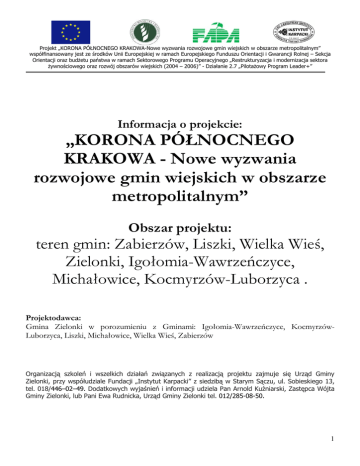 Projekt „KORONA PÓŁNOCNEGO KRAKOWA-Nowe wyzwania rozwojowe gmin wiejskich w obszarze metropolitalnym” współfinansowany jest ze środków Unii Europejskiej w ramach Europejskiego Funduszu Orientacji i Gwarancji Rolnej – Sekcja Orientacji oraz budżetu państwa w ramach Sektorowego Programu Operacyjnego „Restrukturyzacja i modernizacja sektora żywnościowego oraz rozwój obszarów wiejskich (2004 – 2006)” - Działanie 2.7 „Pilotażowy Program Leader+” Informacja o projekcie: „KORONA PÓŁNOCNEGO KRAKOWA - Nowe wyzwania rozwojowe gmin wiejskich w obszarze metropolitalnym” Obszar projektu: teren gmin: Zabierzów, Liszki, Wielka Wieś, Zielonki, Igołomia-Wawrzeńczyce, Michałowice, Kocmyrzów-Luborzyca . Projektodawca: Gmina Zielonki w porozumieniu z Gminami: Igołomia-Wawrzeńczyce, KocmyrzówLuborzyca, Liszki, Michałowice, Wielka Wieś, Zabierzów Organizacją szkoleń i wszelkich działań związanych z realizacją projektu zajmuje się Urząd Gminy Zielonki, przy współudziale Fundacji „Instytut Karpacki” z siedzibą w Starym Sączu, ul. Sobieskiego 13, tel. 018/446–02–49. Dodatkowych wyjaśnień i informacji udziela Pan Arnold Kuźniarski, Zastępca Wójta Gminy Zielonki, lub Pani Ewa Rudnicka, Urząd Gminy Zielonki tel. 012/285-08-50. 1 Projekt „KORONA PÓŁNOCNEGO KRAKOWA-Nowe wyzwania rozwojowe gmin wiejskich w obszarze metropolitalnym” współfinansowany jest ze środków Unii Europejskiej w ramach Europejskiego Funduszu Orientacji i Gwarancji Rolnej – Sekcja Orientacji oraz budżetu państwa w ramach Sektorowego Programu Operacyjnego „Restrukturyzacja i modernizacja sektora żywnościowego oraz rozwój obszarów wiejskich (2004 – 2006)” - Działanie 2.7 „Pilotażowy Program Leader+” Projekt „KORONA PÓŁNOCNEGO KRAKOWA - Nowe wyzwania rozwojowe gmin wiejskich w obszarze metropolitalnym” współfinansowany jest ze środków Unii Europejskiej w ramach Europejskiego Funduszu Orientacji i Gwarancji Rolnej – Sekcja Orientacji oraz budżetu państwa w ramach Sektorowego Programu Operacyjnego „Restrukturyzacja i modernizacja sektora żywnościowego oraz rozwój obszarów wiejskich (2004 – 2006)” – Priorytetu 2 – Zrównoważony rozwój obszarów wiejskich - Działania 2.7 „Pilotażowy Program Leader+” Informacja o projekcie Finansowanie Wkład Sekcji Orientacji EFOiGR (Europejskiego Funduszu Orientacji i Gwarancji Rolnej) – do 80% całkowitego kwalifikującego się kosztu projektu; 20% – współfinansowanie z budżetu państwa. Cele programu Realizacja programu ma na celu stymulowanie lokalnych inicjatyw na rzecz rozwoju obszarów wiejskich – tworzenie Zintegrowanych Strategii Rozwoju Obszarów Wiejskich (ZSROW), budowanie Lokalnych Grup Działania (LGD) oraz podejmowanie przez nie działań na rzecz rozwoju i promocji regionu. „Pilotażowy Program Leader+” sprzyjać będzie lepszemu wykorzystaniu potencjału rozwojowego terenów wiejskich, poprawie ich konkurencyjności jako miejsca aktywizacji oraz współpracy lokalnych środowisk. „Pilotażowy Program Leader+” wdrażany będzie w ramach dwóch, następujących po sobie schematów (Schemat I i Schemat II), z których pierwszy przygotowuje uruchomienie drugiego. Szczegółowe cele programu dla Schematu I: 1) wsparcie przygotowania strategii rozwoju obszarów wiejskich (ZSROW); 2) wsparcie procesu tworzenia LGD; 3) promocja obszarów wiejskich; 4) mobilizacja ludności do wzięcia aktywnego udziału w procesie rozwoju obszarów wiejskich. Szczegółowe cele programu dla Schematu II: 1) wsparcie działalności LGD na rzecz realizacji strategii; 2) promocja obszarów wiejskich; 3) mobilizacja ludności do wzięcia aktywnego udziału w procesie rozwoju obszarów wiejskich; 4) upowszechnianie i wymiana informacji o inicjatywach związanych z aktywizacją ludności na obszarach wiejskich. 2 Projekt „KORONA PÓŁNOCNEGO KRAKOWA-Nowe wyzwania rozwojowe gmin wiejskich w obszarze metropolitalnym” współfinansowany jest ze środków Unii Europejskiej w ramach Europejskiego Funduszu Orientacji i Gwarancji Rolnej – Sekcja Orientacji oraz budżetu państwa w ramach Sektorowego Programu Operacyjnego „Restrukturyzacja i modernizacja sektora żywnościowego oraz rozwój obszarów wiejskich (2004 – 2006)” - Działanie 2.7 „Pilotażowy Program Leader+” Opis programu „Pilotażowy Program Leader+” ma na celu pobudzenie aktywności środowisk lokalnych i ich zaangażowanie w tworzenie oraz realizacji lokalnych strategii rozwoju obszarów wiejskich. Celem Schematu I jest tworzenie LGD oraz dokonanie, z inicjatywy środowisk lokalnych, analizy możliwości rozwojowych terenów wiejskich i opracowanie na tej podstawie ZSROW. W tym celu, w ramach Schematu I, realizowane będą działania szkoleniowe, informacyjne oraz doradcze, służące zaangażowaniu mieszkańców w proces przygotowywania koncepcji rozwoju obszarów wiejskich i tworzenia partnerstw publiczno-prywatnych. W ramach Schematu II LGD, posiadające odpowiednie doświadczenie i potencjał administracyjny, niezbędny dla zarządzania środkami publicznymi, wdrażać będą plany dotyczące realizacji strategii obejmujące promocję obszarów wiejskich i animowanie współpracy partnerów lokalnych. Schemat II pozwoli na realizację kompleksowych projektów o charakterze wielosektorowym, uwzględniających w szczególności rozwój turystyki, ochronę oraz promocję środowiska naturalnego, krajobrazu i zasobów historyczno – kulturowych, popularyzację i rozwój produkcji wyrobów regionalnych, a także działania szkoleniowe. ZSROW, przygotowywane z inicjatywy środowisk lokalnych w ramach Schematu I i wdrażane w ramach Schematu II, określać będą kierunki rozwoju objętych nimi obszarów. Strategie te powinny uwzględniać co najmniej jedno z następujących zagadnień: 1) zastosowanie nowych informacji know-how i nowych technologii w celu podniesienia konkurencyjności produktów i usług